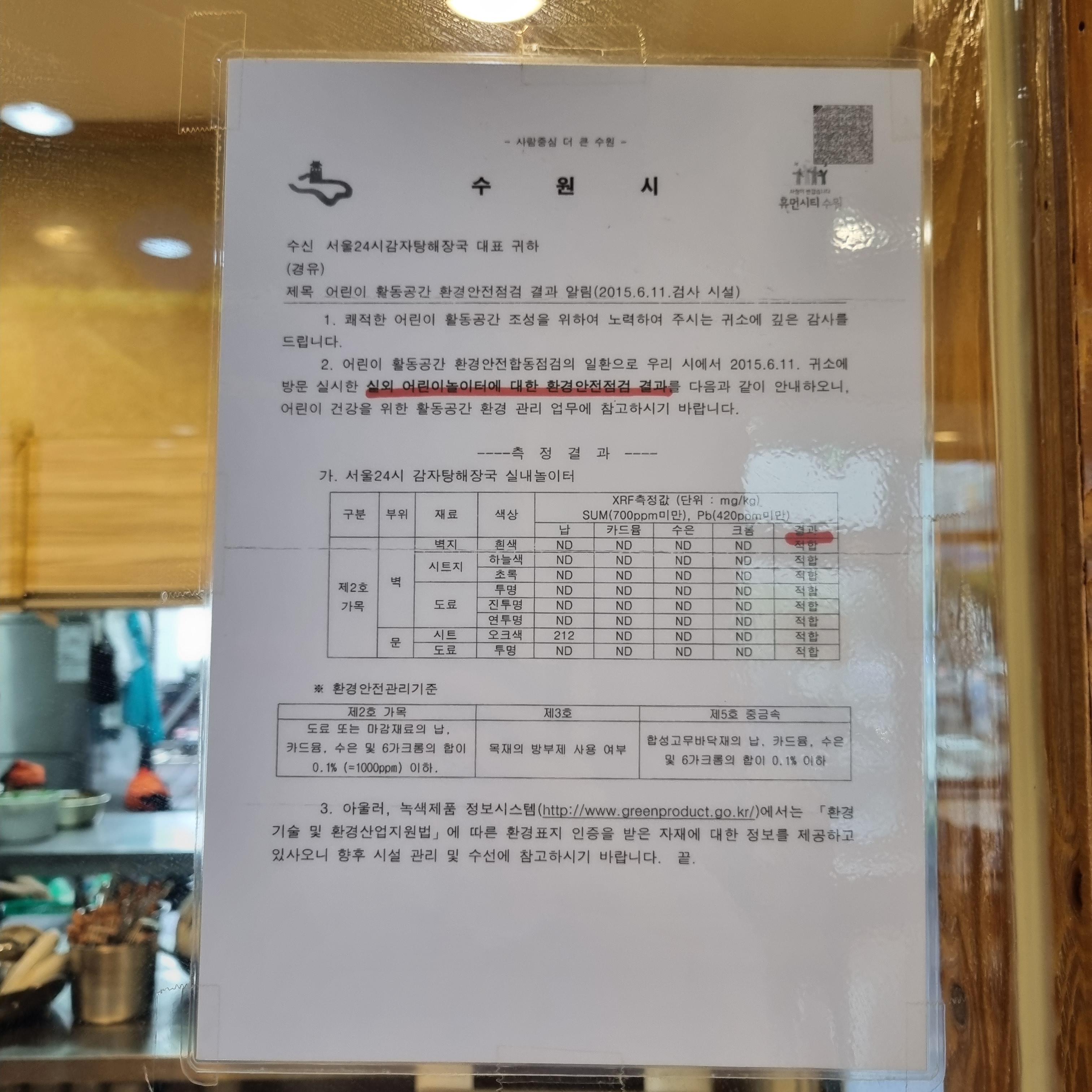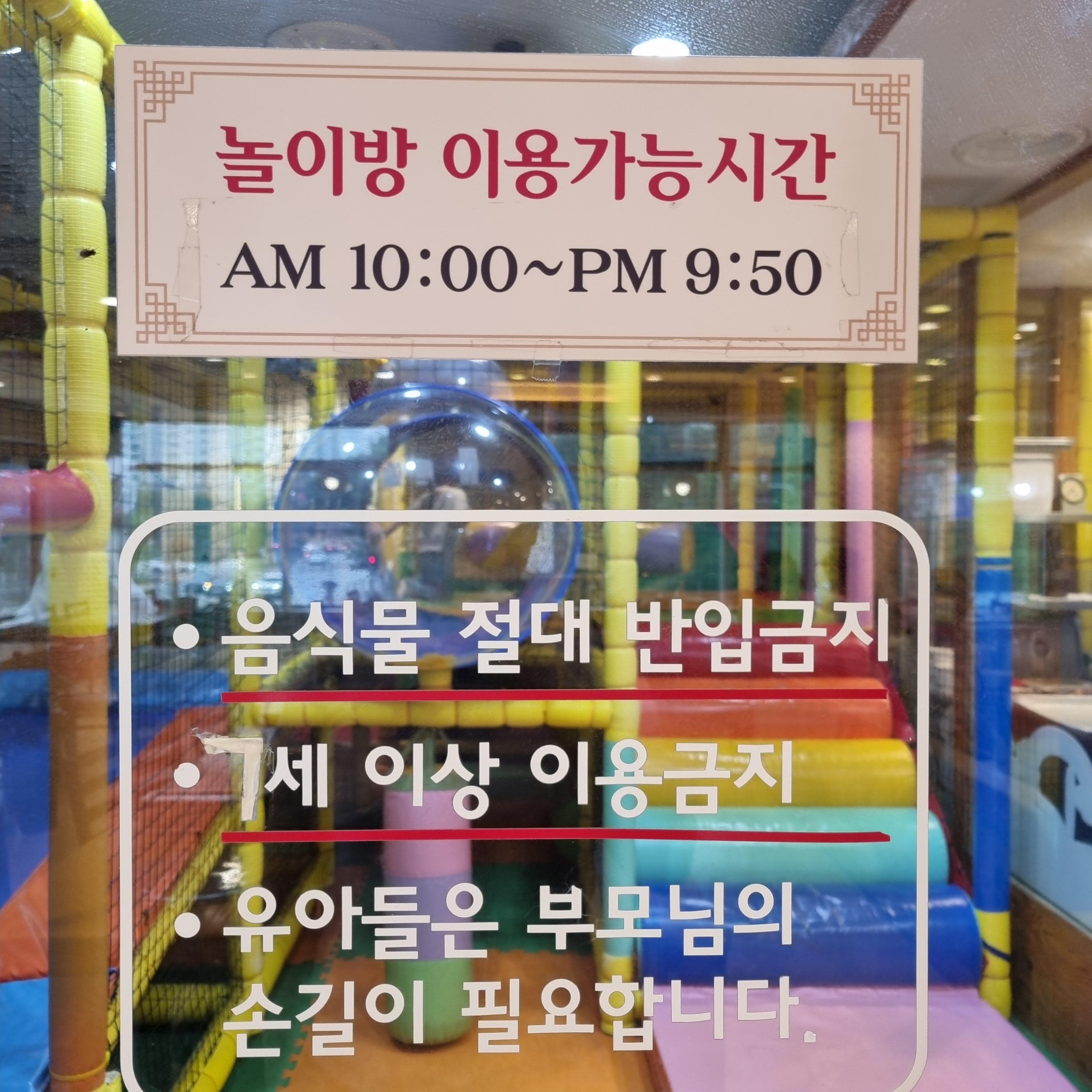 놀이방은 오전 10시부터 저녁 9시 50분까지 이용 가능합니다. 그리고 음식물을 들고 들어갈 수 없고 7세 이상 이용 금지입니다. 놀이방에서 신나게 놀고 식당에서는 조용히 해달라고 적혀있네요. 2015년에 어린이 활동공간 환경 안점점검 결과를 붙여두었습니다. 너무 오래된 거라 최신 data가 궁금해집니다.