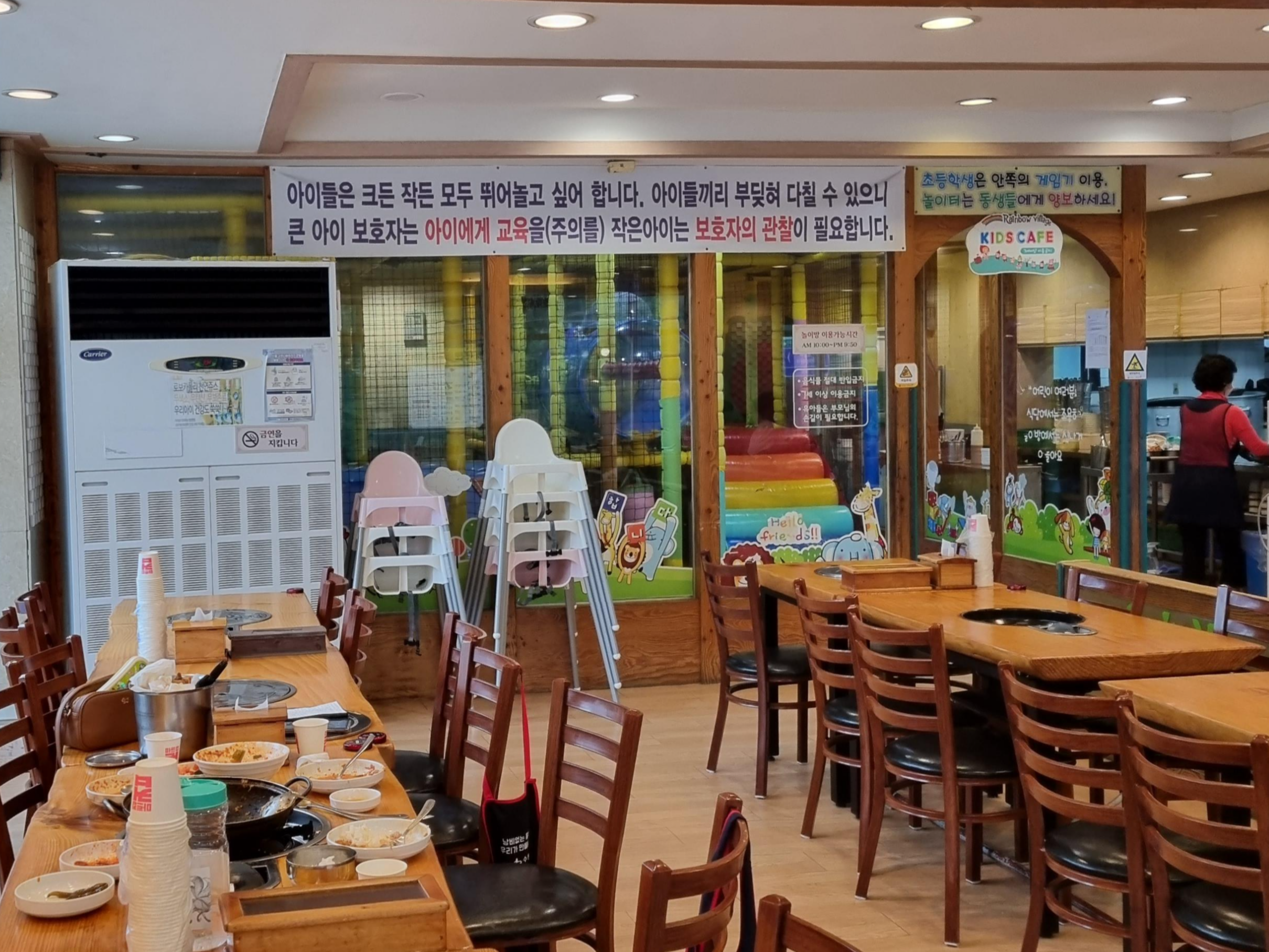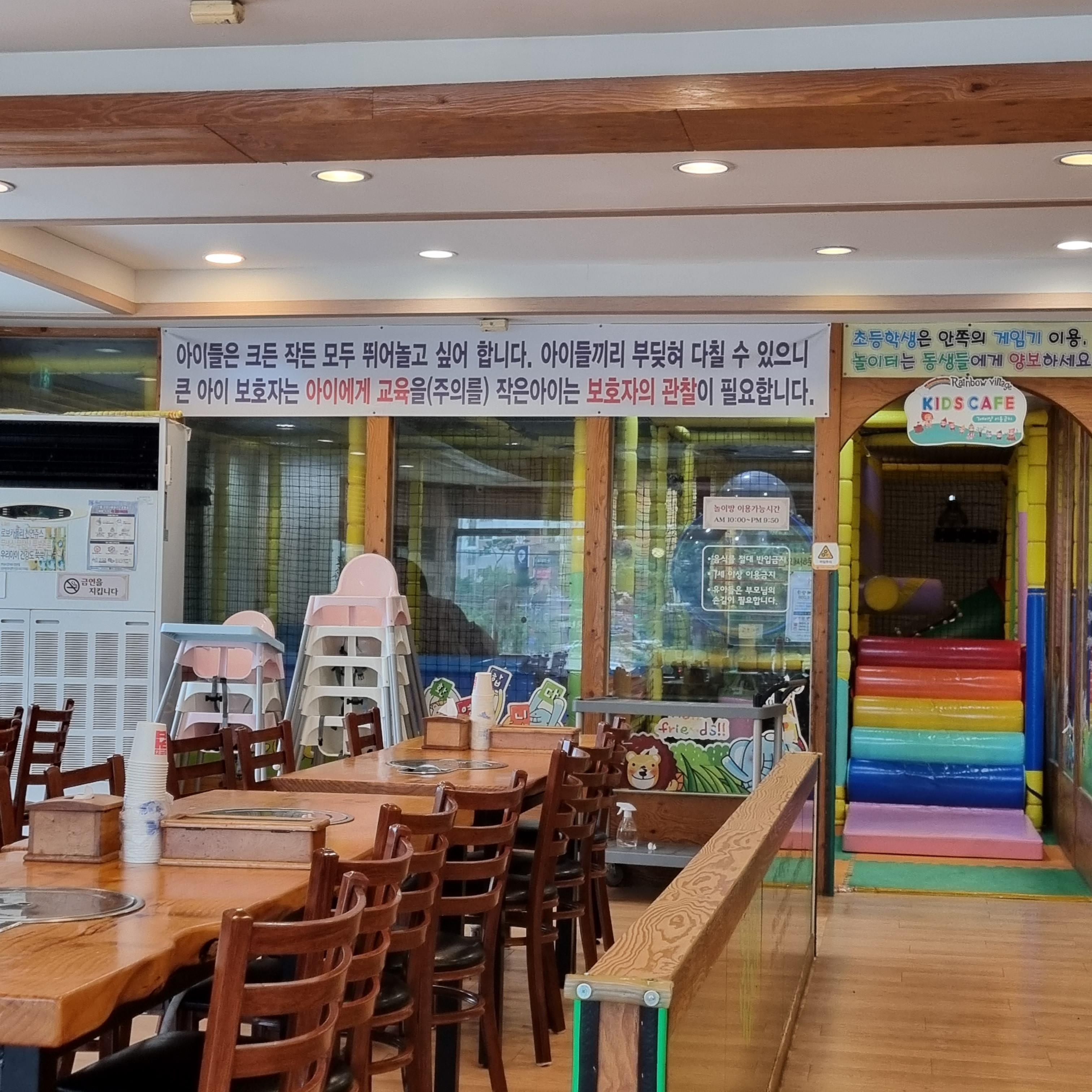 주방 옆에 놀이방이 있습니다. 키즈카페가 있는 식당답게 어린이 의자도 많이 구비하고 있답니다. 보통 아이들이 한 입 먹고 놀이방으로 갑니다. 놀이방과 테이블을 오가며 식사를 하곤 하네요.
