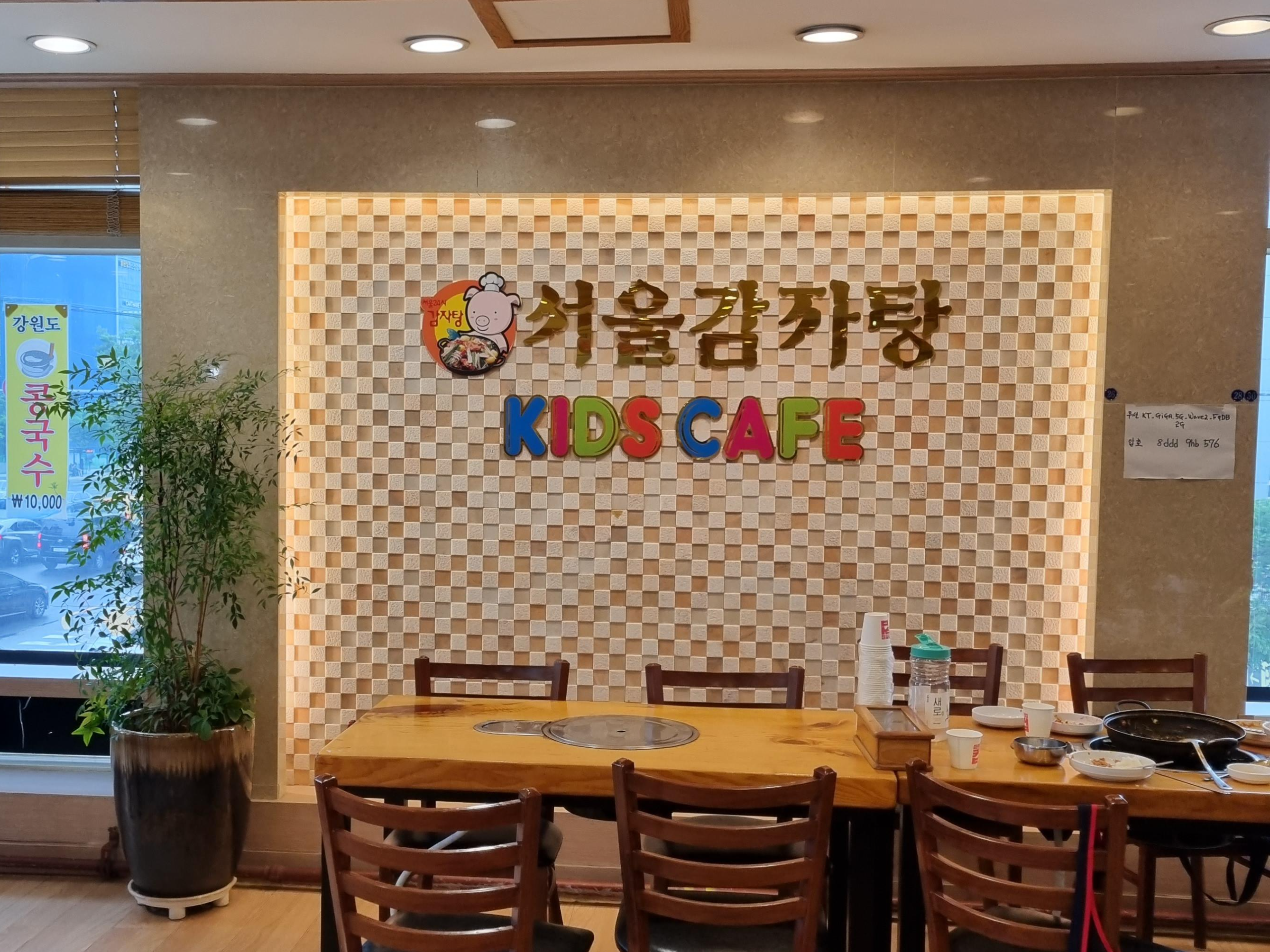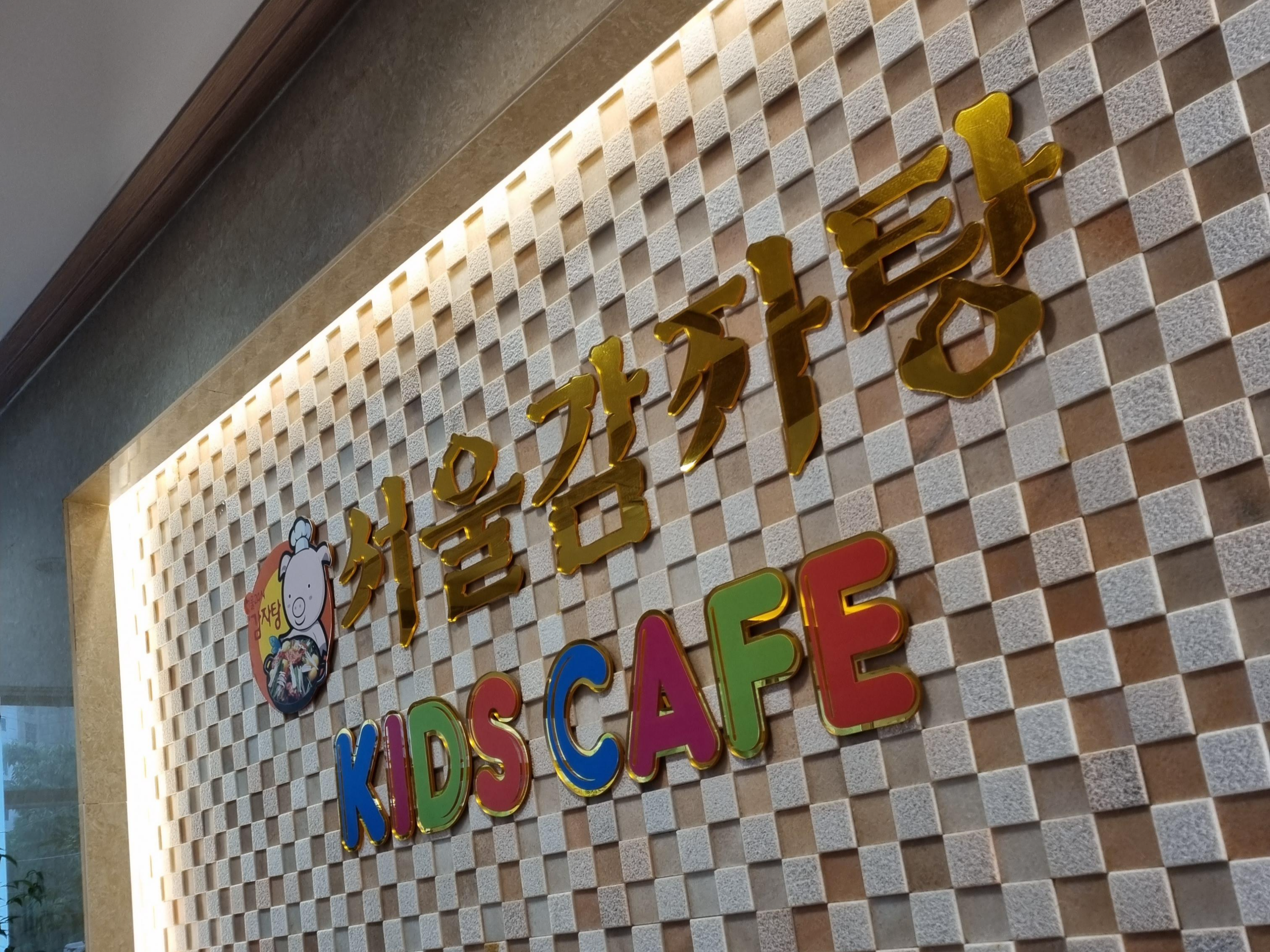 안쪽으로 들어오면 키즈카페가 있습니다. 서울감자탕 키즈카페라고 적혀있습니다. 아이들이 놀 수 있는 공간을 살펴볼까요?