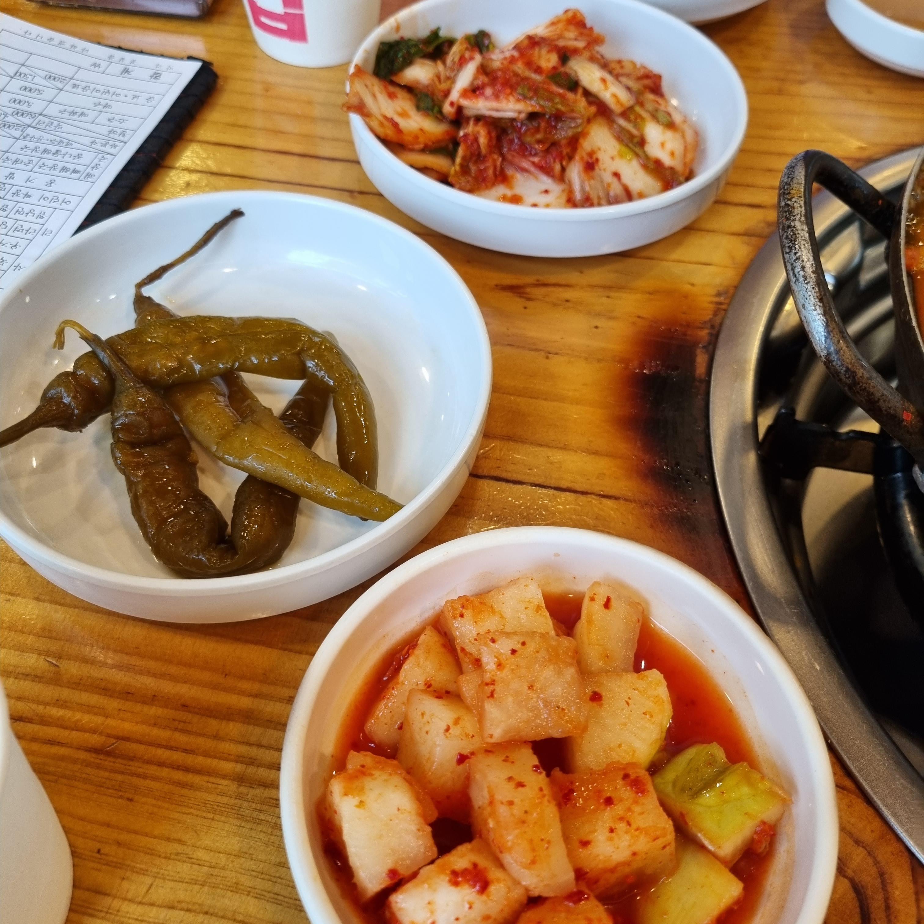 밑반찬으로 배추김치, 깍두기, 고추장아찌가 나오는데 배추김치는 단 맛이 매우 강합니다. 장아찌는 장아찌답게 짭조름하면서 시큼합니다.