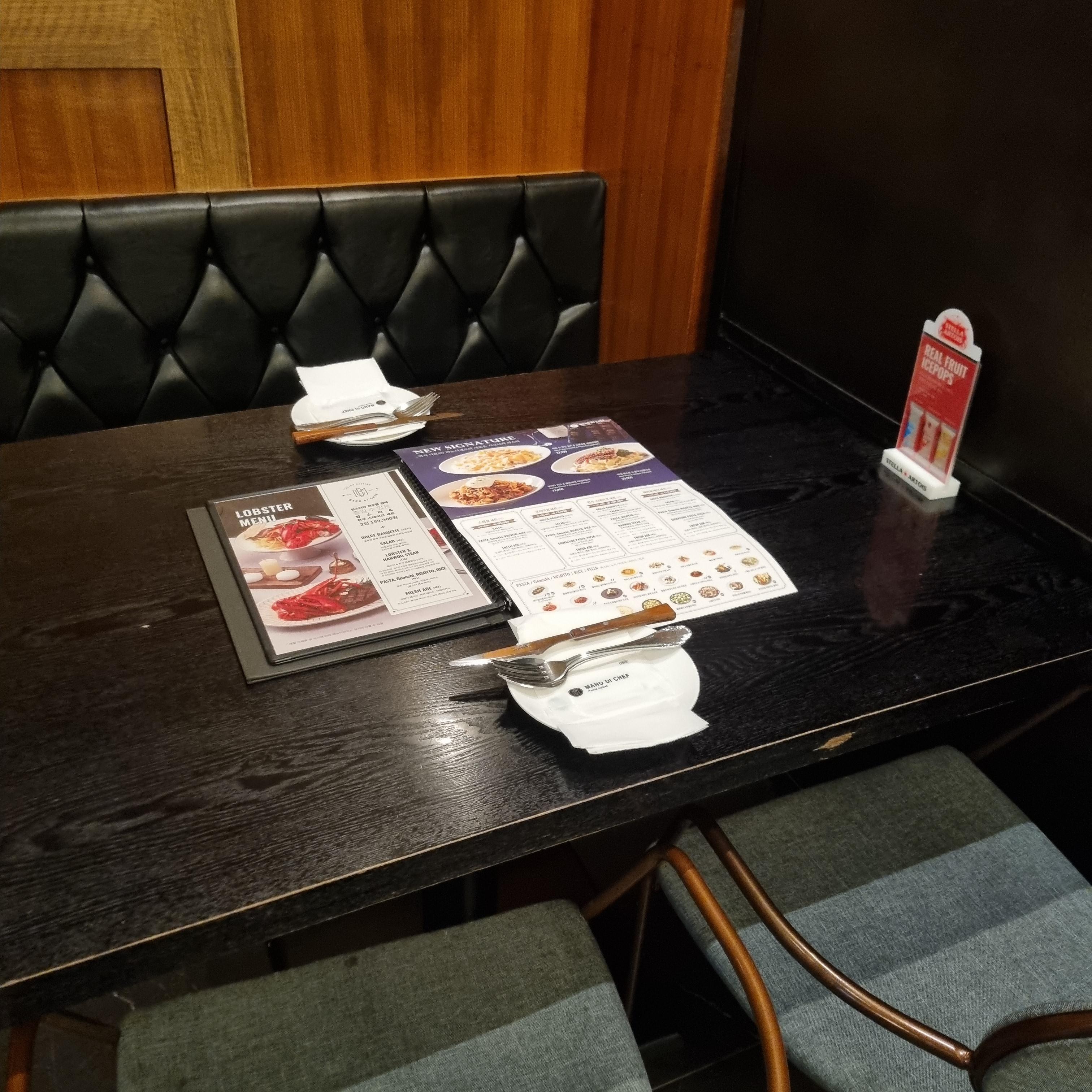 어떤 메뉴를 골라야 하는지 친절하게 한 장 짜리 세트메뉴판이 있고 상세한 메뉴판이 펼쳐져 있습니다. 마노디셰프 직원은 친절했습니다. 손님이 많지 않아서 그런지 분위기가 시끄럽지 않았고 식사하기 좋았습니다.