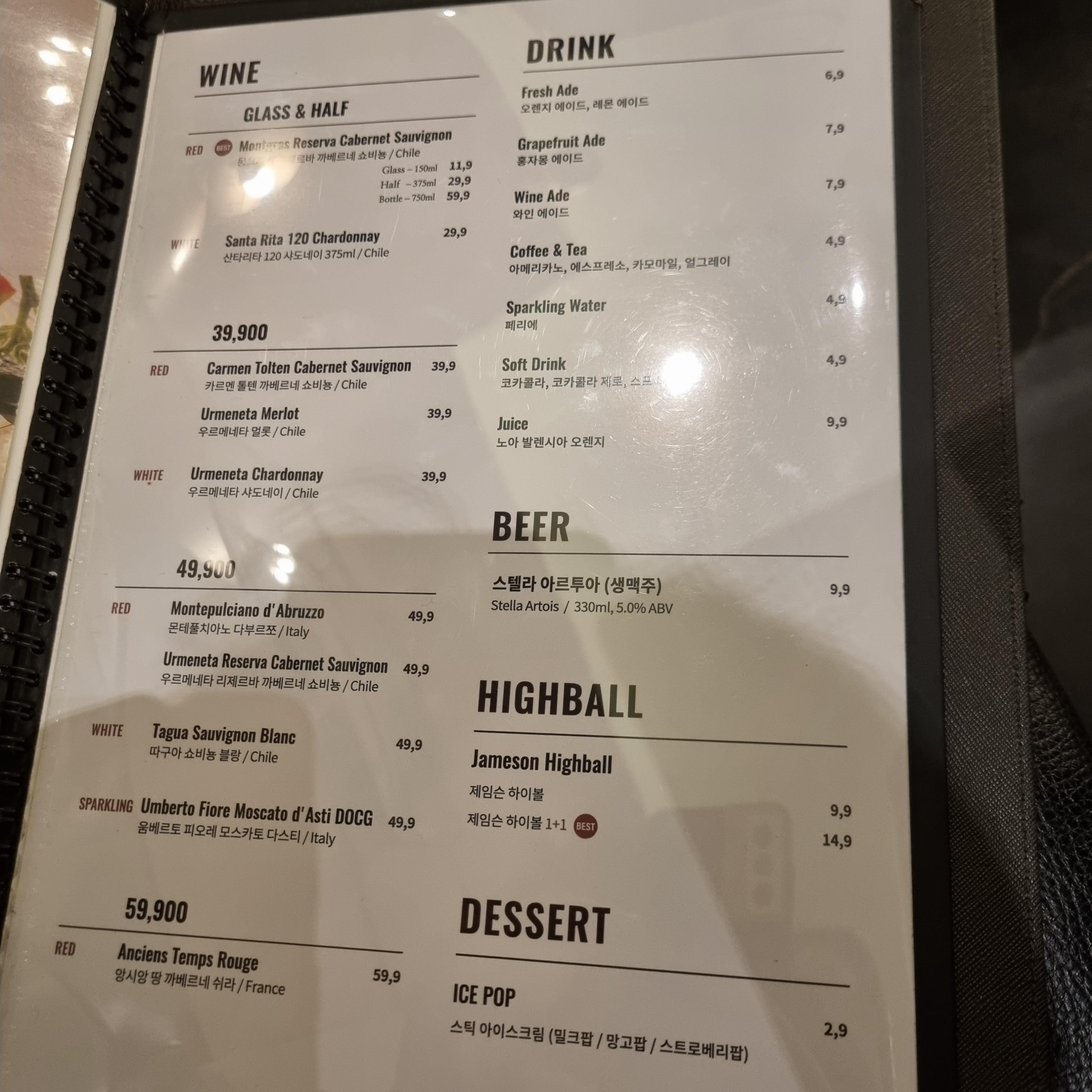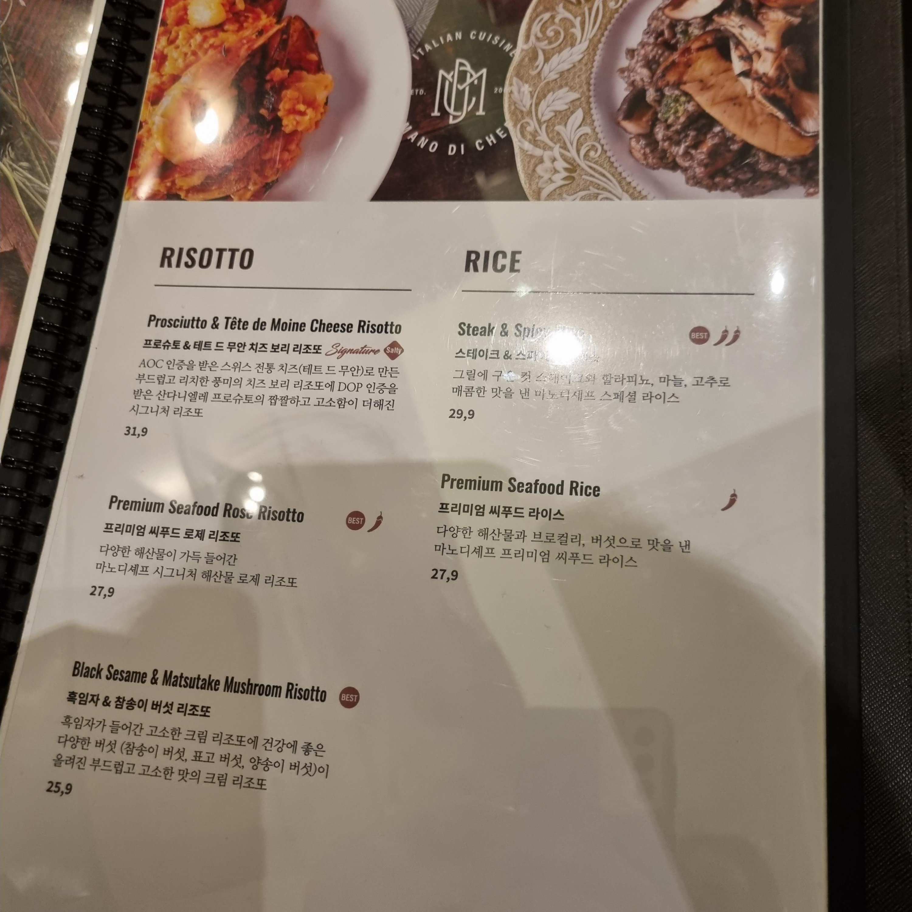 마노디셰프 메뉴판을 찍어보았습니다. 저는 세트메뉴를 시켰지만 상세메뉴 확인할 때 메뉴판도 참고했습니다. 맛있는 곳인 만큼 가격대는 있는 것으로 느껴졌습니다. 메뉴판 곳곳에 Best라고 표기되어 눈길을 한 번 더 사로잡았고, 고추 그림으로 맵기가 표시되어 있습니다.