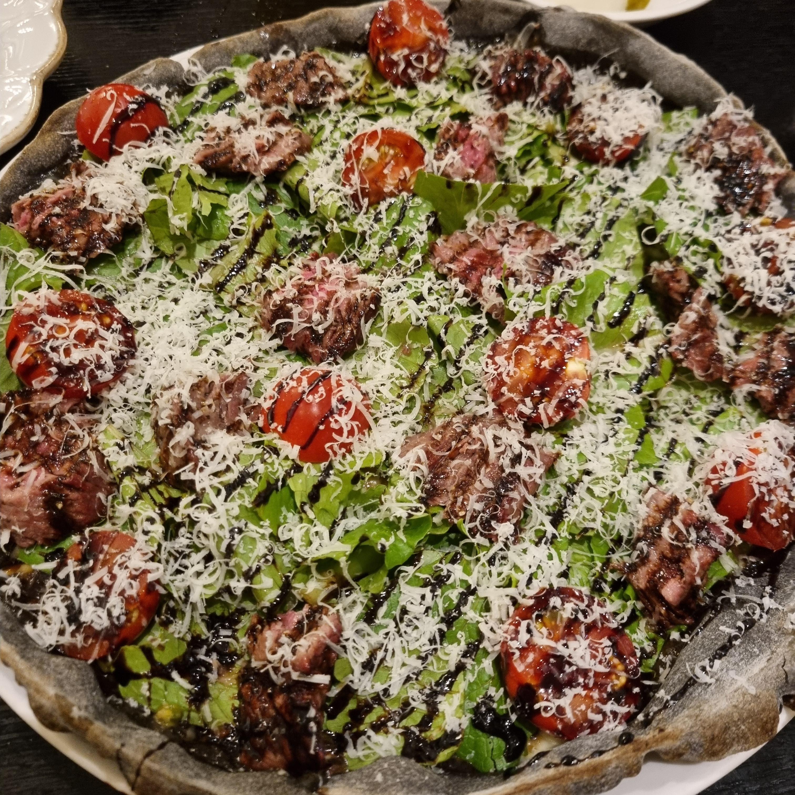 스테이크피자는 오징어 먹물이 들어갔는지 검은빛이 도는 도우에 신선한 야채와 발사믹 소스가 어우러졌습니다. 그 위에 스테이크와 방울토마토가 있었답니다. 아쉬운 점은 스테이크 고기에서 고기 냄새가 나긴 했습니다. 제가 예민해서 그랬을 수도 있지만요. 양이 많아서 나중에 싸달라고 요청하니 종이 박스에 예쁘게 담아주셨답니다.