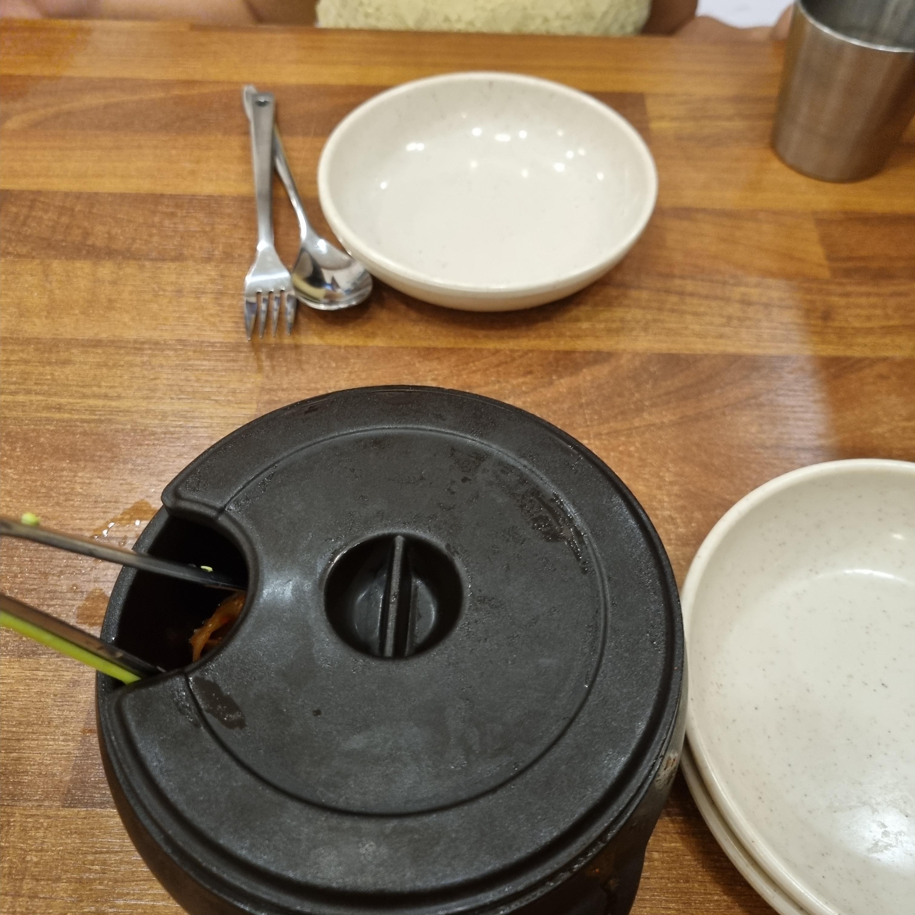 기본 찬은 배추김치예요. 마늘향이 정말 심합니다. 집에 와서 양치해도 없어지지 않아요. 김치 사진은 깜박하고 찍지 못했어요. 덜어서 먹도록 집게랑 같이 가져다줍니다.