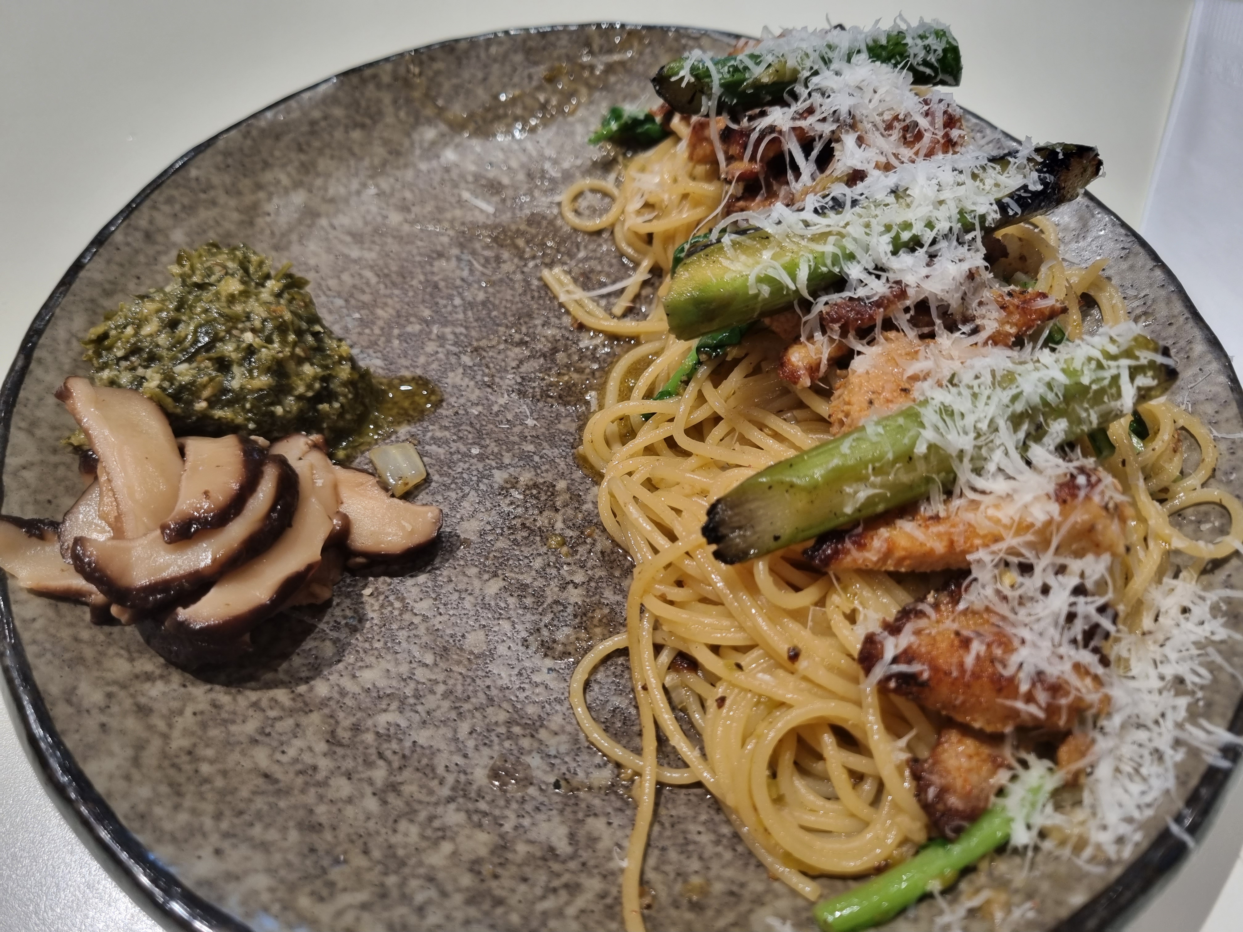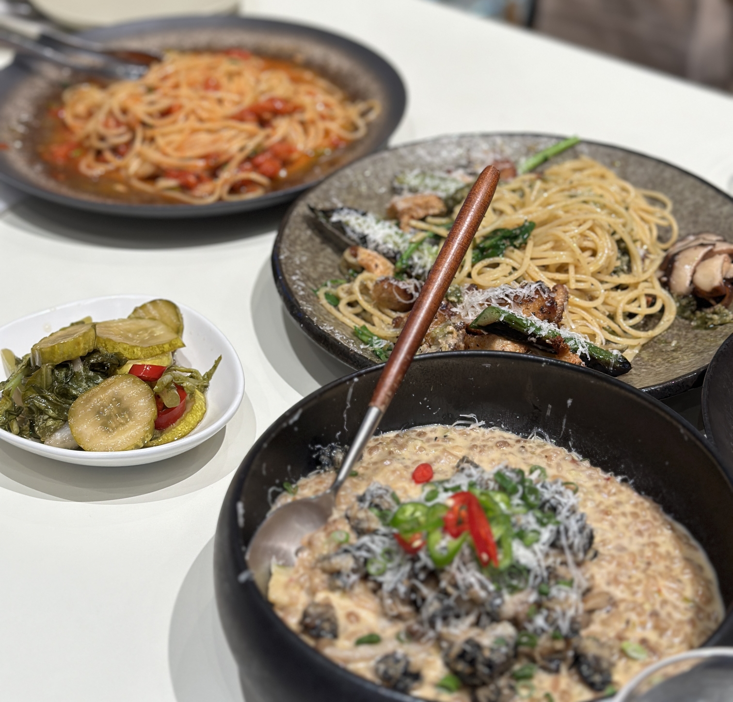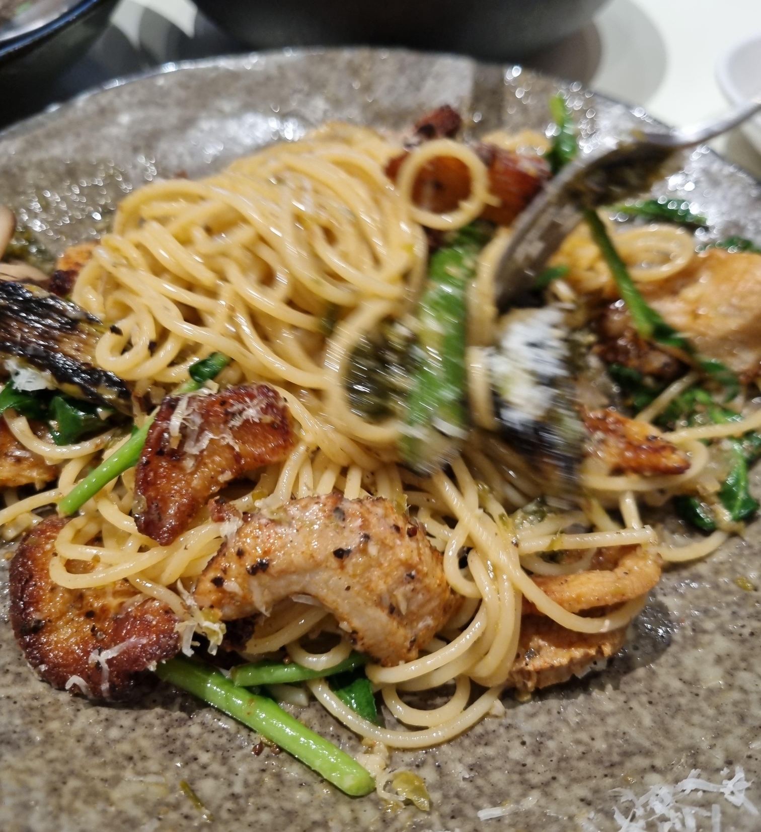 접시가 비어보이는 건 저만 그런 건 아니겠죠? 왼쪽에 표고버섯 옆에 있는 건 명이페스토래요. 명이페스토로 맛을 내고 항정살, 표고버섯 장아찌를 올린 파스타입니다.