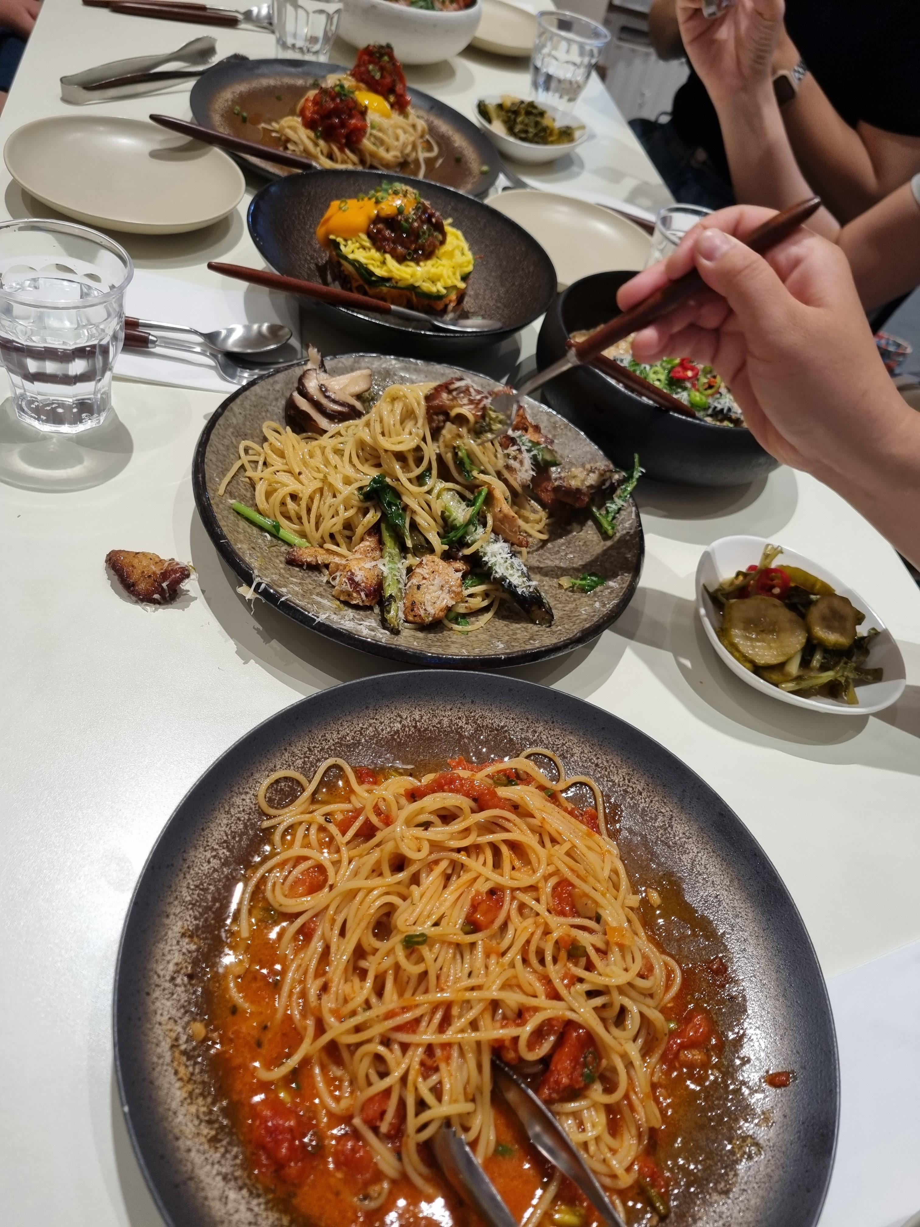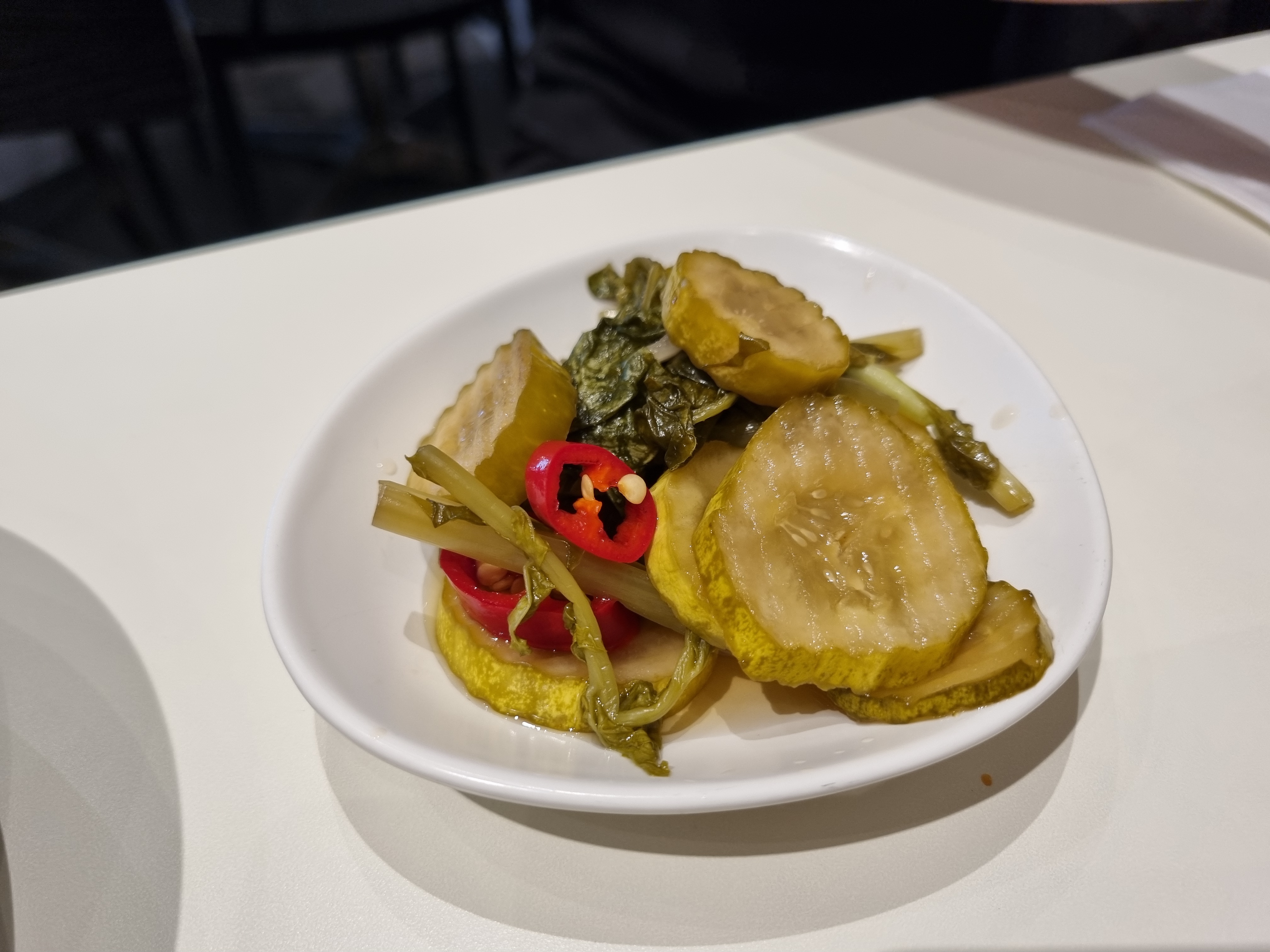 명이페스토도 열심히 섞어서 먹습니다. 고기는 진리입니다. 기본찬은 오이와 여러 야채가 있는 피클입니다. 느끼할 수 있는 퓨전한식이라 잘 어울린다는 느낌을 받았답니다.