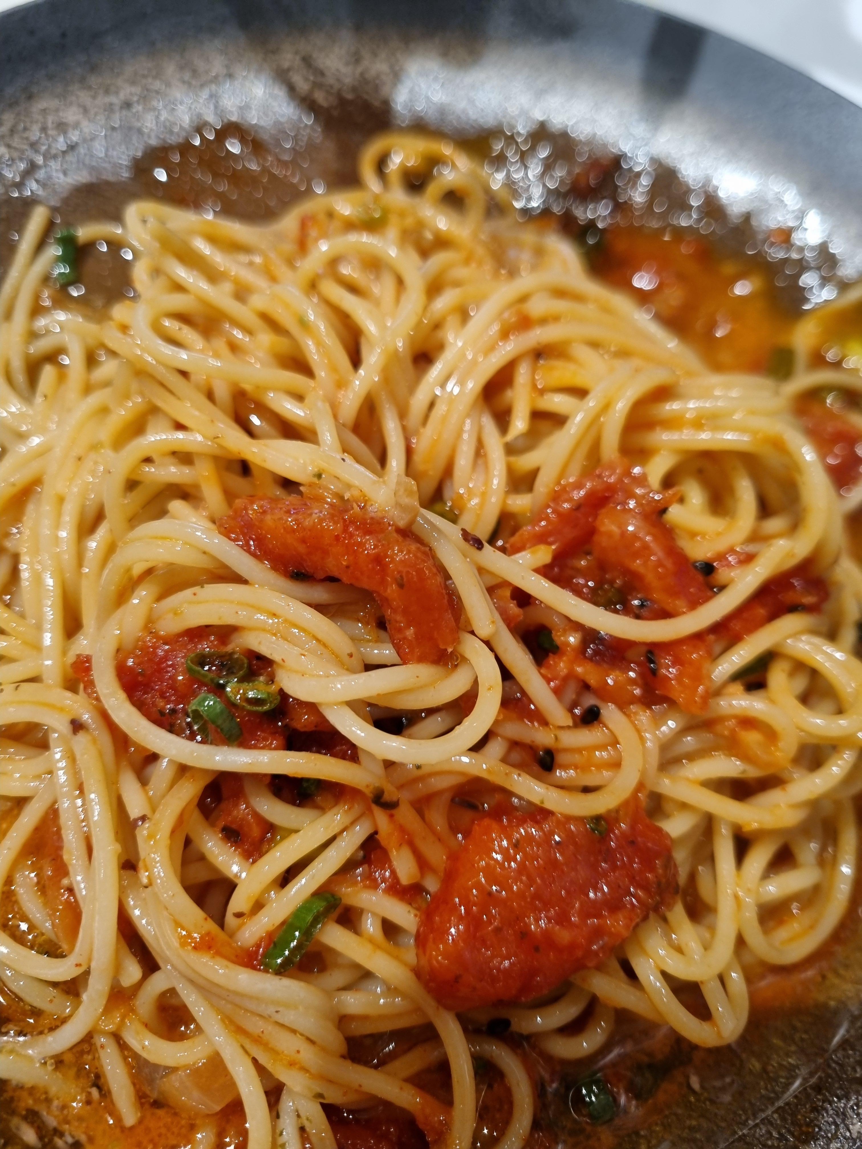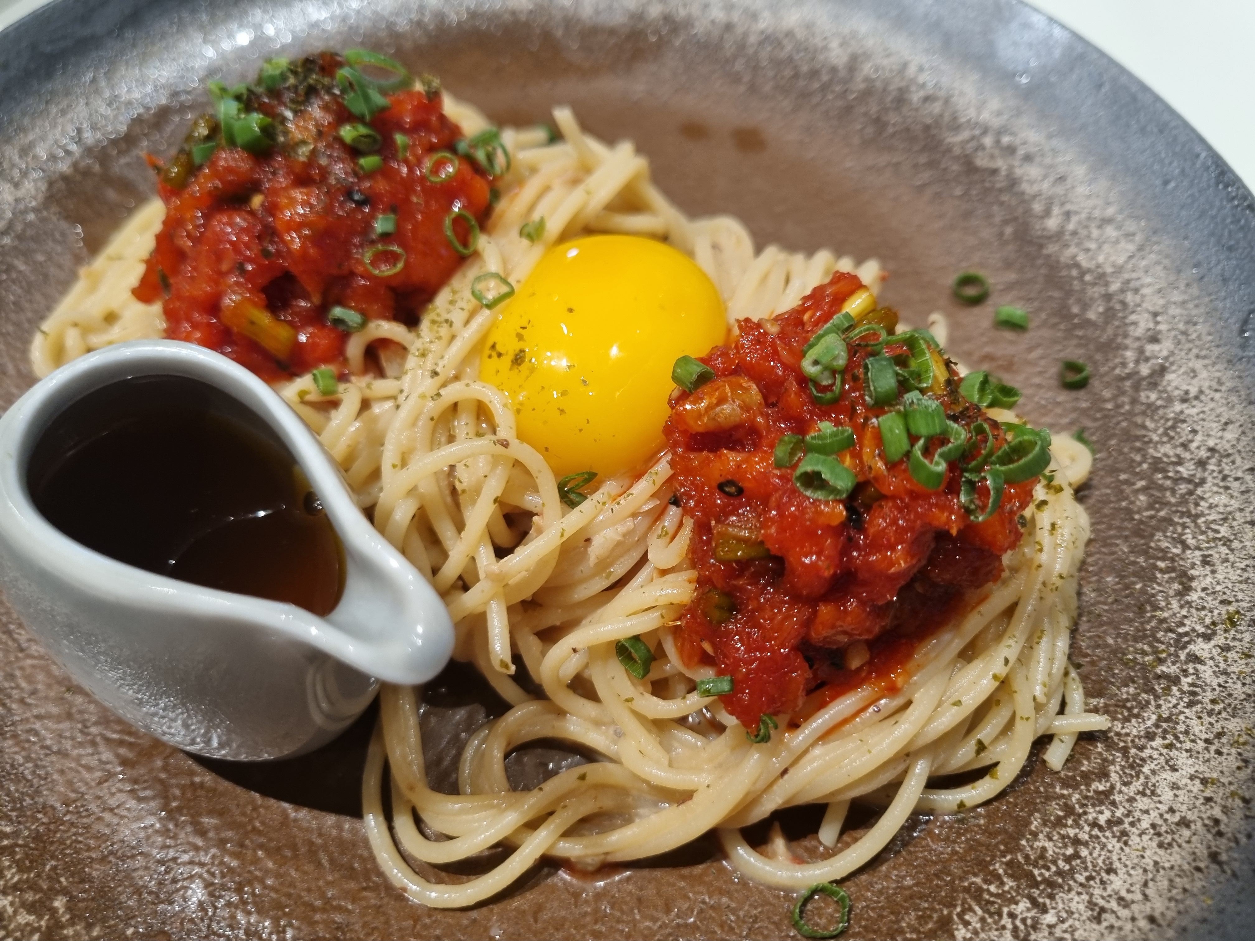 마늘콩으로 만든 소스에 직접 짠 고소한 들기름과 명태회를 비벼 먹는 차가운 파스타.