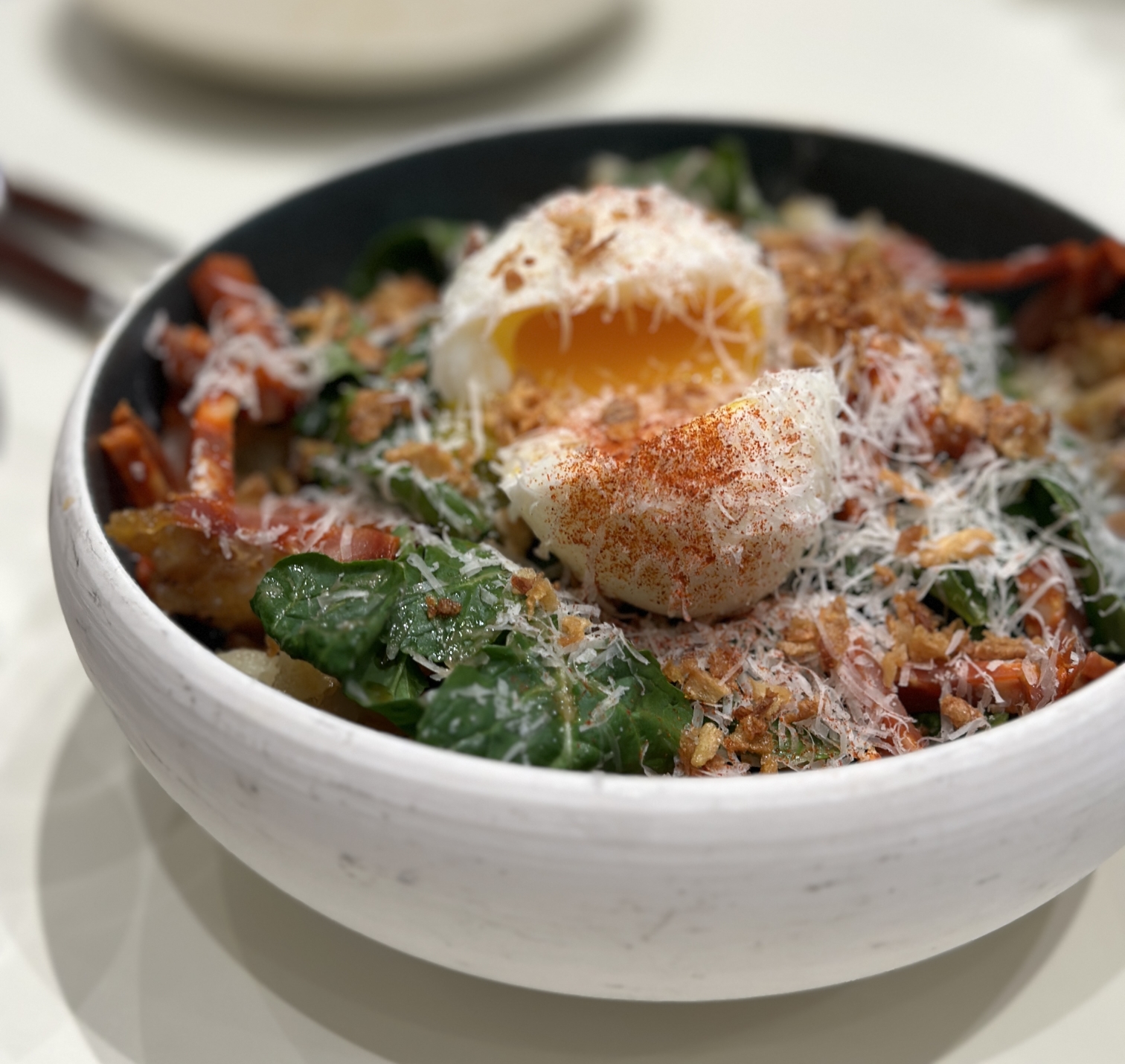 어슬만의 해석으로 만든 감자전에 초리조와 반숙란이 올라간 요리, 어슬청담 감자전 드셔보세요.