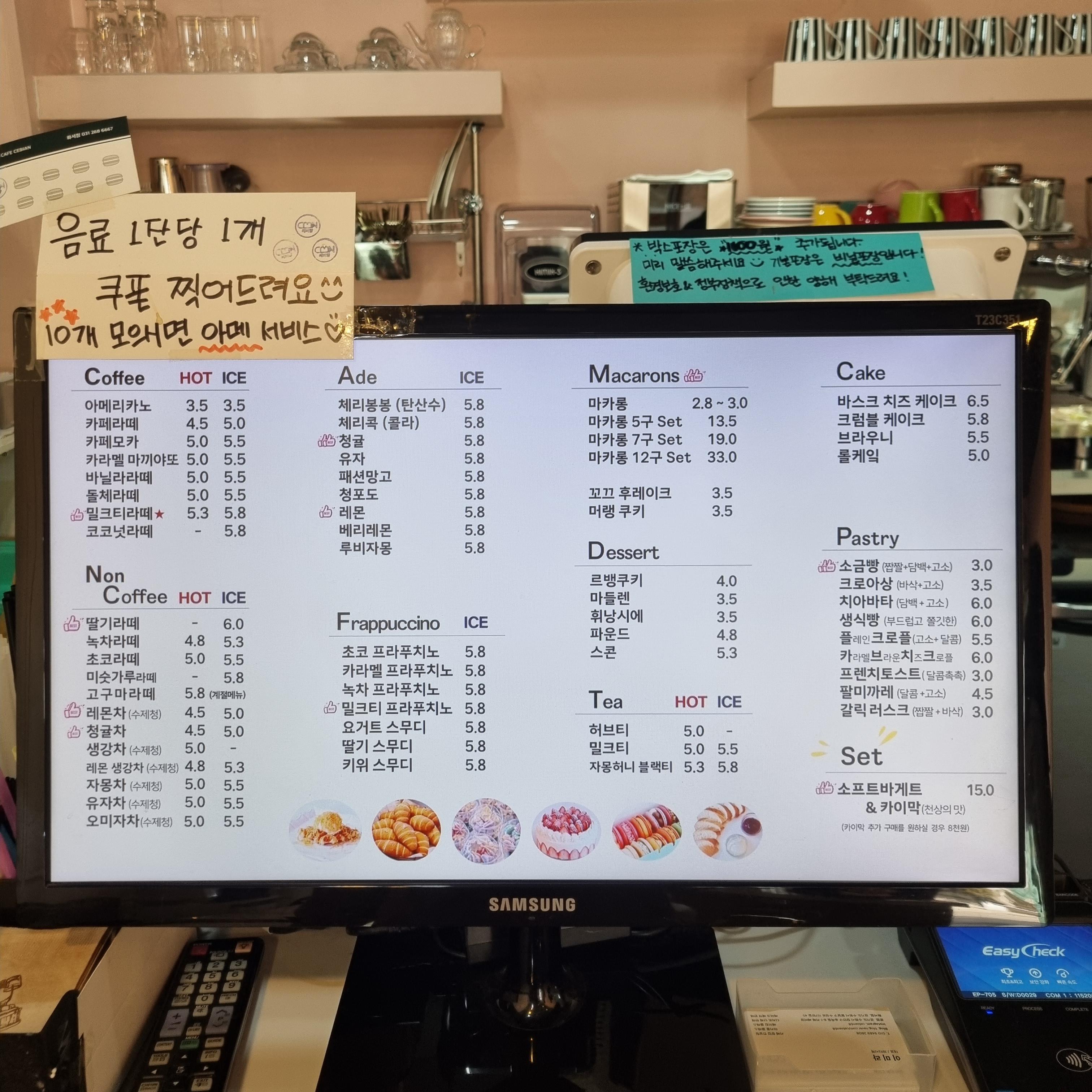 카운터에 음료 메뉴판이  있어요. 음료 1잔당 쿠포도 찍어주고 10개 모으면 아메리카노 1잔이 서비스네요.
