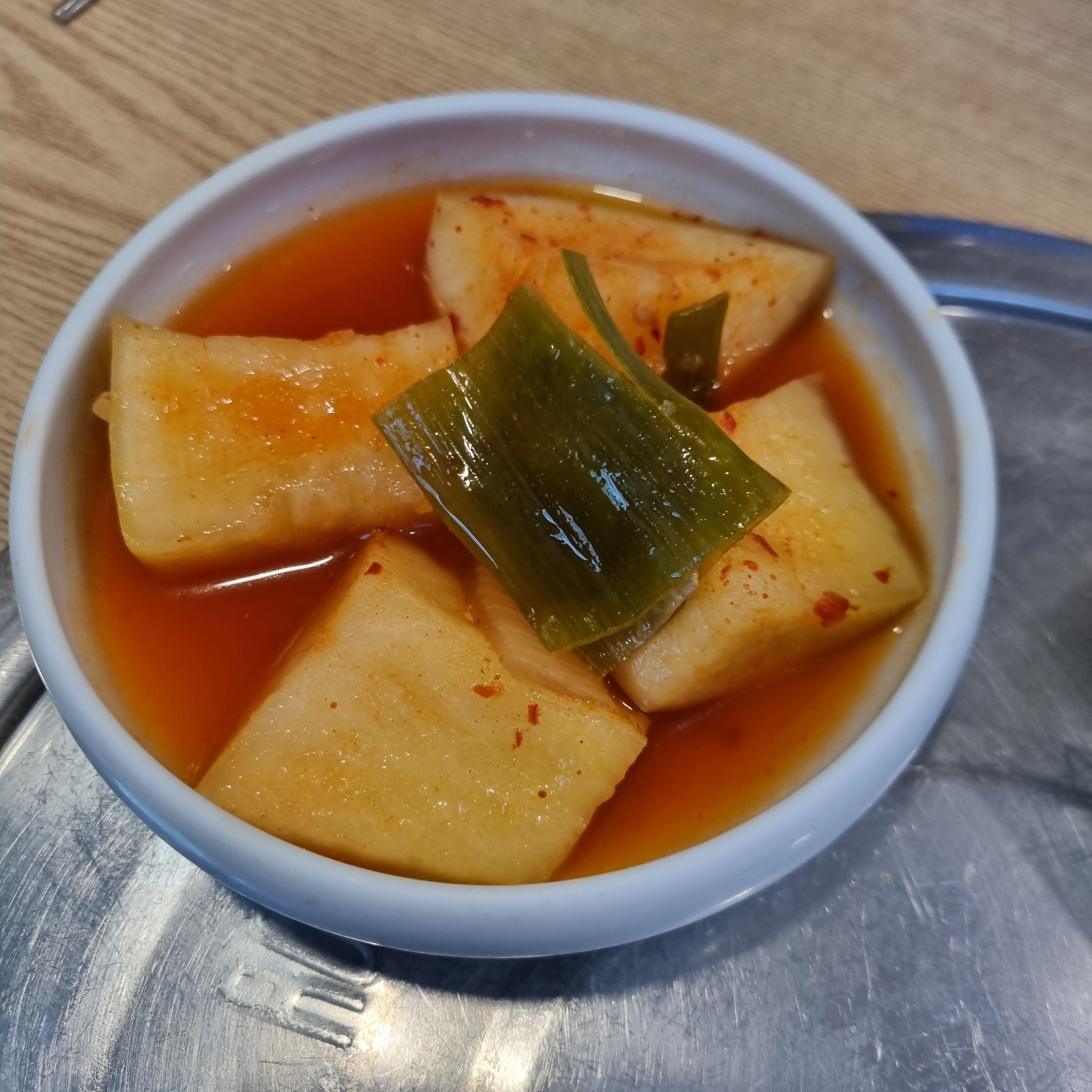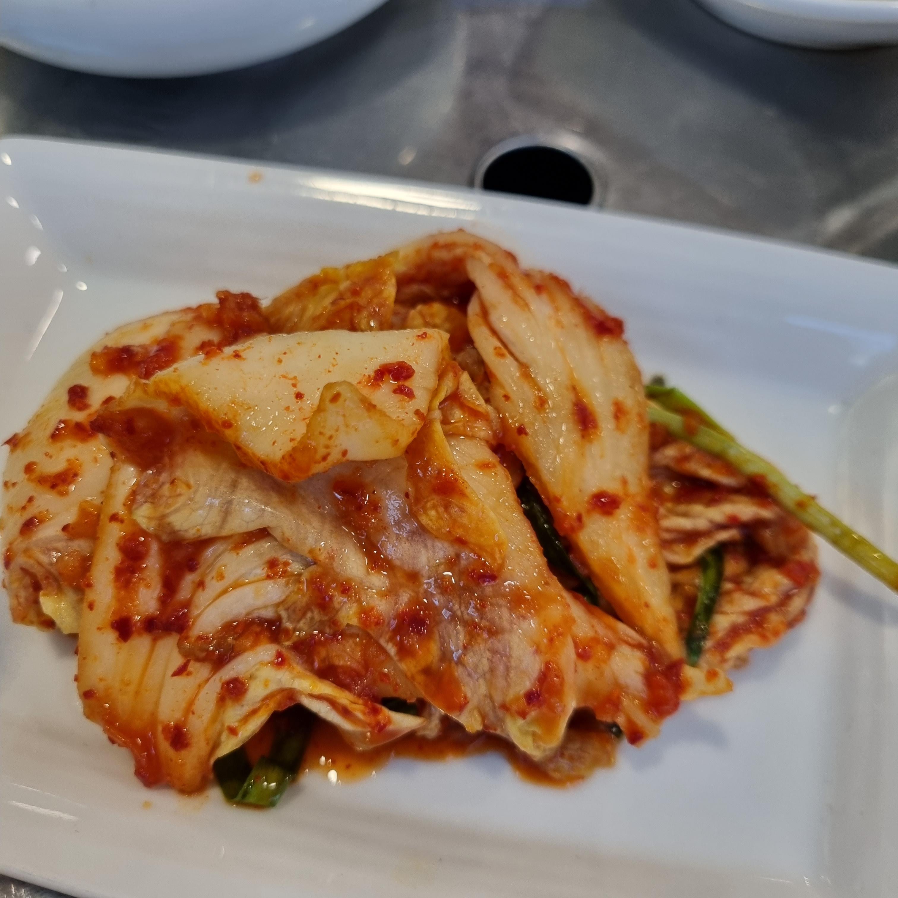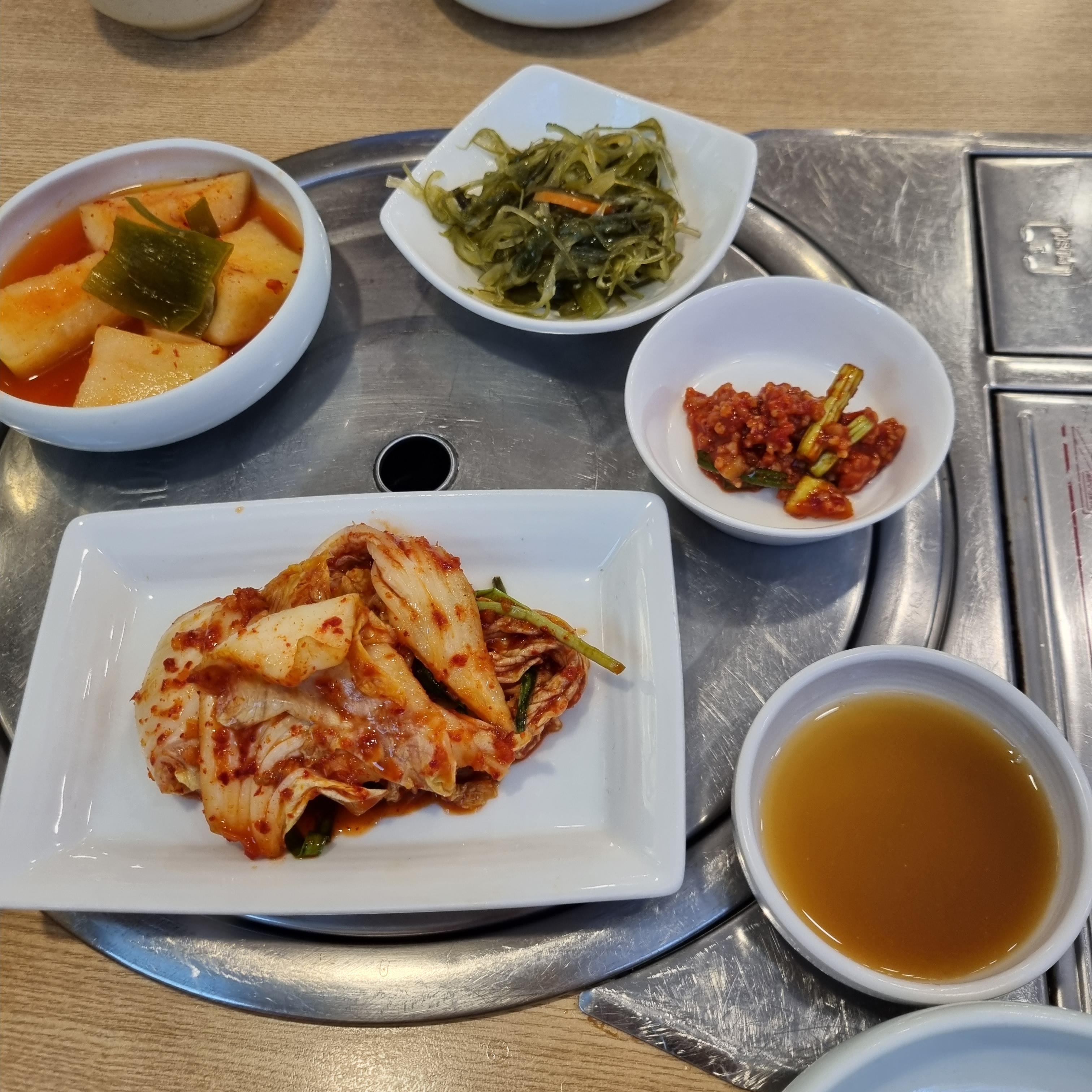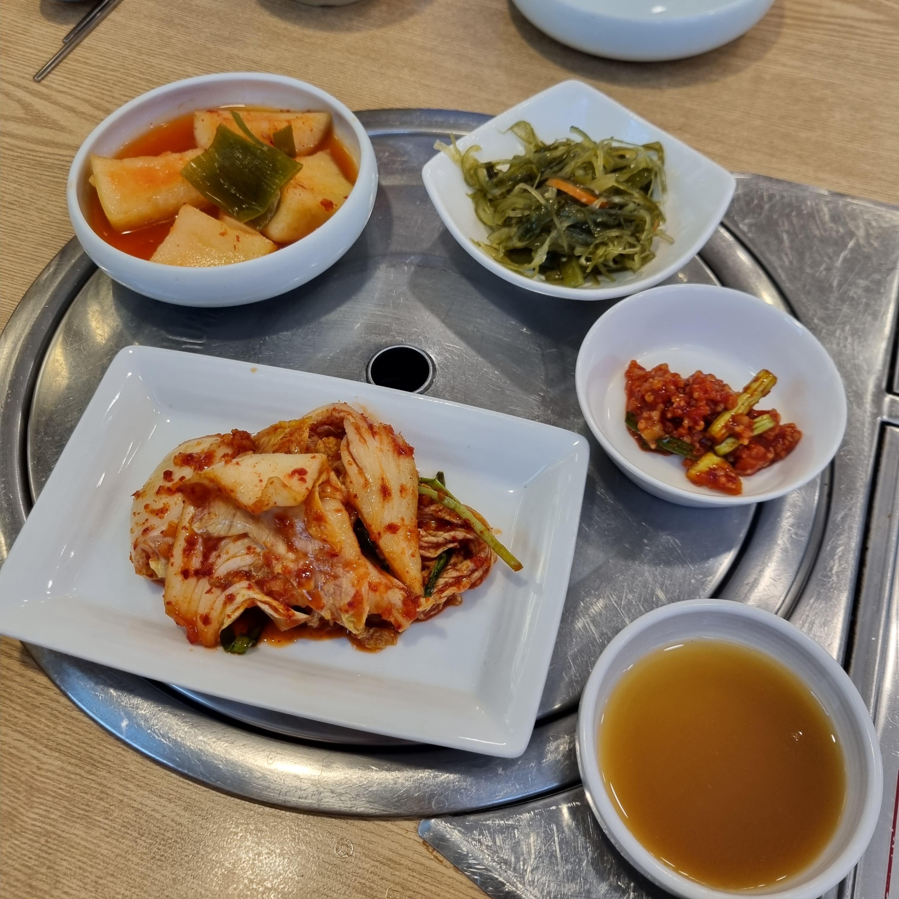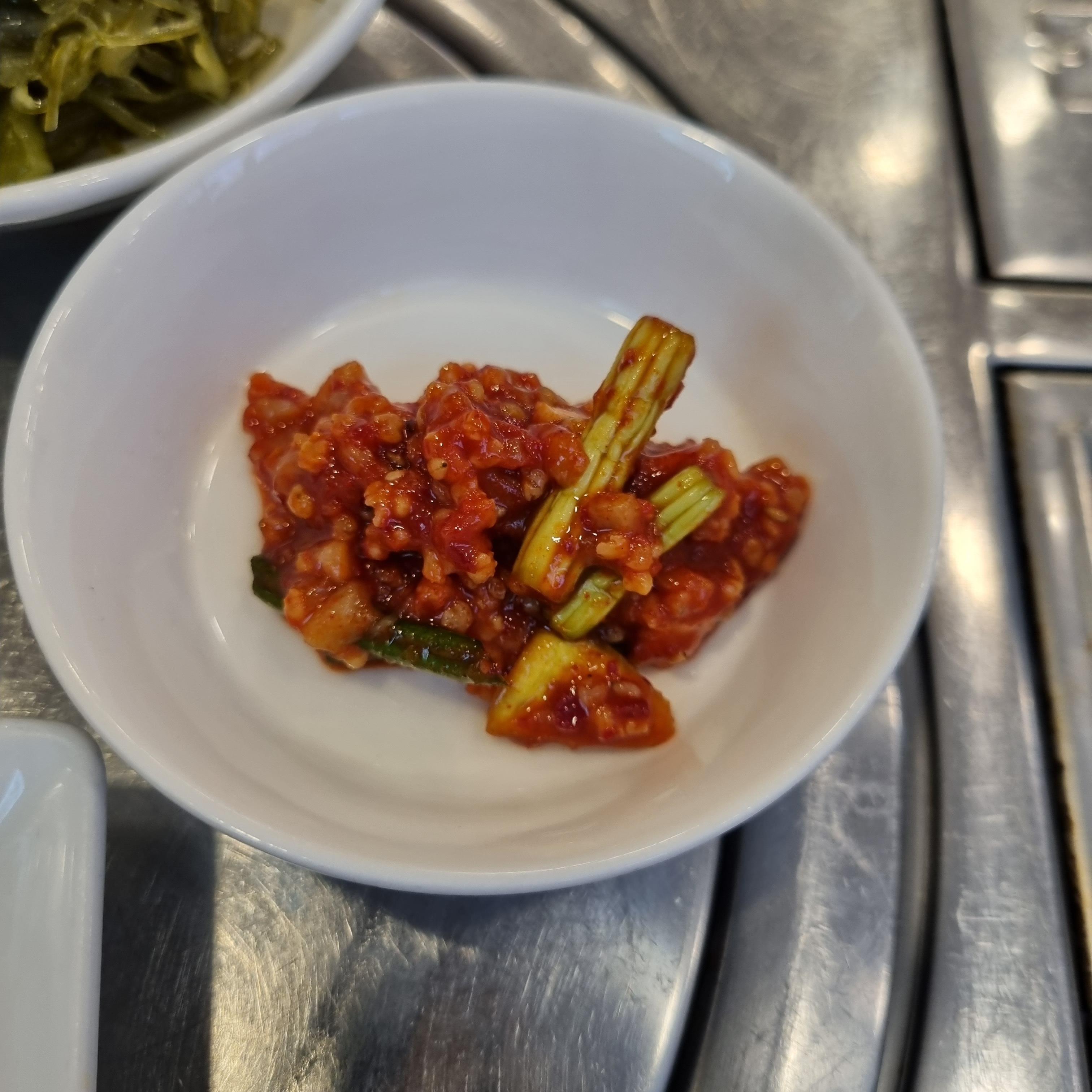 섞박지와 미역줄기볶음, 오징어젓갈, 배추김치입니다. 배추김치와 무김치는 달고 짠 편이었습니다. 섞박지는 아이도 먹을 정도로 맵지는 않았고 잘 익은 무였습니다. 오징어젓갈은 오징어를 찾기 어려워서 무슨 젓갈이냐고 종업원에게 물어봐서 알 수 있었답니다.