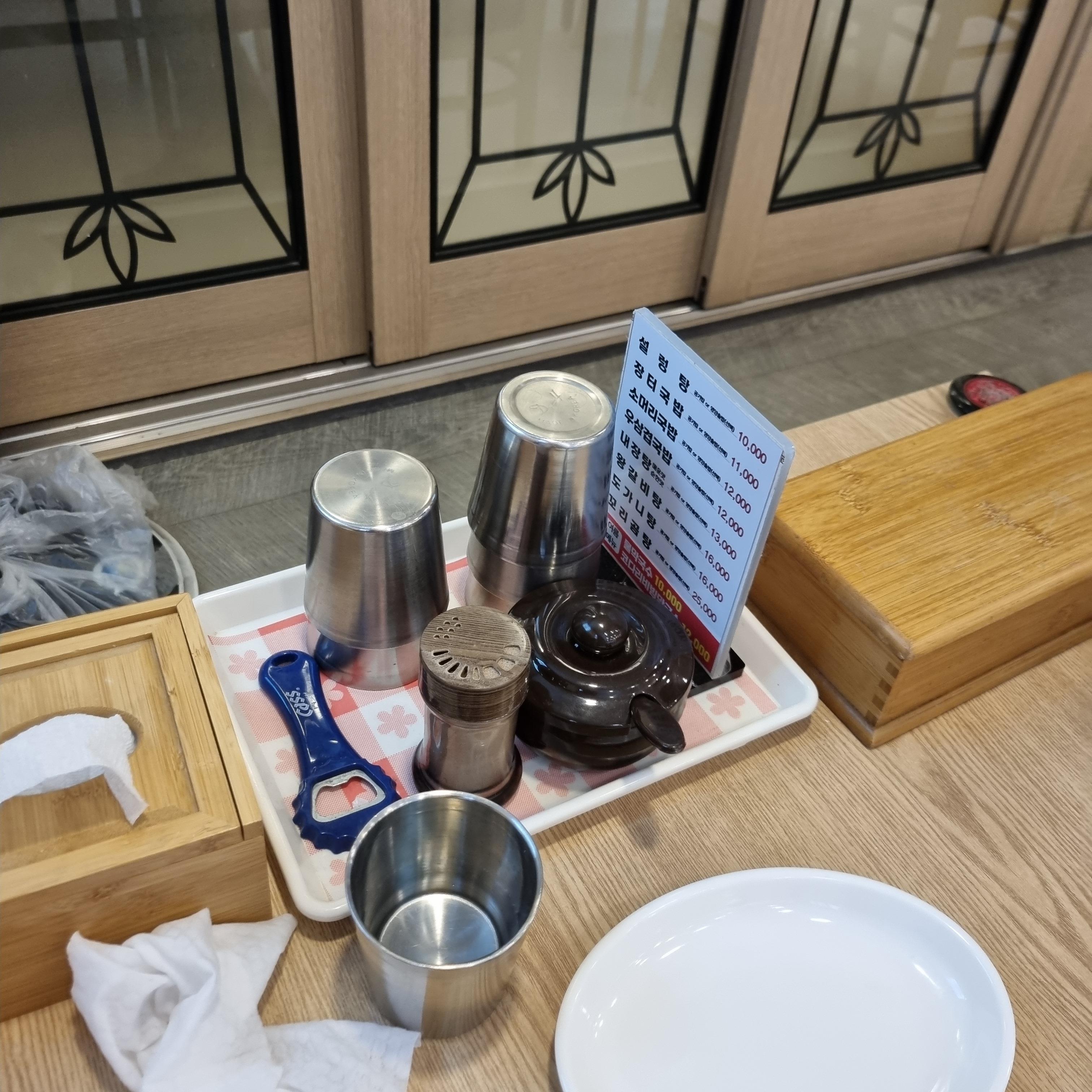 테이블에는 컵과 소금, 후추, 냅킨, 수저가 기본 세팅되어 있었습니다. 물을 가져다주셨는데 물병 모양이 작고 특이했습니다. 갈비탕을 시키니 좀 뒤에 반찬과 함께 국자, 집게, 가위, 통을 가져다주셨습니다. 함께 나온 통은 나중에 갈빗살을 발라내고 뼈를 버릴 때 사용했답니다. 아이를 위해서는 작은 숟가락과 포크를 주셨습니다. 갈비탕 먹기에 충분했답니다.