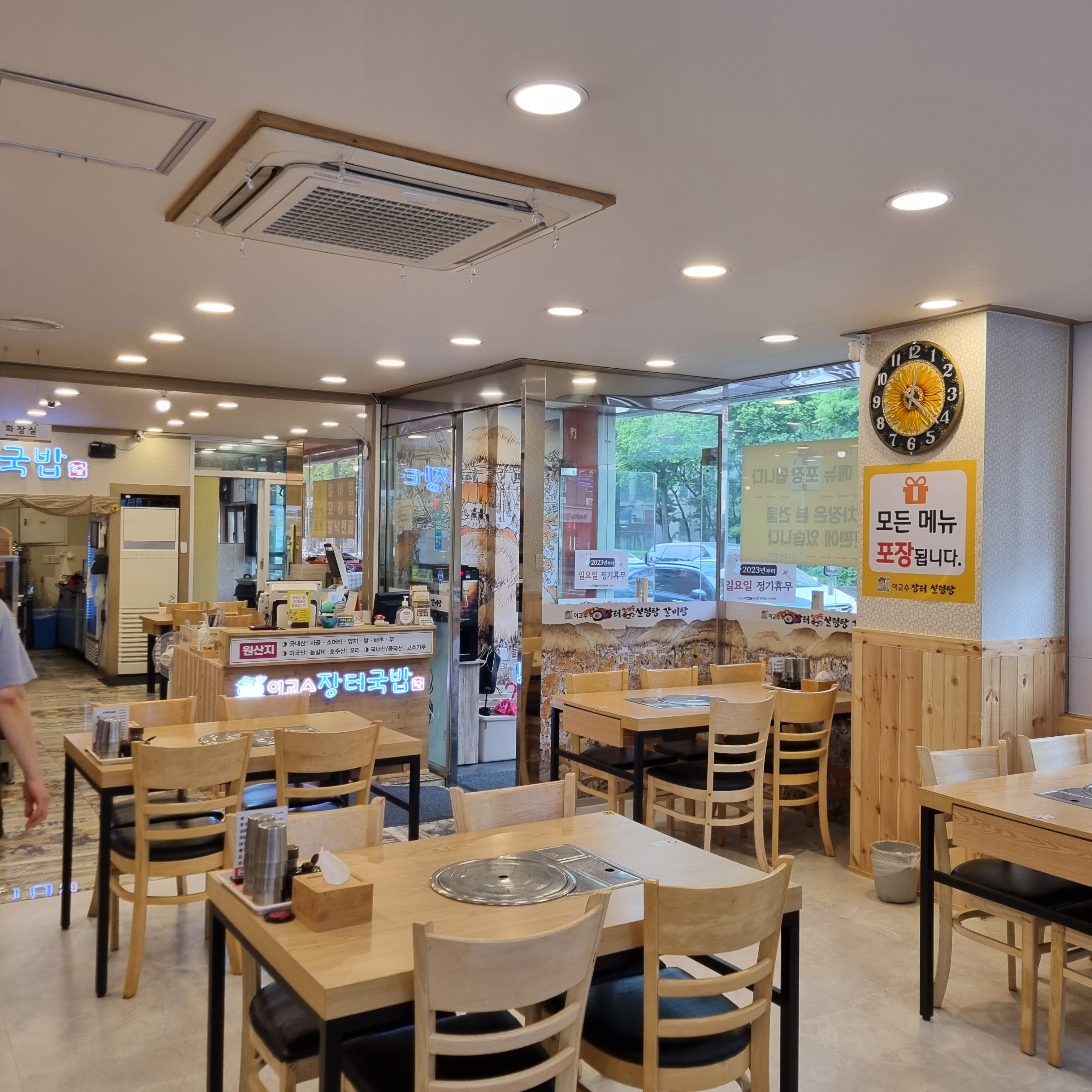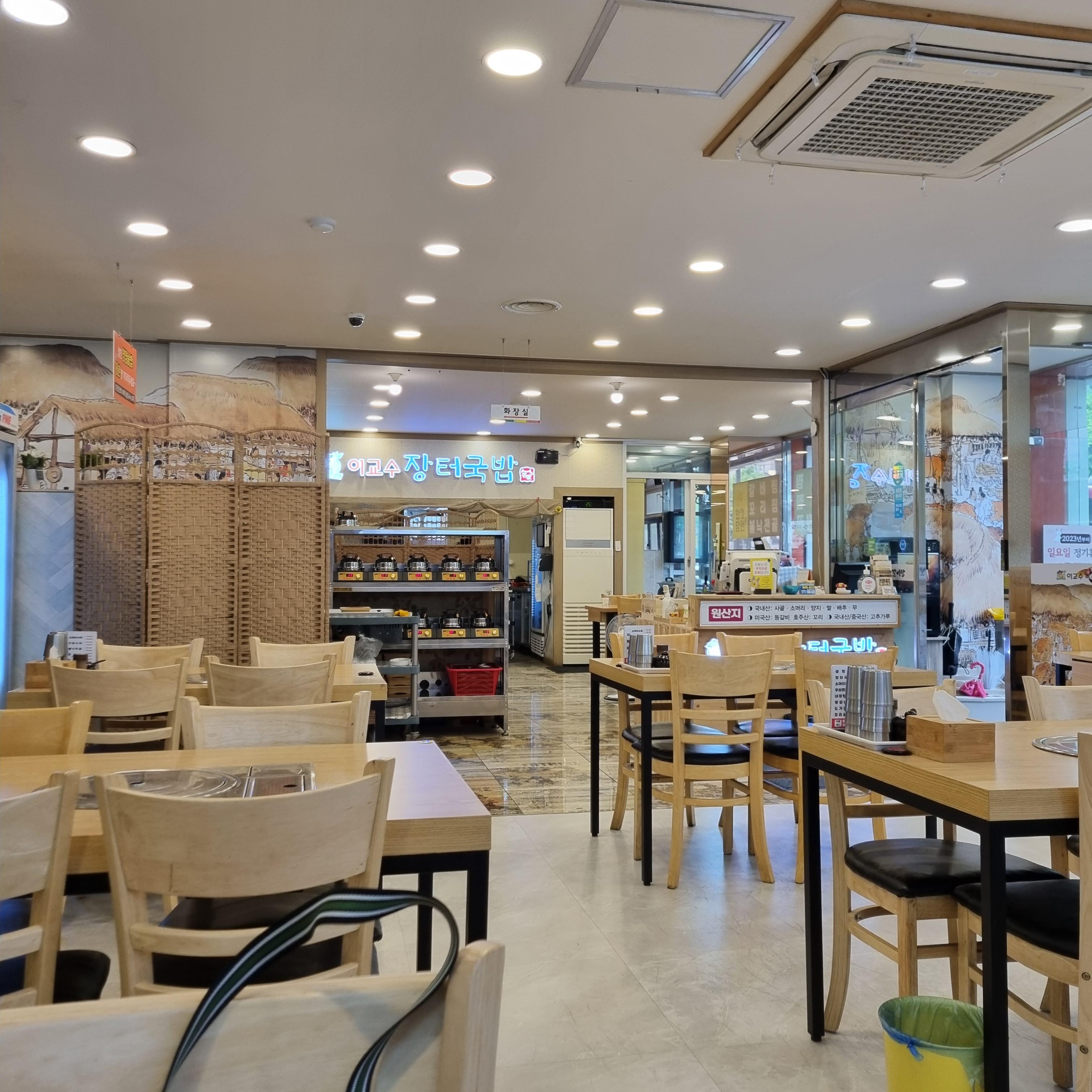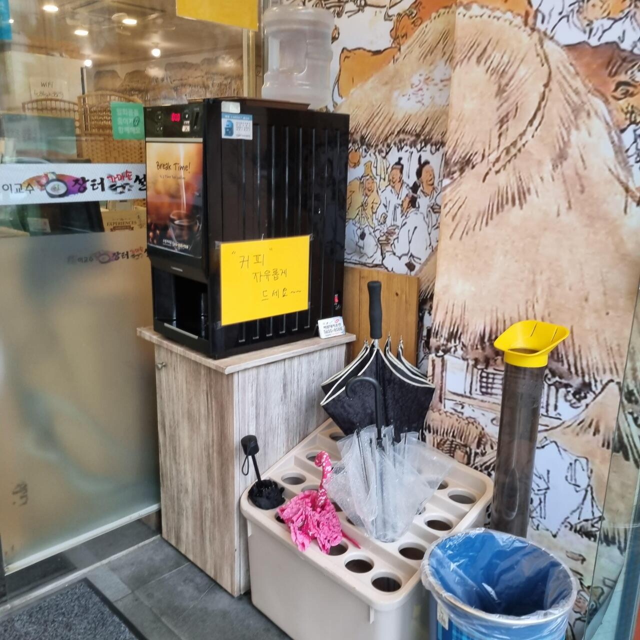 이교수장터국밥은 건물 1층에 넓게 자리했습니다. 간판에는 장터 가마솥 설렁탕 갈비탕이라고 적혀있습니다. 입구부터 어떤 메뉴를 파는지 모를 수 없도록 메뉴로 도배되어 있는 느낌입니다. 문을 열고 들어서니 우산꽂이와 커피머신이 있습니다. 커피는 무료로 자유롭게 드시라고 적혀있습니다.