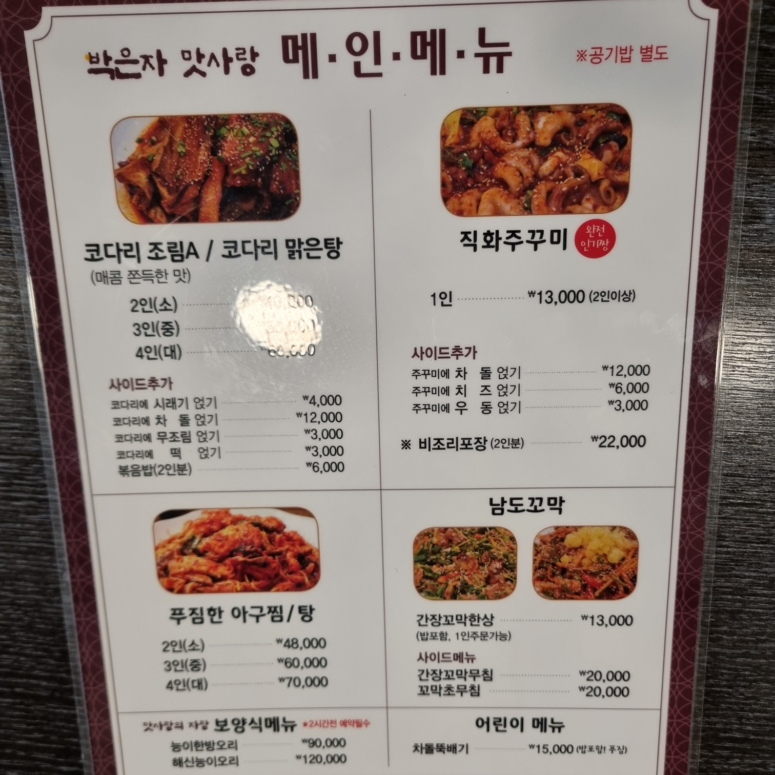 박은자맛사랑 들어가는 입구에 해물요리 코다리전문점으로 소개되어 있습니다. 역시나 모든 메뉴가 해산물입니다. 혼자 먹을 수 있는 메뉴는 없는 줄 알았는데 1인도 주문 가능한 메뉴 '간장꼬막한상'이 있었습니다. 다음에 한 번 도전해 봐야겠습니다. 메뉴판을 보니 사이드 추가도 가능합니다.