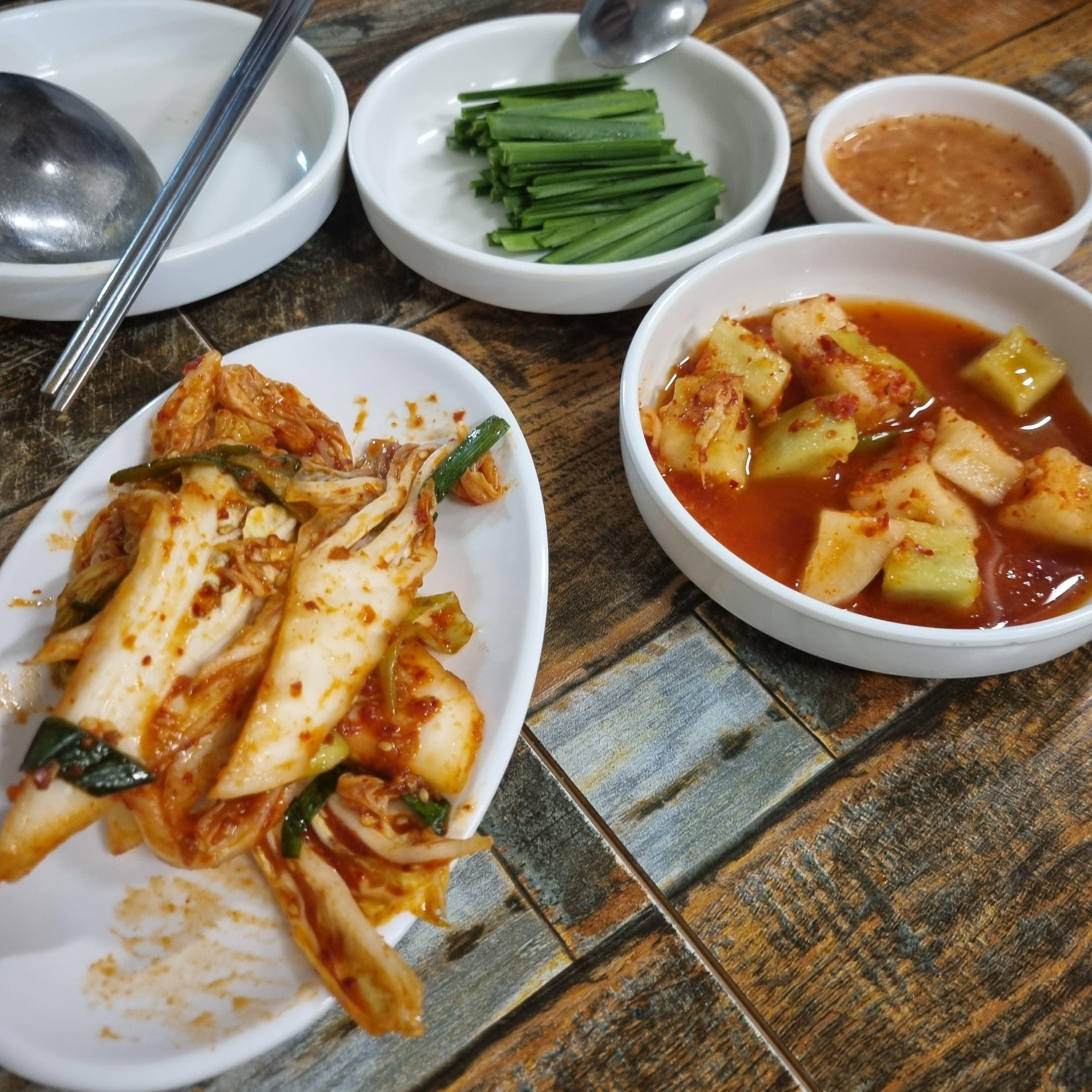 순대국에 넣을 부추도 챙겨주셨고 깍두기와 겉절이도 주셨어요. 김치는 간이 셌지만 맛있었고 깍두기도 순대국과 어울리는 맛이었어요.