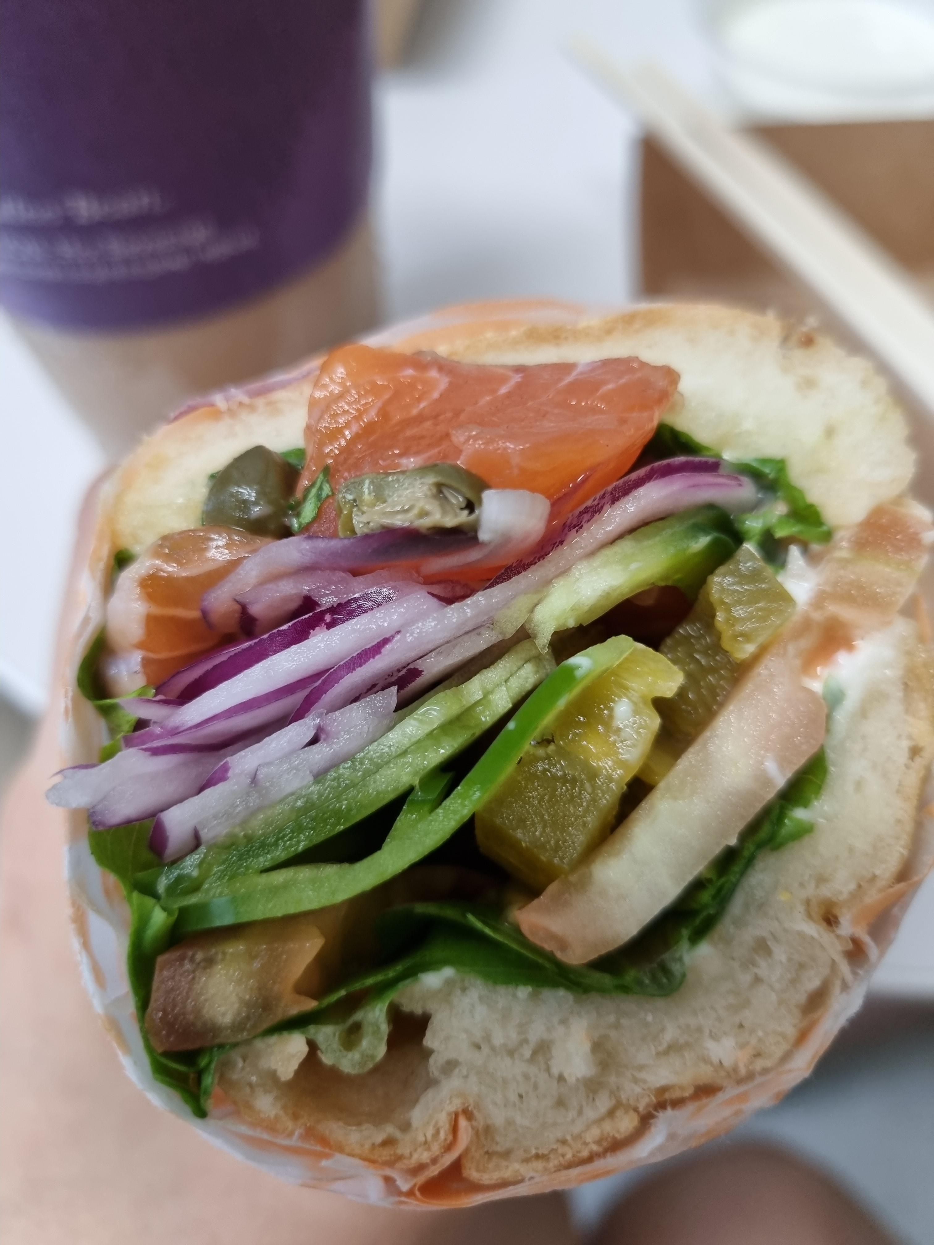 제 최애 음식이 연어인데 지방은 좀 있지만 단백질이 풍부하지요. 요즘 연어 가격도 올라서 필렛으로 혼자 사다 먹기에도 번거롭더라고요. 그래서 연어샌드위치를 배민으로 주문해 봤습니다.