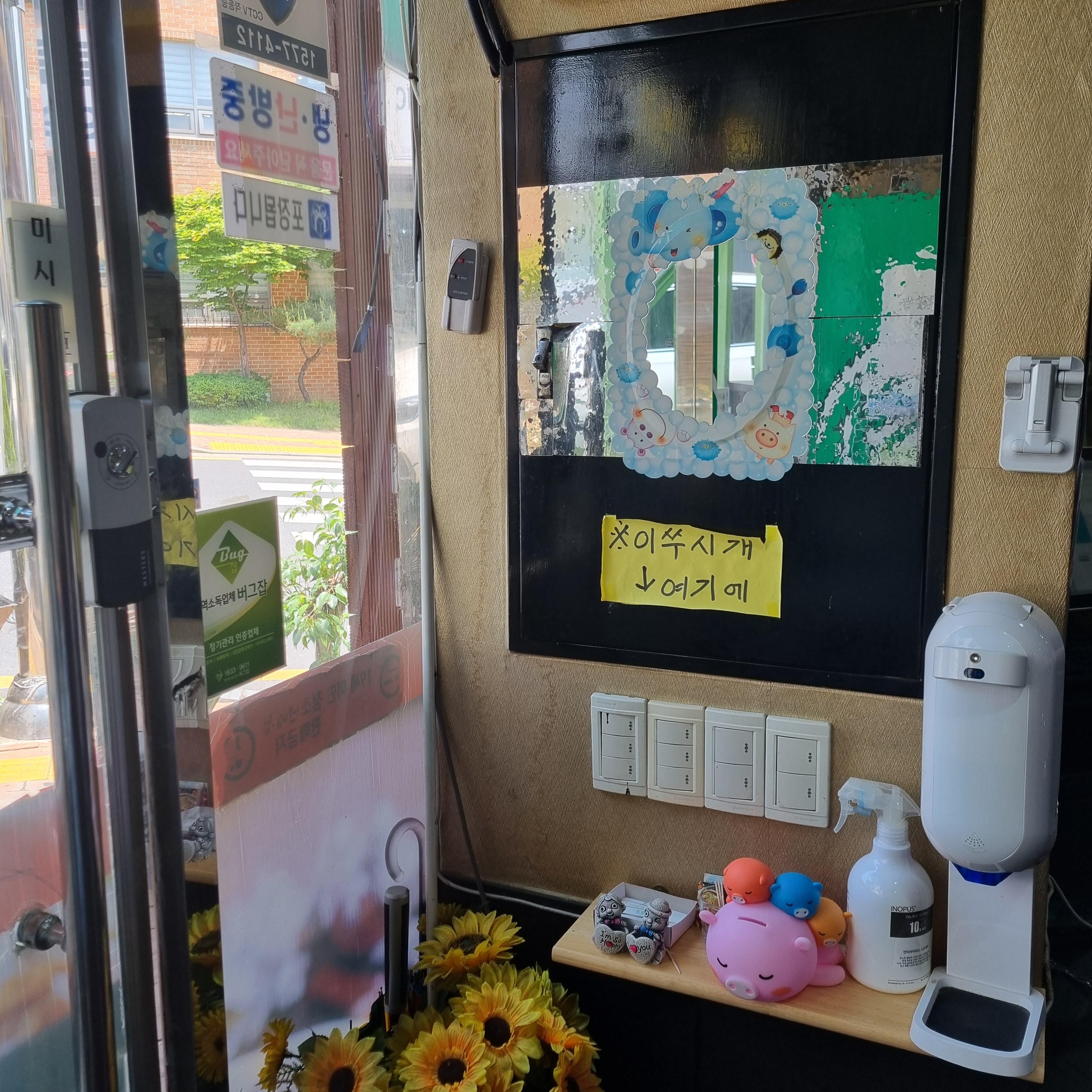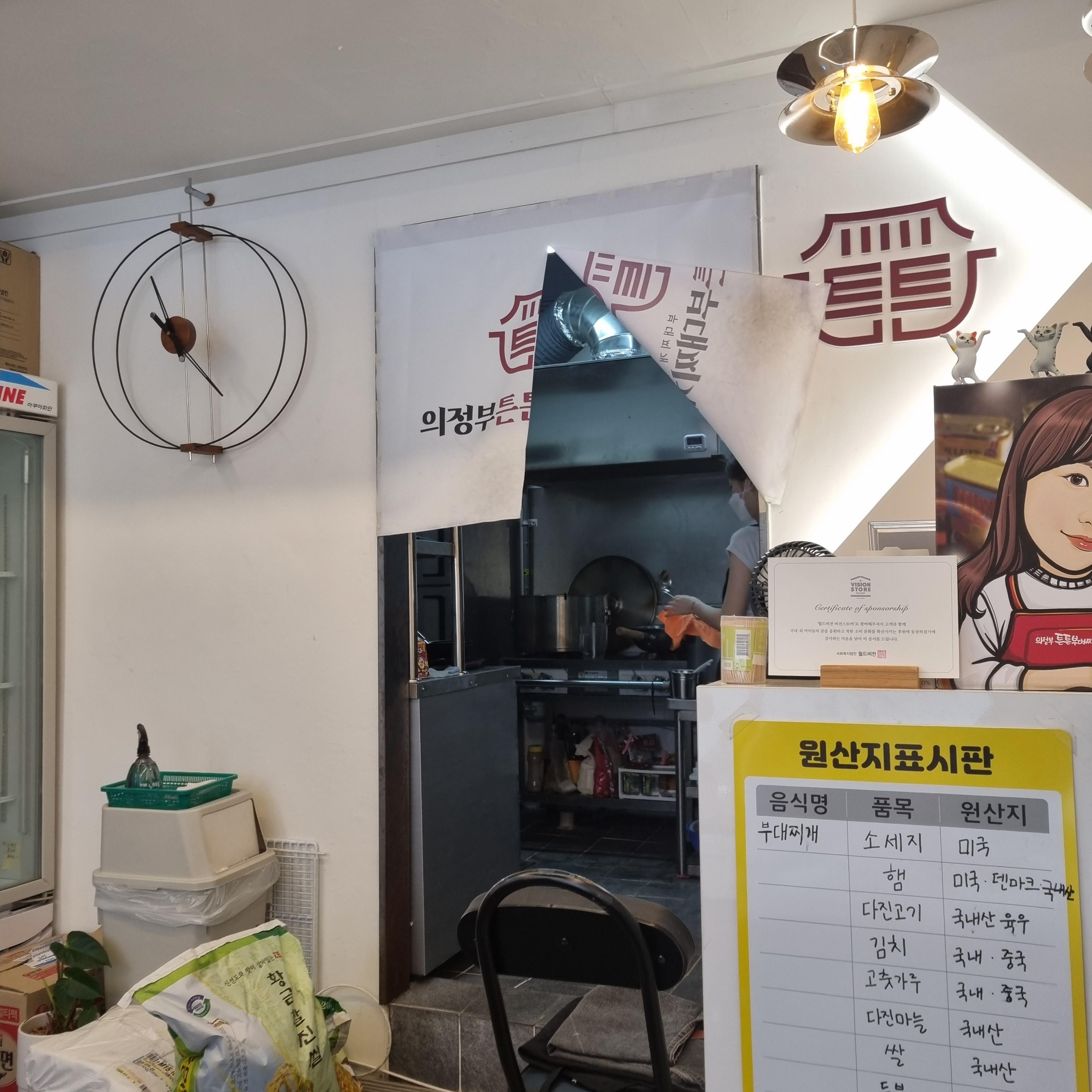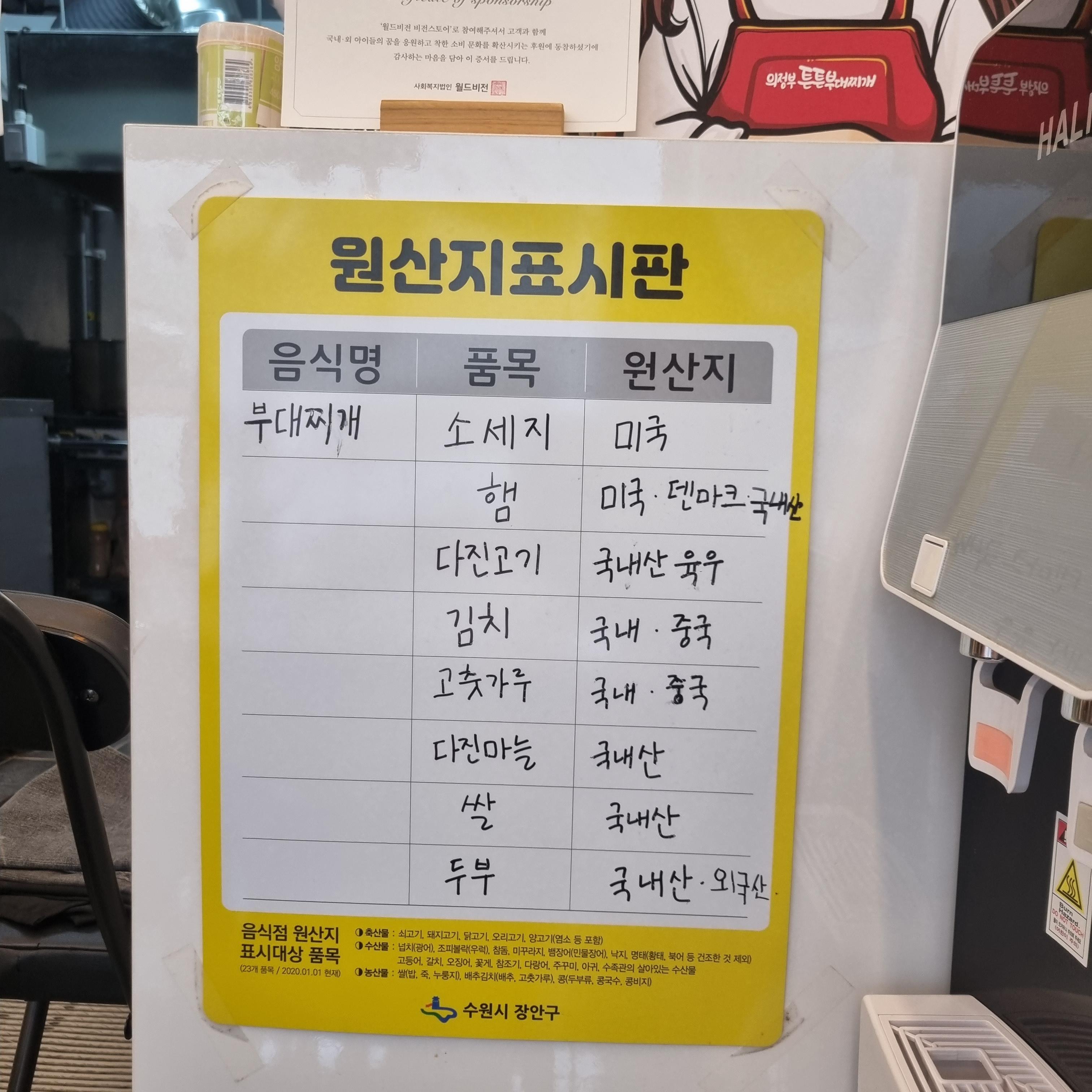 식당은 작은 편으로 테이블이 몇 개 없습니다. 그래서 점심시간에는 금방 손님이 찰 수 있답니다. 대기할 것을 생각하고 갔는데 다행히 바로 앉을 수 있었습니다. 음식점을 둘러보니 원산지 표지판이 보입니다. 소시지, 햄은 수입산과 국내산이 섞여있고 다진 고기는 국내산입니다. 김치나 고춧가루는 국산이나 중국산을 사용하는 것 같습니다. 원산지 정보가 눈에 띄게 있어 믿음이 갔습니다. 실내는 깔끔한 편이었습니다.