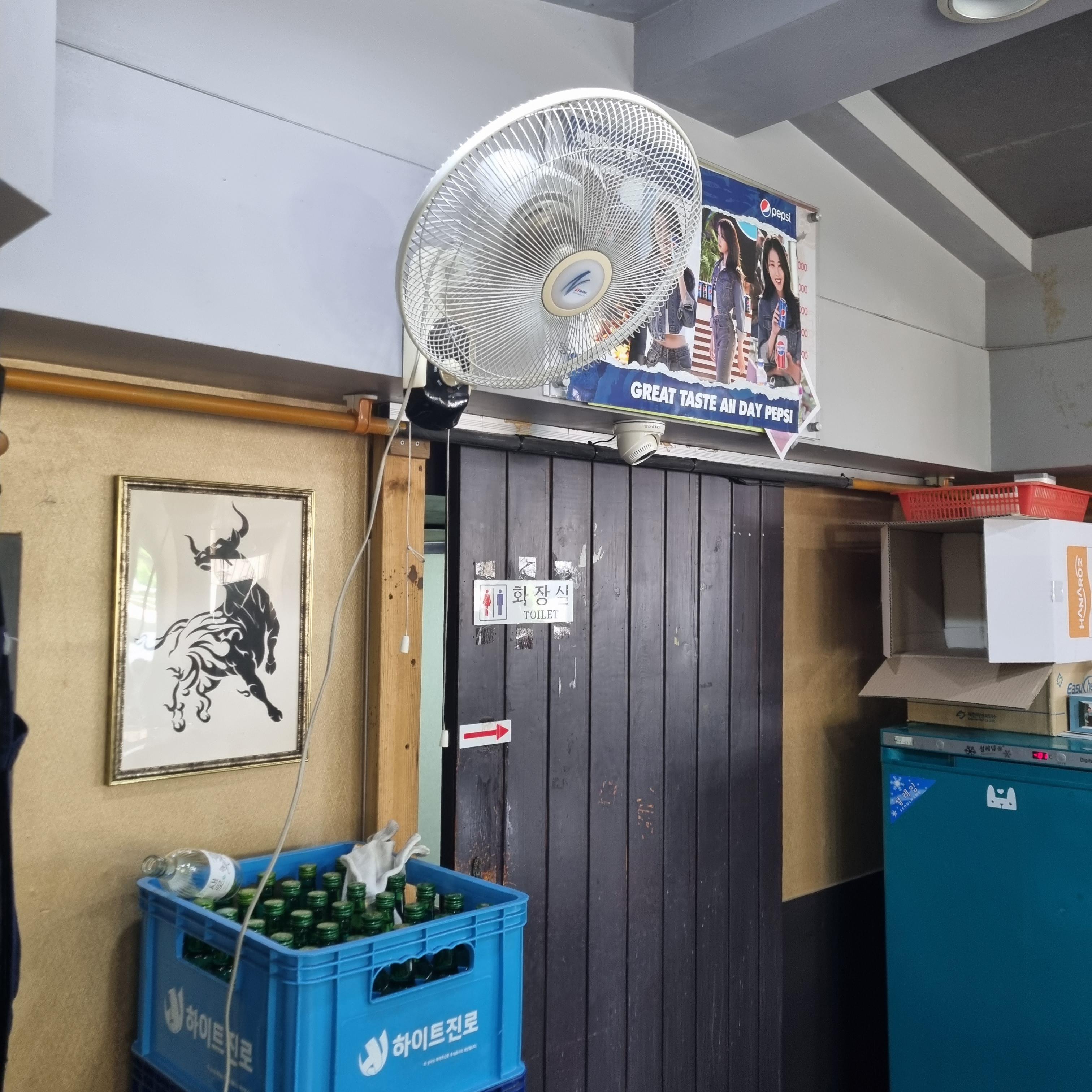 평일 점심시간에 방문해서 그런지 식사하는 손님이 있었습니다. 그래서 홀 사진을 제대로 찍지 못했습니다. 사진에 보이는 것보다 테이블이 더 많습니다. 의정부튼튼부대찌개보다 식당이 훨씬 넓지만 세월이 느껴집니다. 자리에서 끓이는 요리를 주메뉴로 판매하다 보니 곳곳에 선풍기가 비치되어 있습니다. 다리 방향으로 계속 틀어주더라고요.