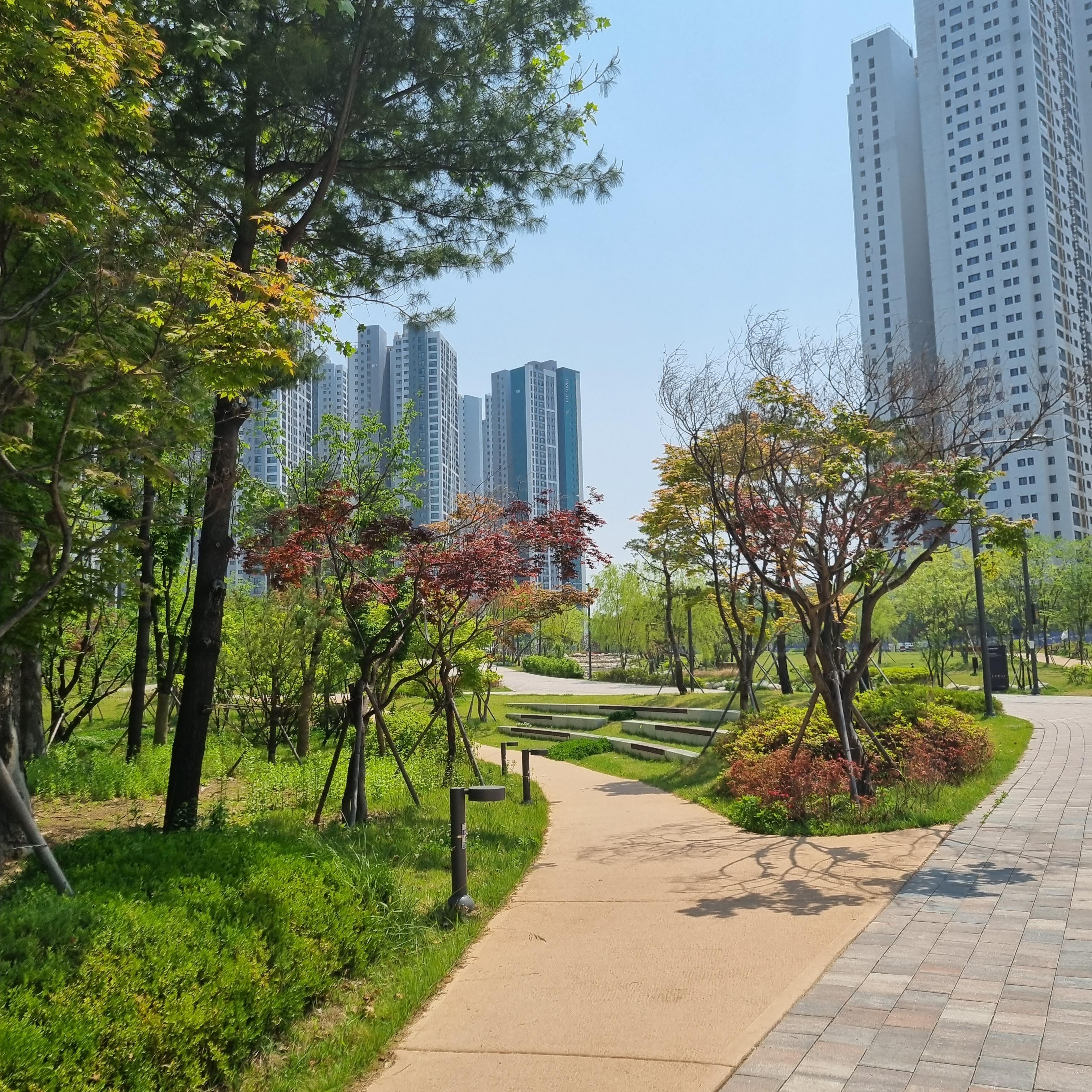 111CM 주차장에서 공원으로 들어와서 111CM 건물 우측 산책로로 걸어가 봅니다. 경사가 있는 언덕입니다.  언덕 위에서 공원 입구방향으로 찍은 사진입니다. 여긴 경사로가 있어서 겨울에 눈이 쌓이면 아이들이 썰매를 가져와서 타는 곳입니다. 경사로를 내려오며 자전거와 킥보드의 스피드를 즐기기도 하고요. 공원 옆에 보이는 공사 중인 건물은 송림초등학교입니다. 인근 아파트에 사는 아이들은 공원 쪽으로 난 후문으로도 안전하게 등하교합니다.