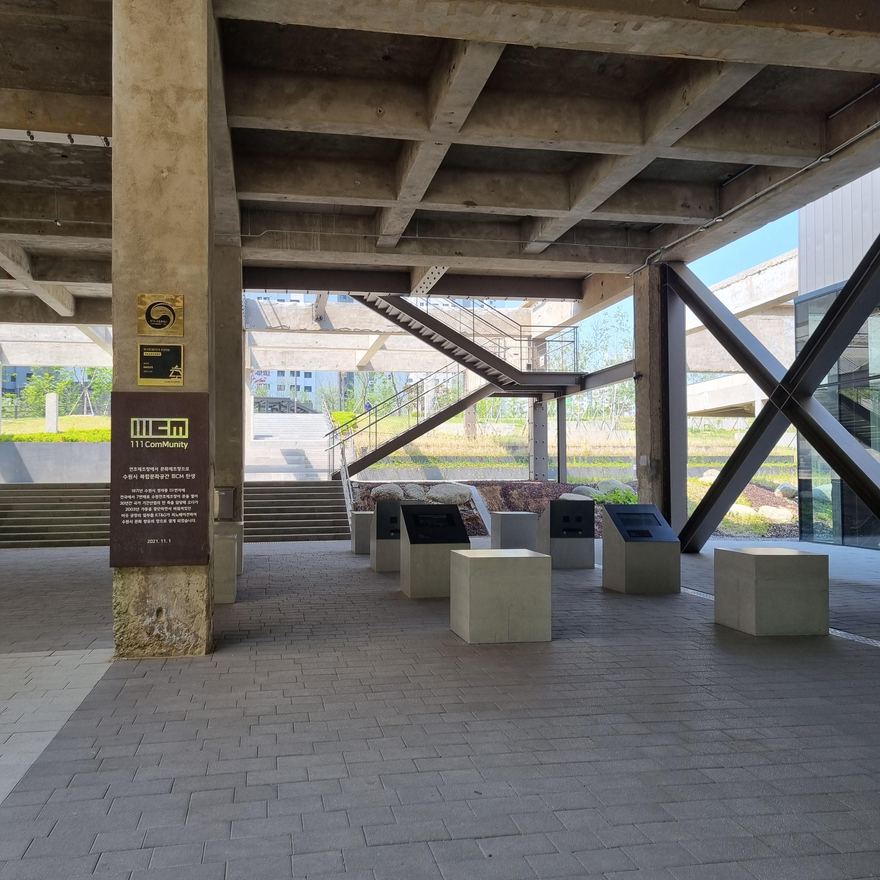 대유평공원에는 111CM이라는 복합문화공간도 조성이 되어 각종 행사나 전시도 열리고 있습니다. 이 건물은 연초제조창 일부를 리노베이션 한 공간이라고 합니다. 기존 건물의 뼈대를 살려서 전면 유리창으로 바꿨습니다. 통창인만큼 건물 안에서 밖을 바라봤을 때 보기 좋도록 조경에도 신경 쓴 것으로 보입니다.