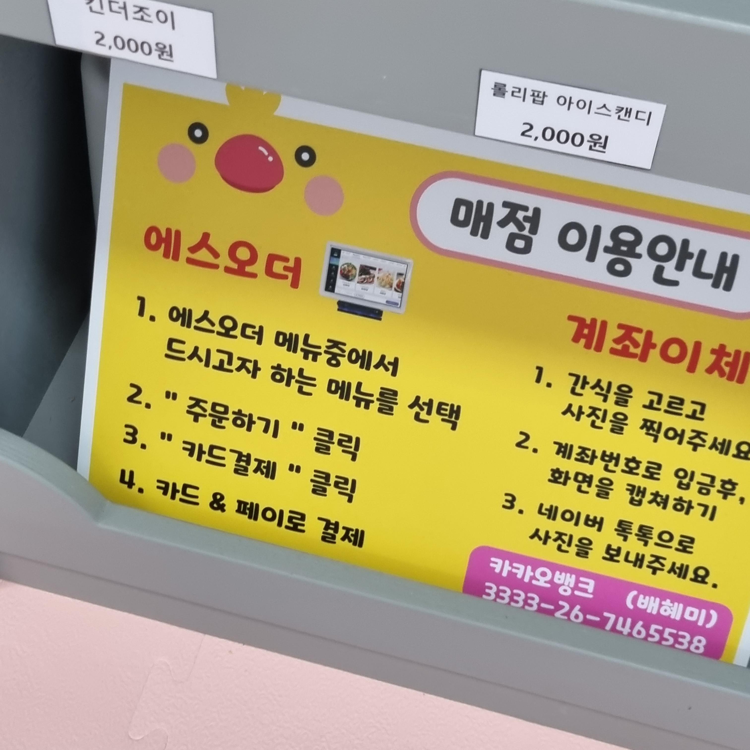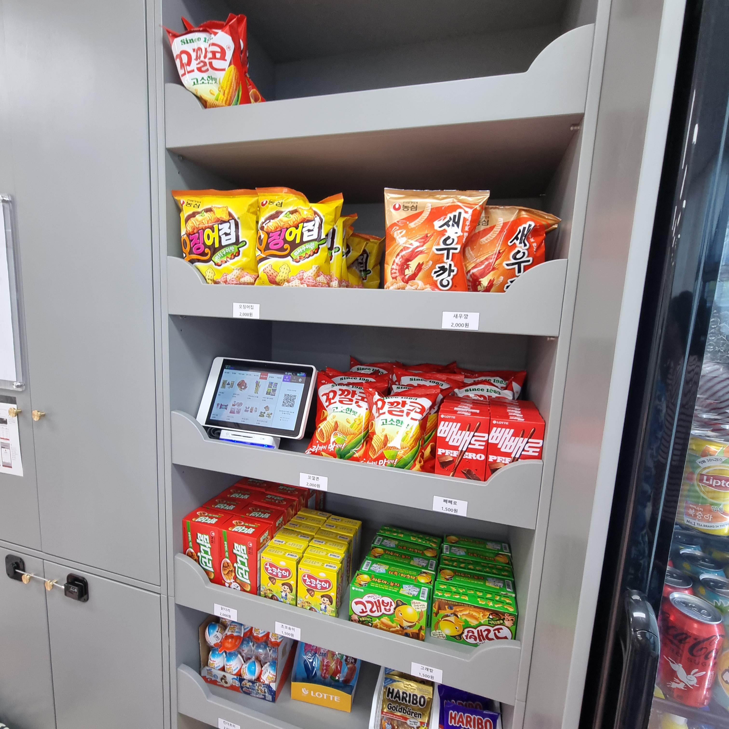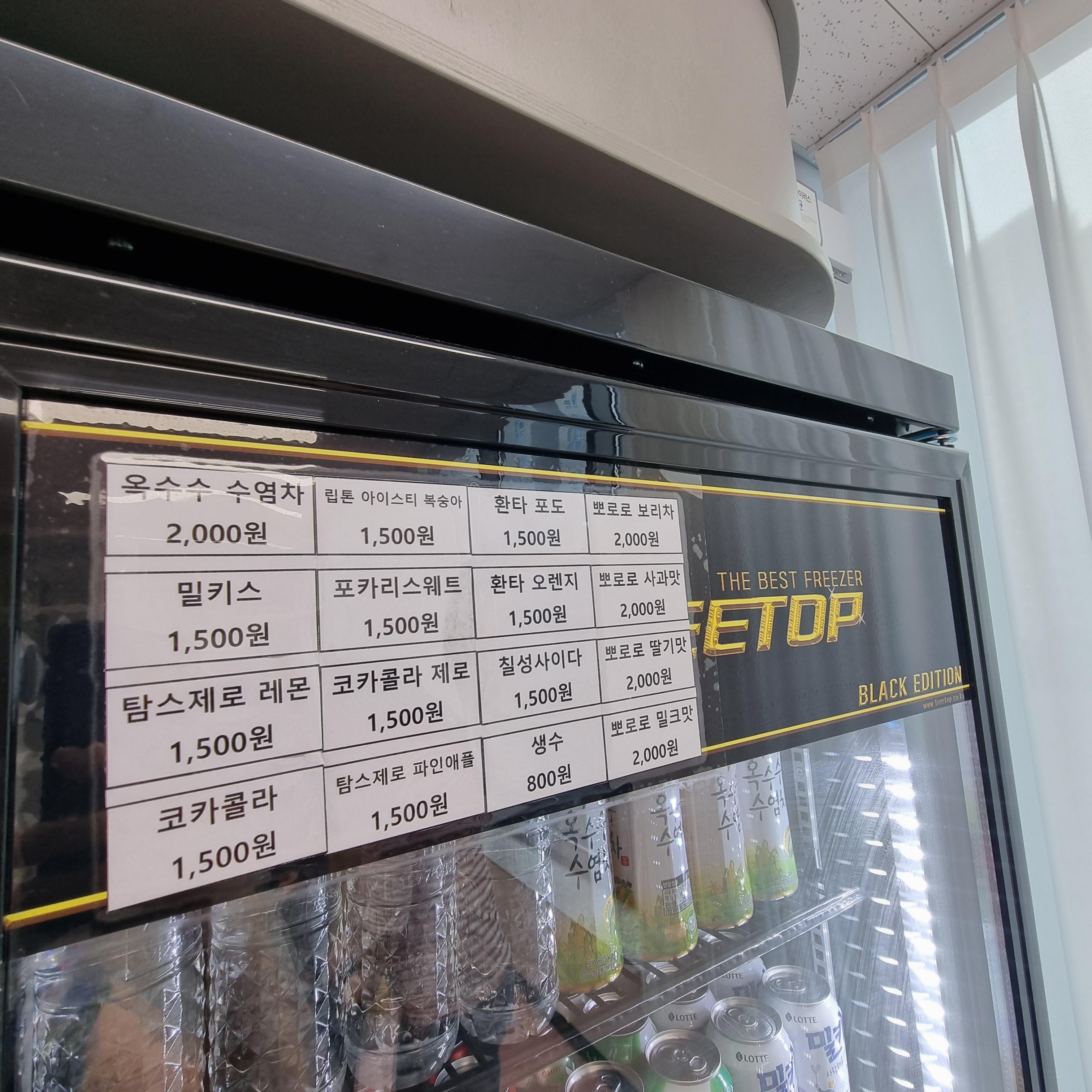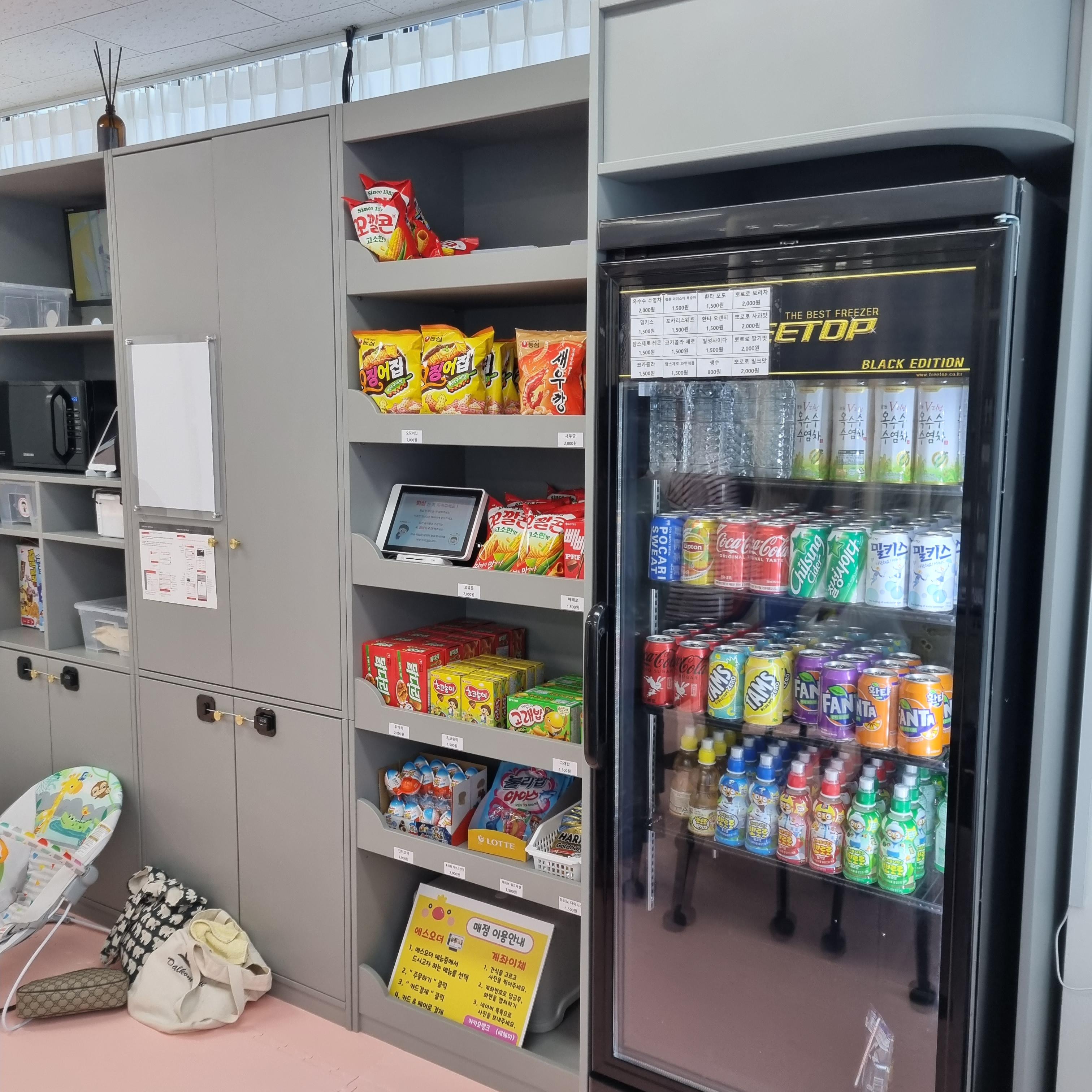 테이블 옆으로는 무인 판매하는 과자와 음료수가 있습니다. 카드결제나 계좌이체 모두 가능하더라고요. 음료 종류도 다양하지만 아이들이 좋아하는 뽀로로 음료수 가격은 2,000원입니다.