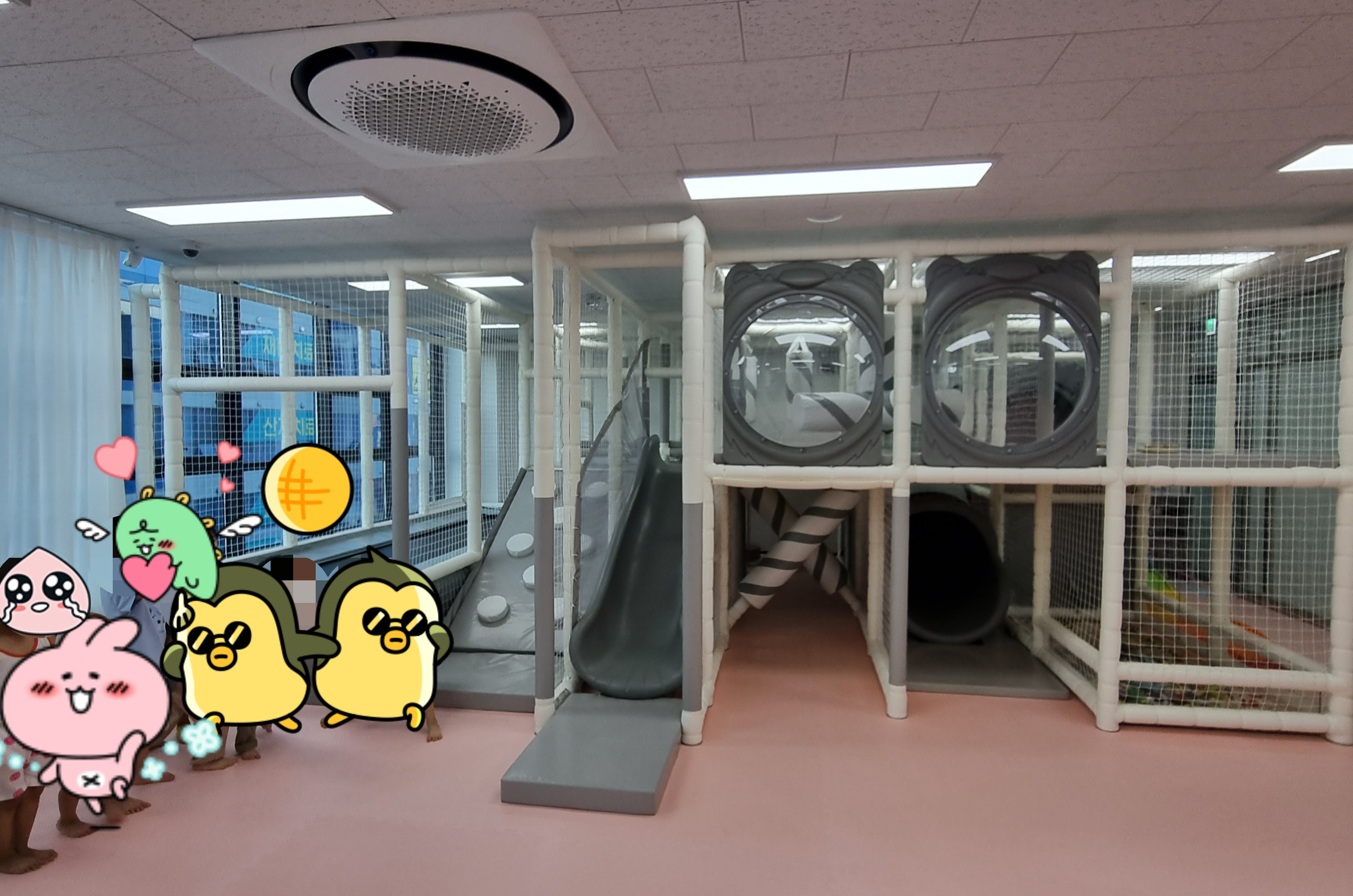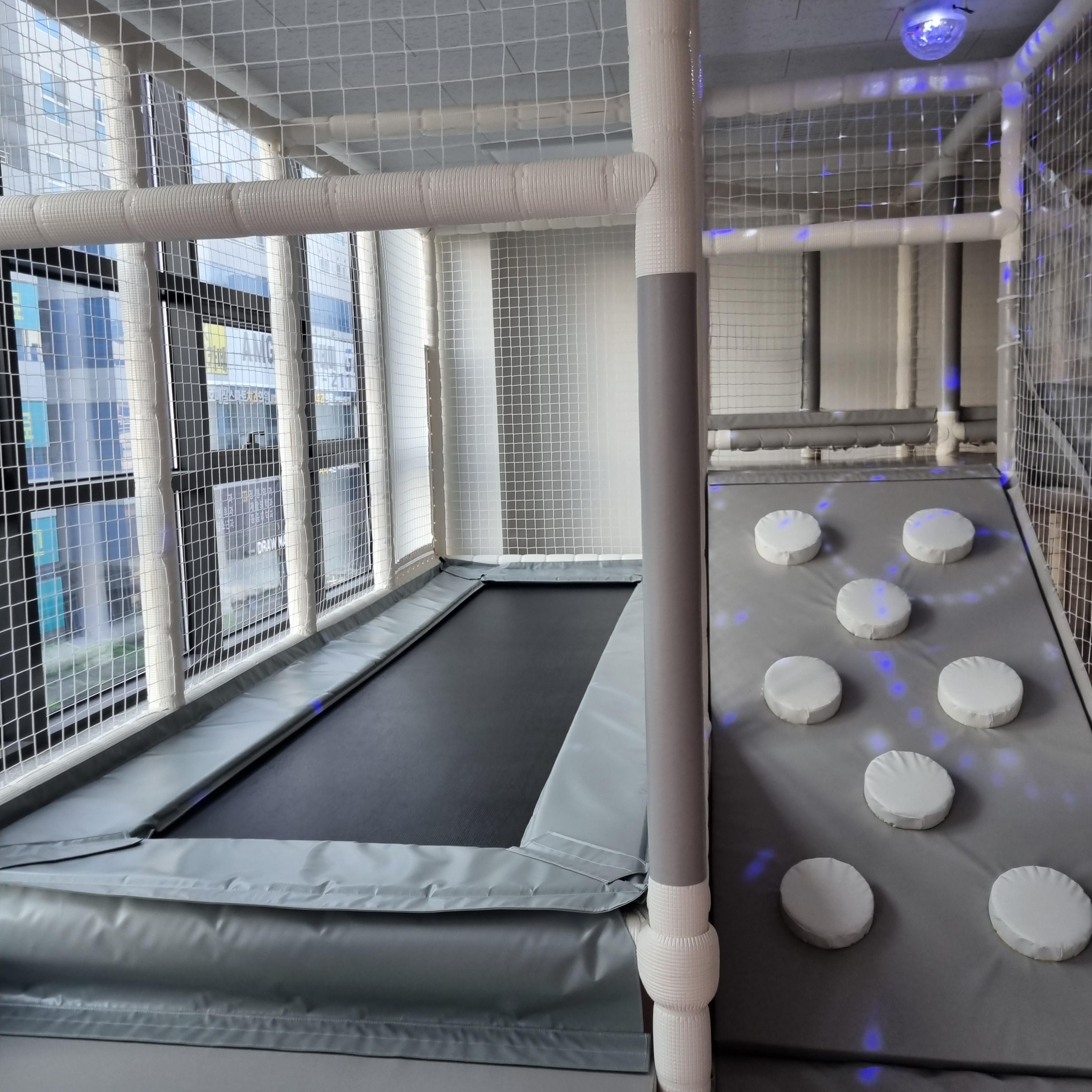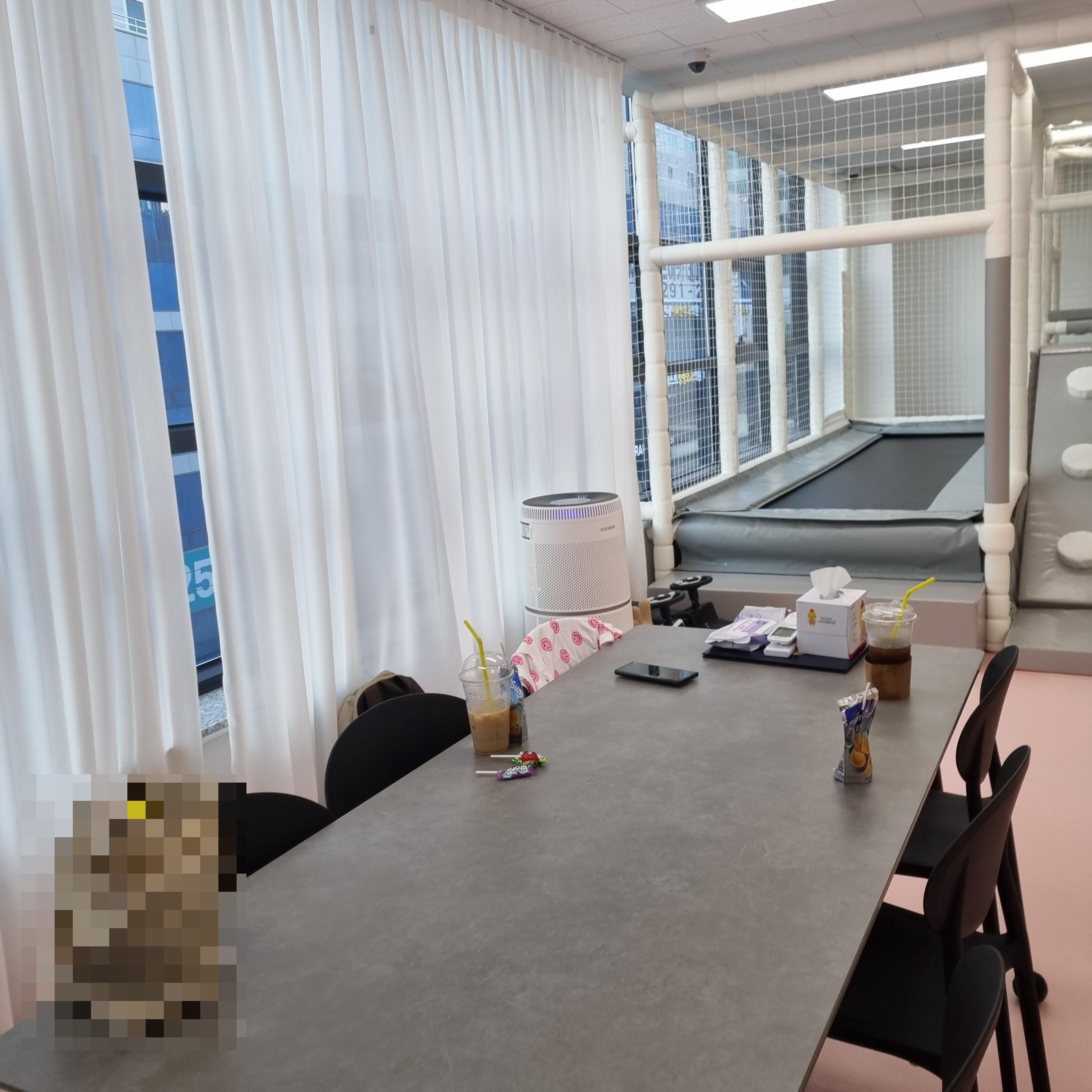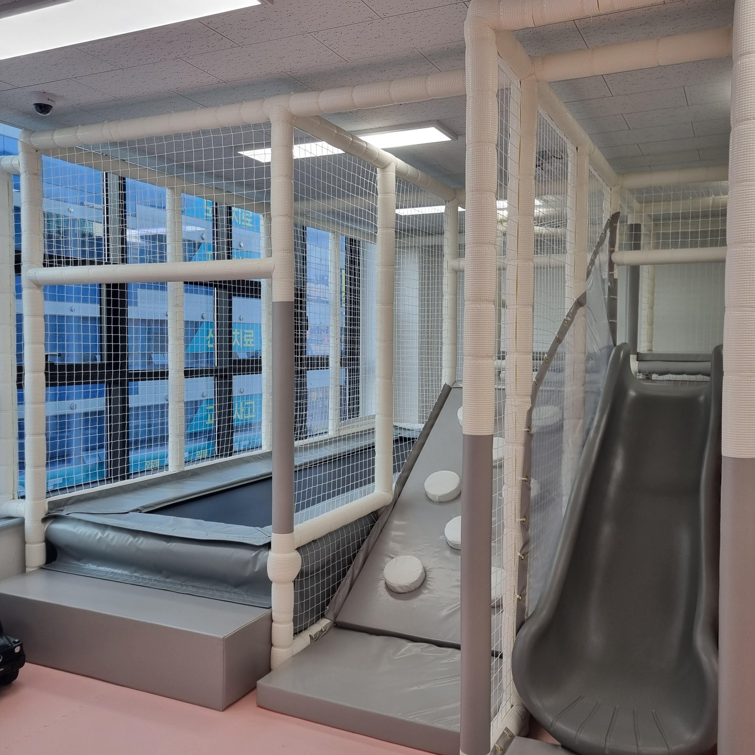 퇴실 전에 급하게 찍어본 사진입니다. 공간이 엄청 넓지는 않지만 아이들끼리 충분히 뛰어다니며 놀 수 있습니다. 트럼폴린에서 뛰기도 하고 미끄럼틀도 타고 정신없이 뛰어놉니다.
