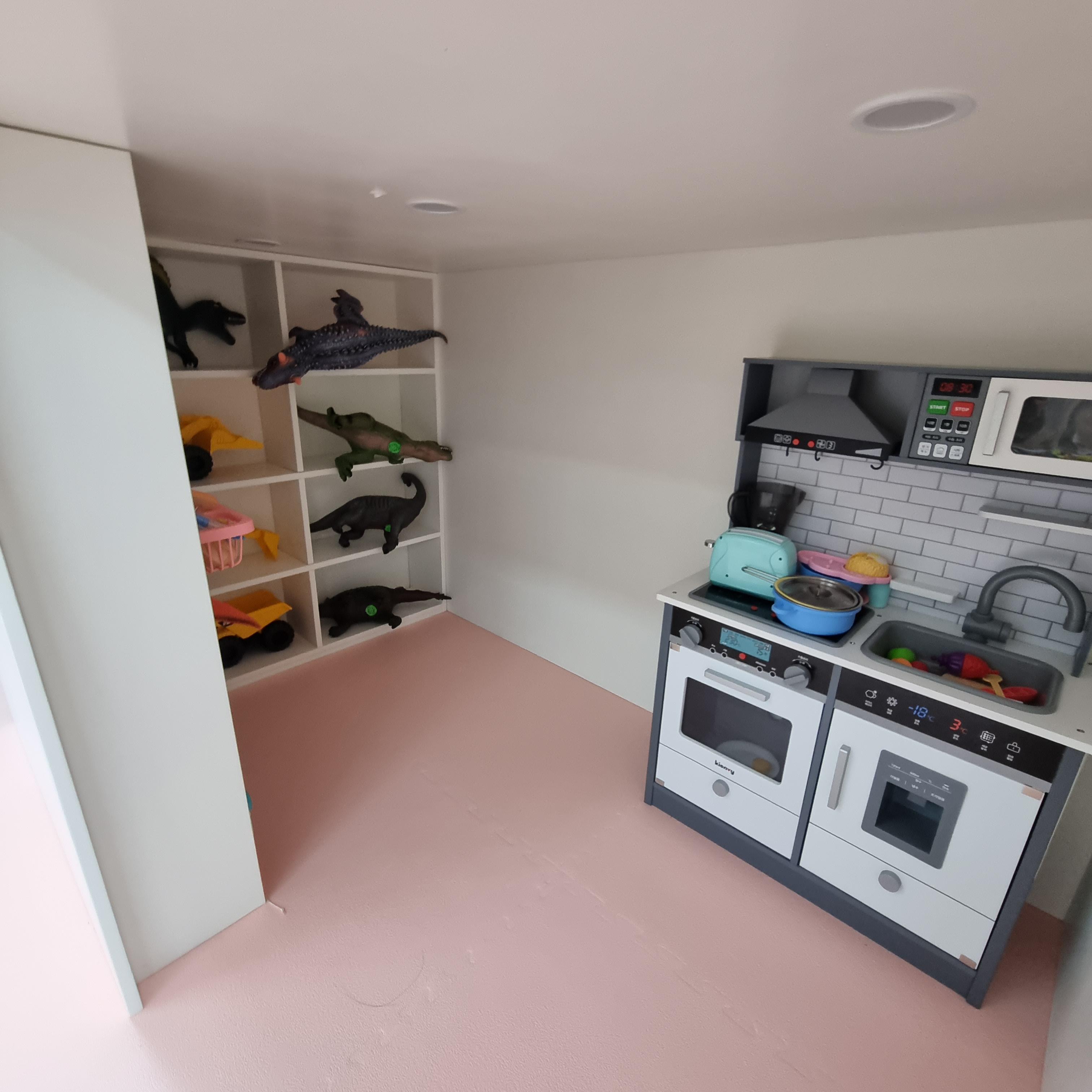 주방놀이를 할 수 있는 공간도 있고 각종 공룡도 있습니다. 처음엔 예쁘게 정리되어 있었겠지만 나올 때 저희가 정리하고 나와서 정리 상태는 처음과 다를 수 있답니다.