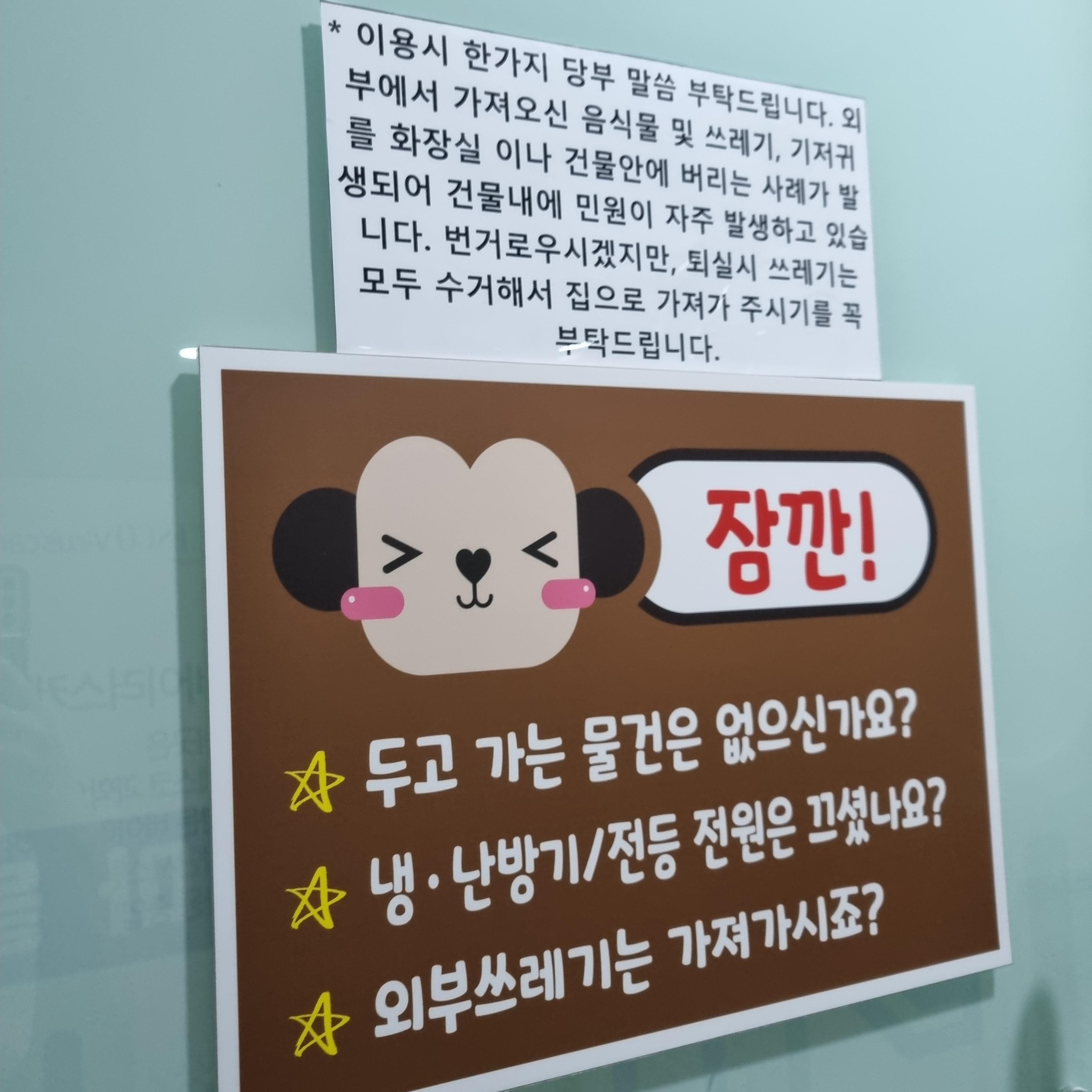 무인키즈카페의 특성에 맞게 안내문이 있었습니다. 냉난방기 전원은 직접 끄고, 전등도 소등해야 합니다. 엄마들 커피와 아이들 주전부리를 들고 왔는데 외부 쓰레기니까 챙겨서 나와야 한답니다. 사장님이나 직원이 지키고 있지 않은 매장인만큼 자유로워서 좋습니다. 그리고 그만큼 뒷정리는 잘하고 나오는 것이 맞는 것 같습니다. 다음에도 기회가 있다면 또 가고 싶답니다.