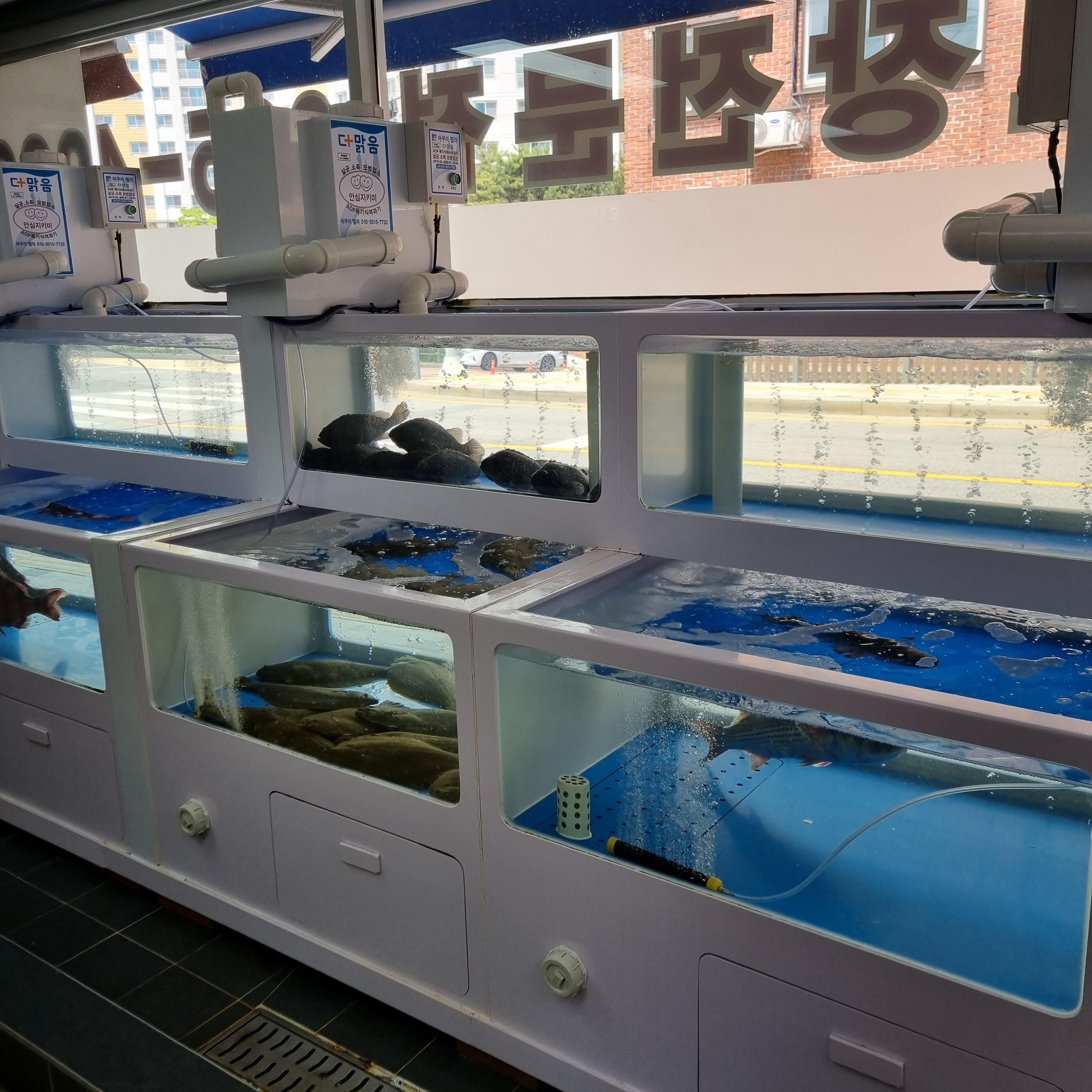 포장 회를 찾아 나오려고 보니 횟집 창가 앞에 수족관이 보입니다. 수족관이 깨끗하게 잘 관리되는 느낌을 받았습니다. 실내 공기도 습하거나 비린내 나지 않고 깔끔했습니다. 청결한 느낌을 받았답니다.