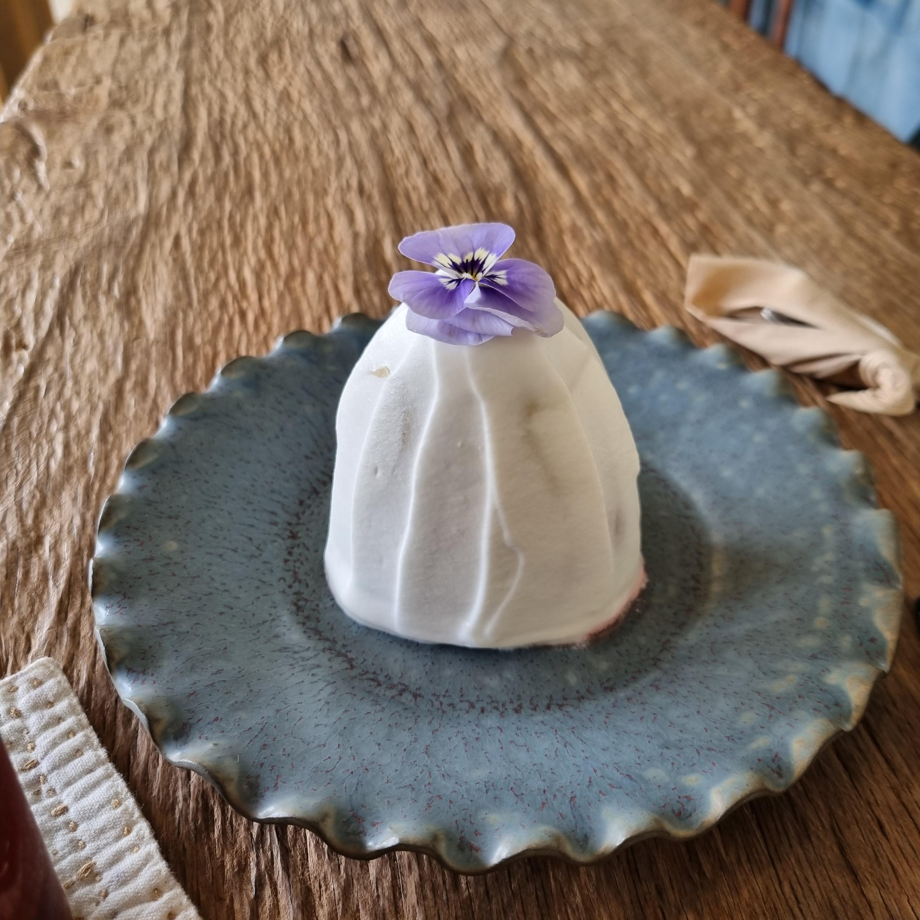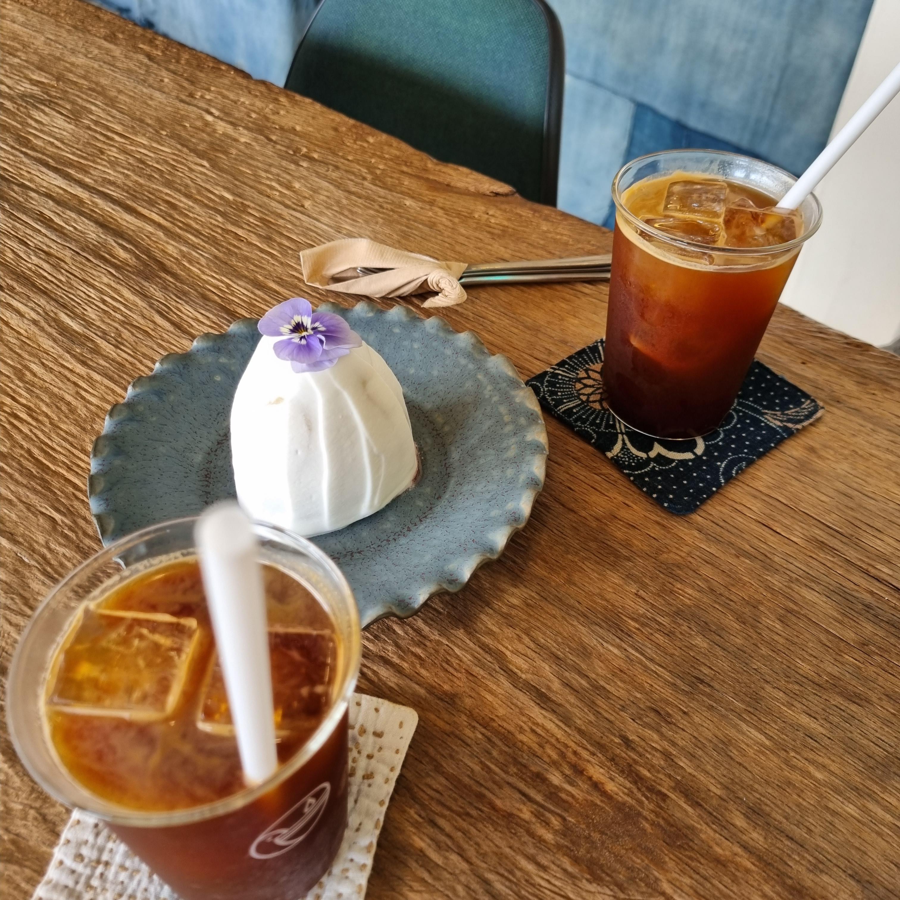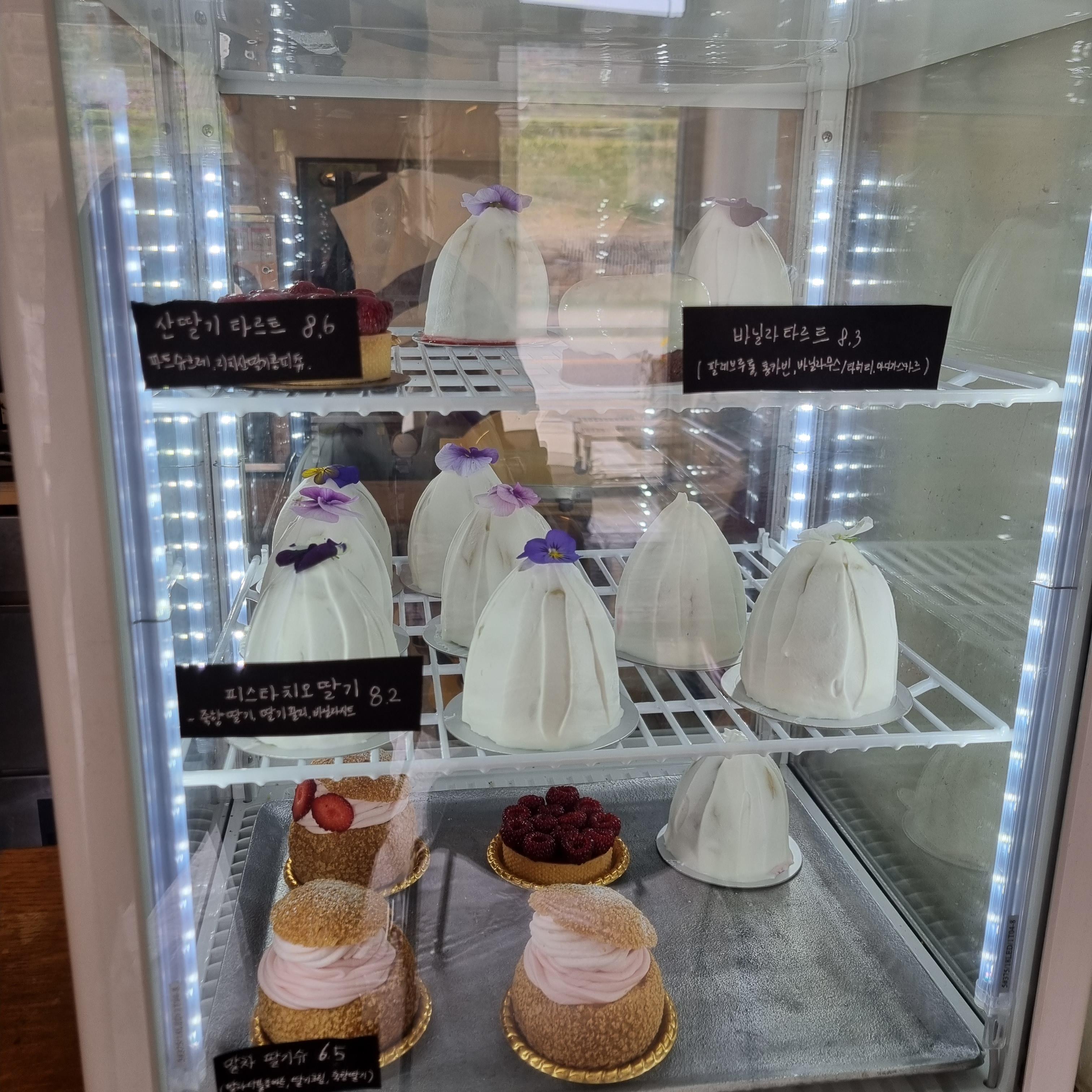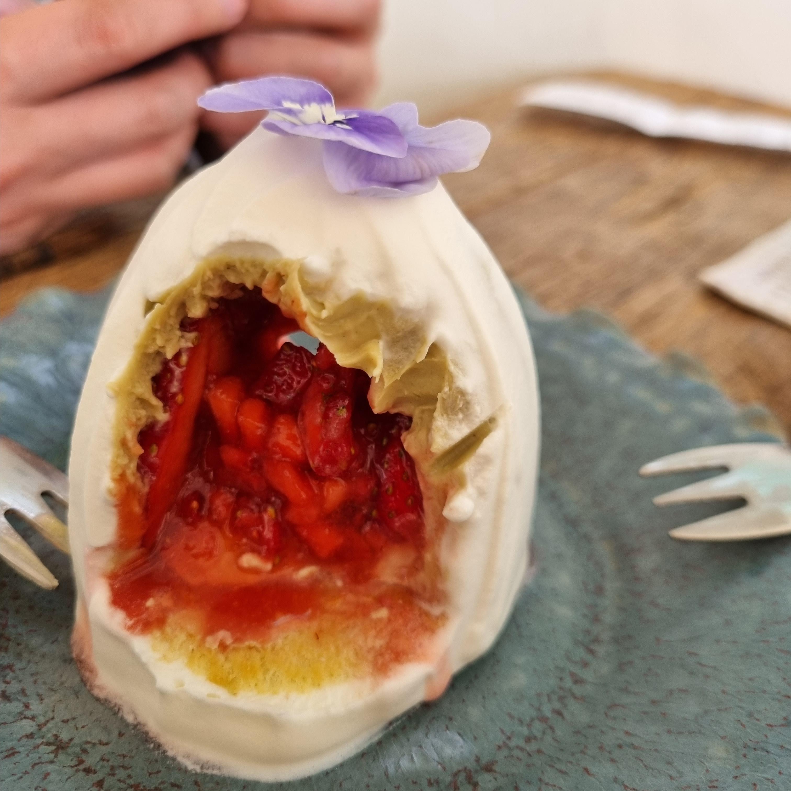 크기는 정말 앙증맞은데 맛이 있습니다. 보랏빛 식용 꽃이 장식되어 있는데 여쭤보니 보통 안 드신다고 합니다. 꽃 빼고 피스타치오크림 맛을 느끼며 딸기도 먹었습니다.