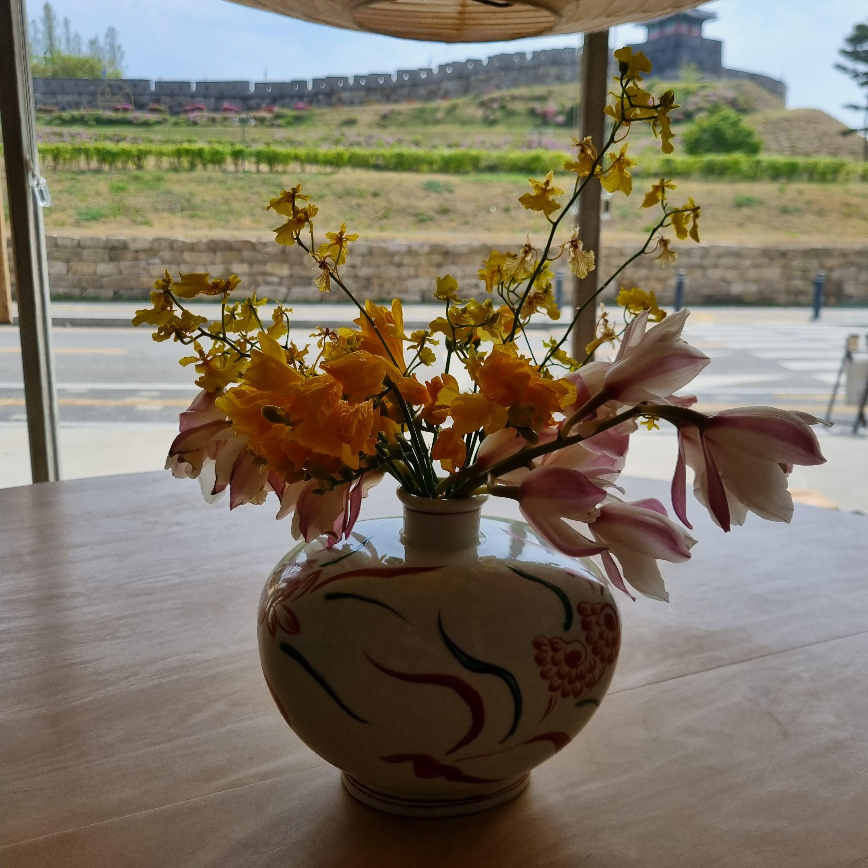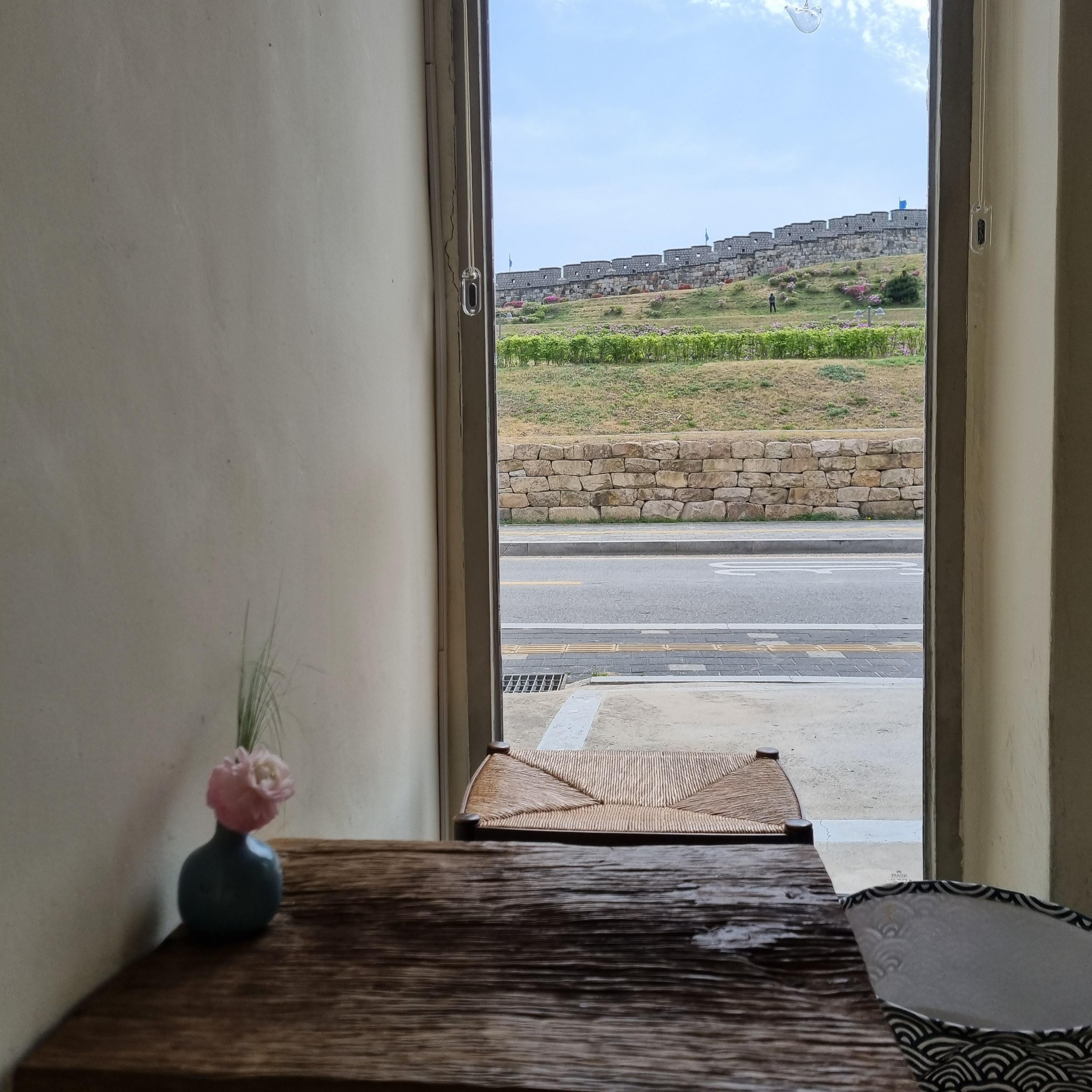 평일 낮이라 그런지 가게는 한적한듯한 느낌이었답니다. 카페로 들어가 보니 인테리어는 심플한 듯 아기자기하게 꾸며두었습니다. 통창으로는 화성행궁이 보입니다. 인테리어가 감각적입니다. 테이블에 꽃병도 놓여있습니다.