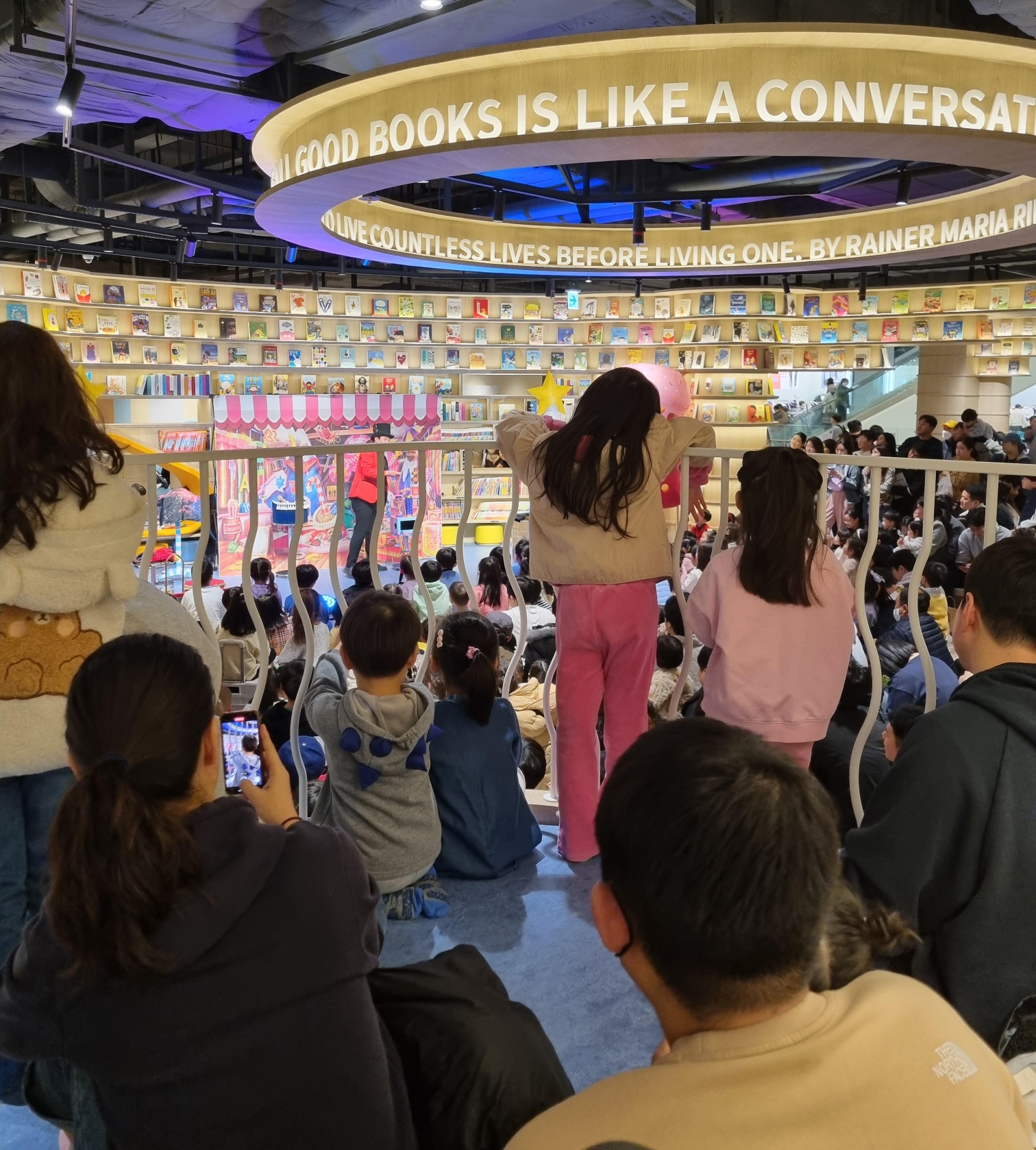 이날은 개장 첫 주말 28일 일요일 오후입니다. 별마당 키즈에는 아이들 책이 빼곡하고 아이들이 책을 읽고 있어요.