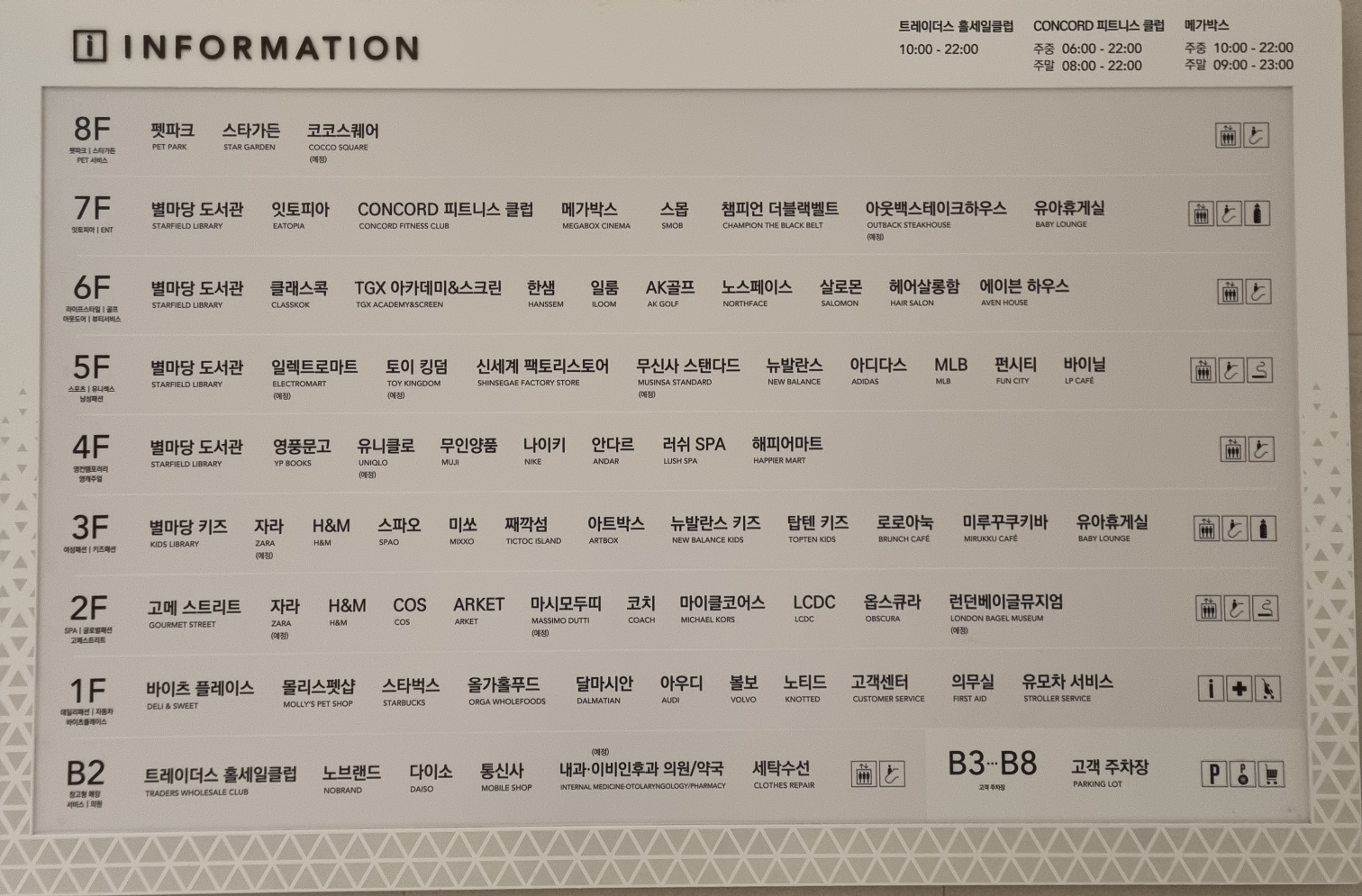 층별 안내입니다. 별마당 키즈는 스타필드 수원 3층에 있습니다.