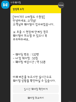 토요일 점심 피크시간이 조금 지난 낮이었는데 매장 앞에서 등록하고 약 한 시간 기다렸어요. 카톡으로 대기시간이 얼마나 남았는지 확인도 되고, 차례가 되었다고 알려주기도 합니다.