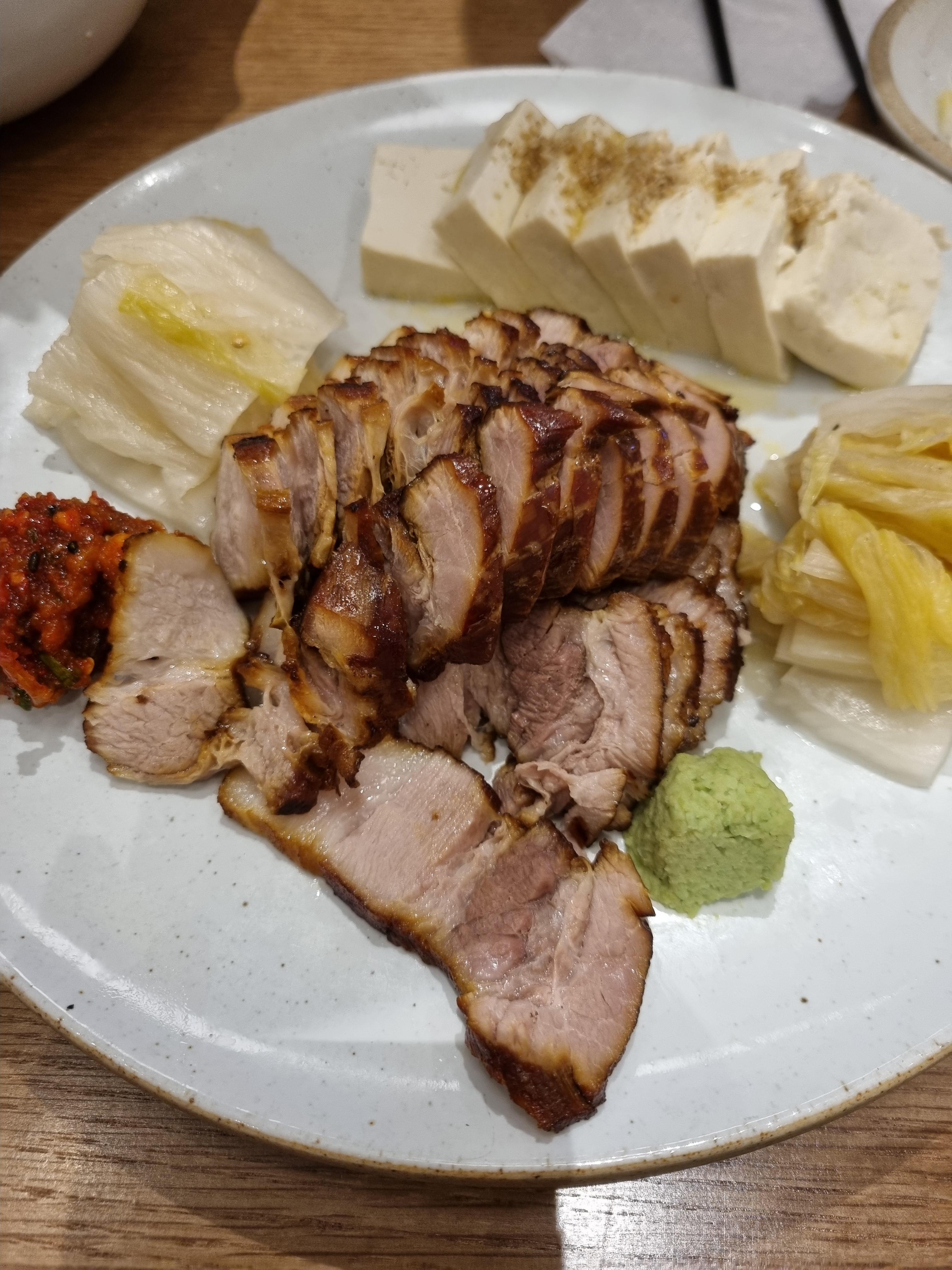 묵은지두부삼겹수육은 아는 맛입니다. 백김치를 많이 주니 싸 먹기 좋았습니다. 고추냉이는 어떤 메뉴에서도 빠지지 않습니다. 보쌈무김치 대신 빨간 소스를 주었는데 다져져 있는 느낌이었고 조금씩 얹어 먹었습니다.