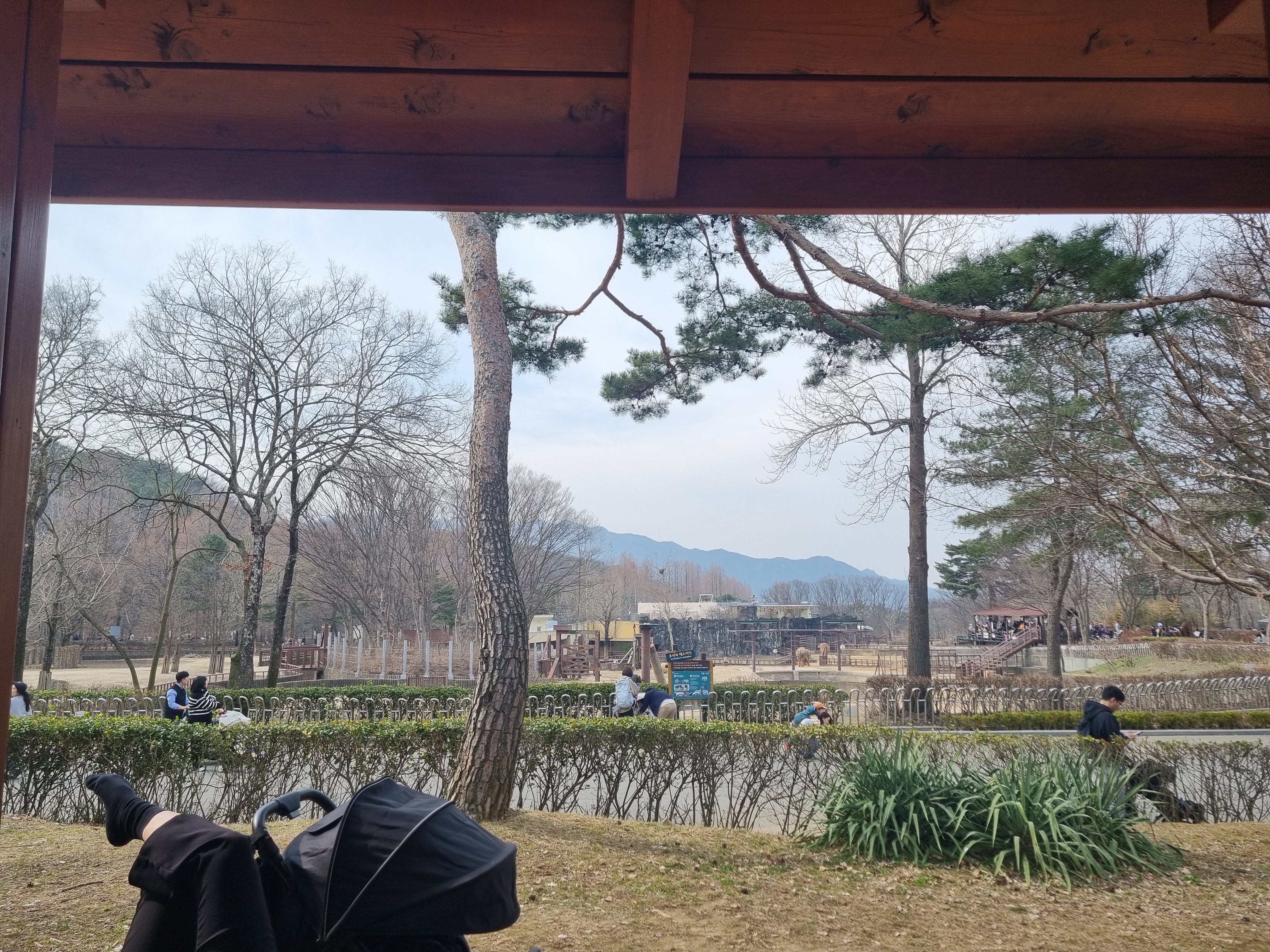 아이도 저도 지쳤습니다. 저 멀리 코끼리가 보입니다. 힘들어서 정자에 앉았어요.