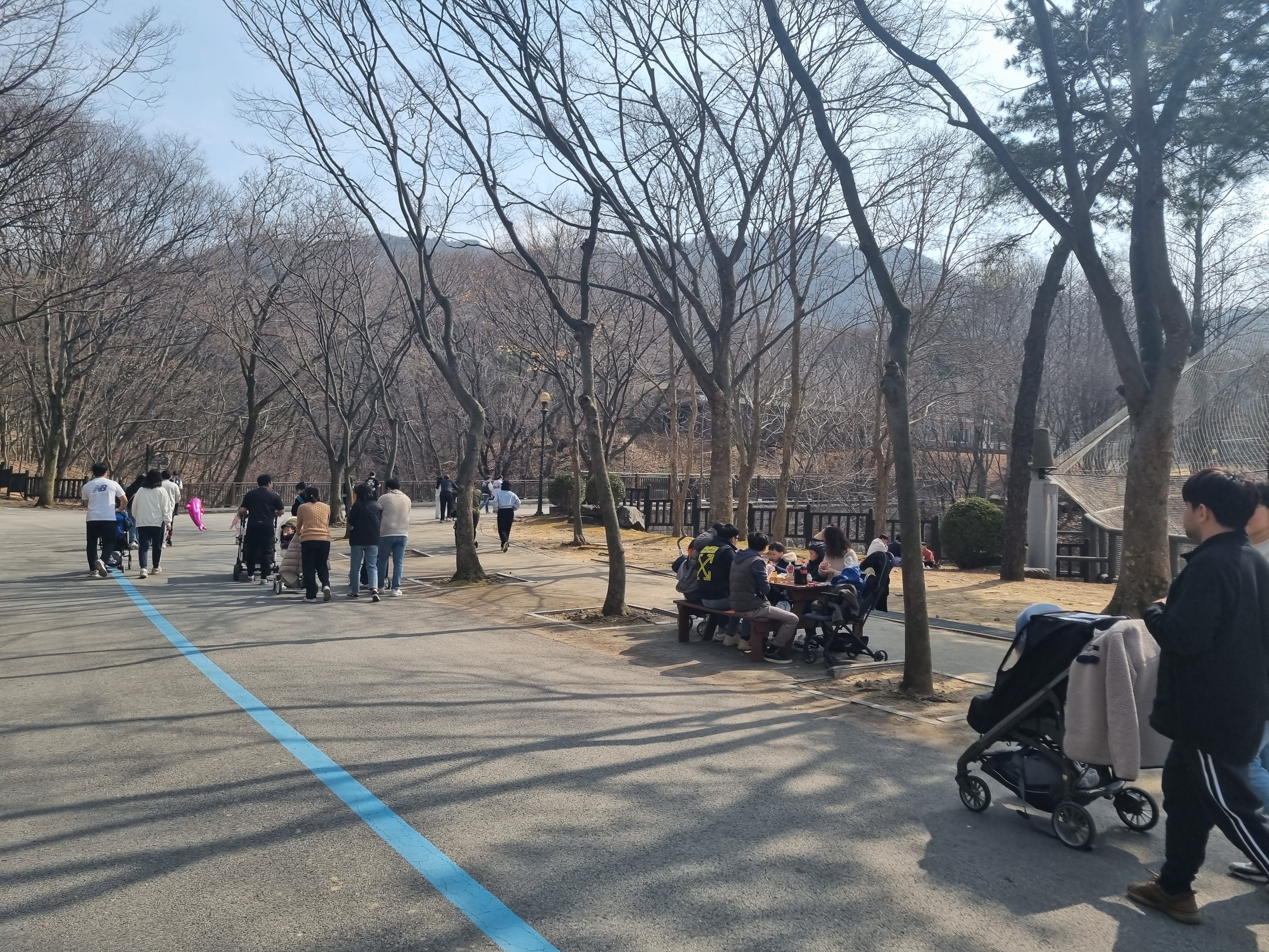 이동해 봅니다. 날이 따스해 많이 놀러 나온 것 같습니다. 중간중간 테이블이 있어서 챙겨 온 간식이나 도시락 먹기 좋아요.