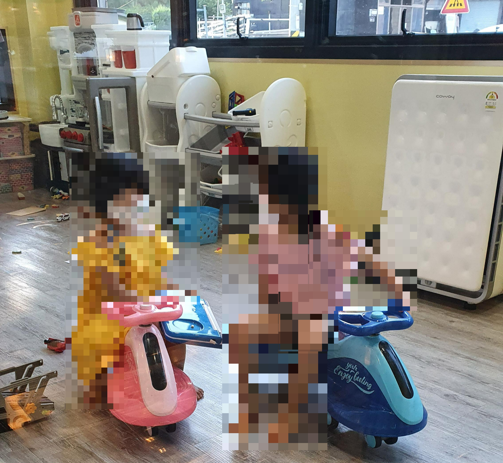 옥상정원에는 안내글이 붙어 있었는데 상주직원이 없으니 보호자를 동반하여 안전사고에 유의하라는 내용이었습니다. 상주직원이 없는 대신에 보호자가 지켜볼 수 있는 의자와 소파가 구비되어 있습니다. 이곳에 앉아 아이들이 노는 모습을 지켜보았습니다.