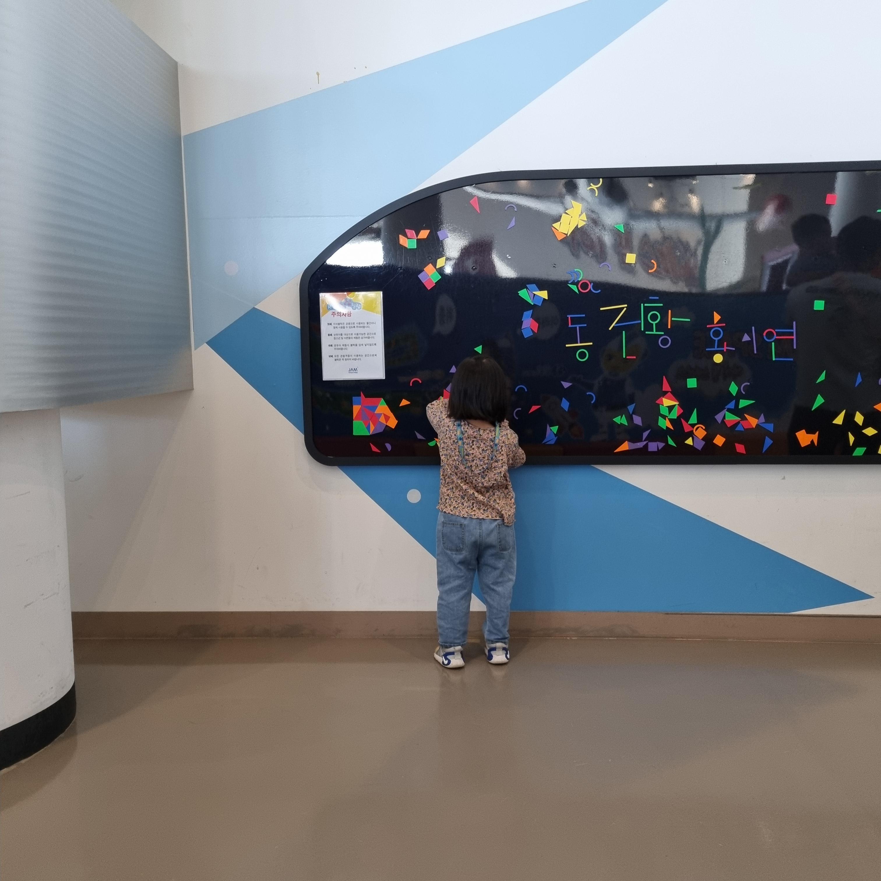 아이 잼 스페이스 앞에는 Kids 상상칠판이 부착되어 있습니다. 다양한 모양의 자석을 칠판에 붙였다 뗐다할 수 있는 공간입니다. 의자도 없는 공간인데 어린이들이 서서 이 모양, 저 모양을 만들고 있었습니다. 저도 한참이나 서 있었답니다.
