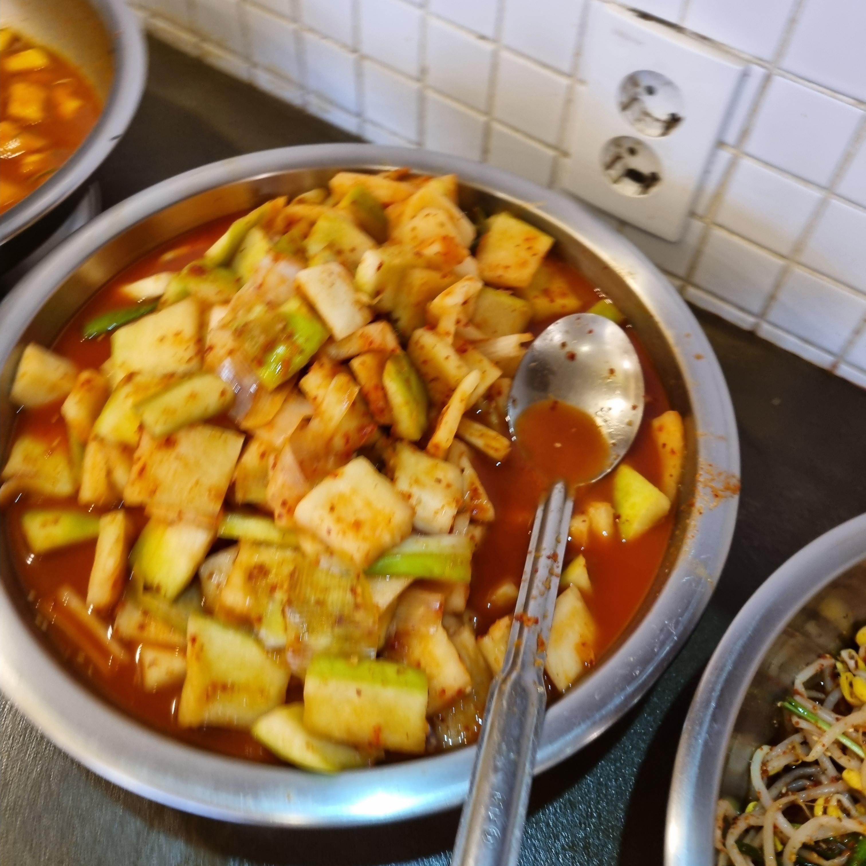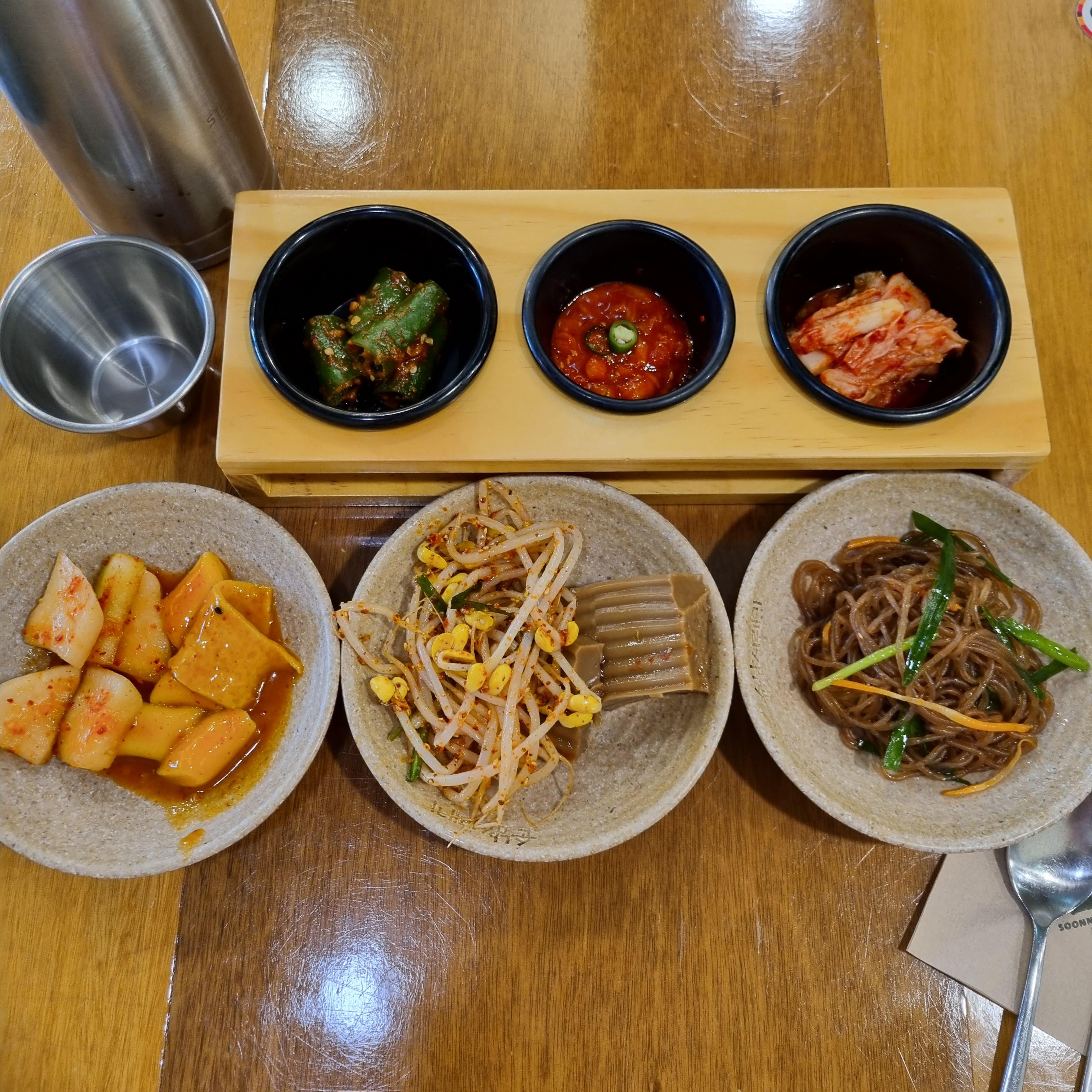 기본 세팅 반찬으로 오이고추 무침, 오징어 젓갈, 배추김치가 제공됩니다. 여러 다른 매장에서도 식사해보았지만 순남시래기는 기본 밑반찬과 셀프바 메뉴가 동일한 것 같습니다. 기본 반찬 외에는 셀프바에서 직접 골라 취향껏 먹으면 됩니다.