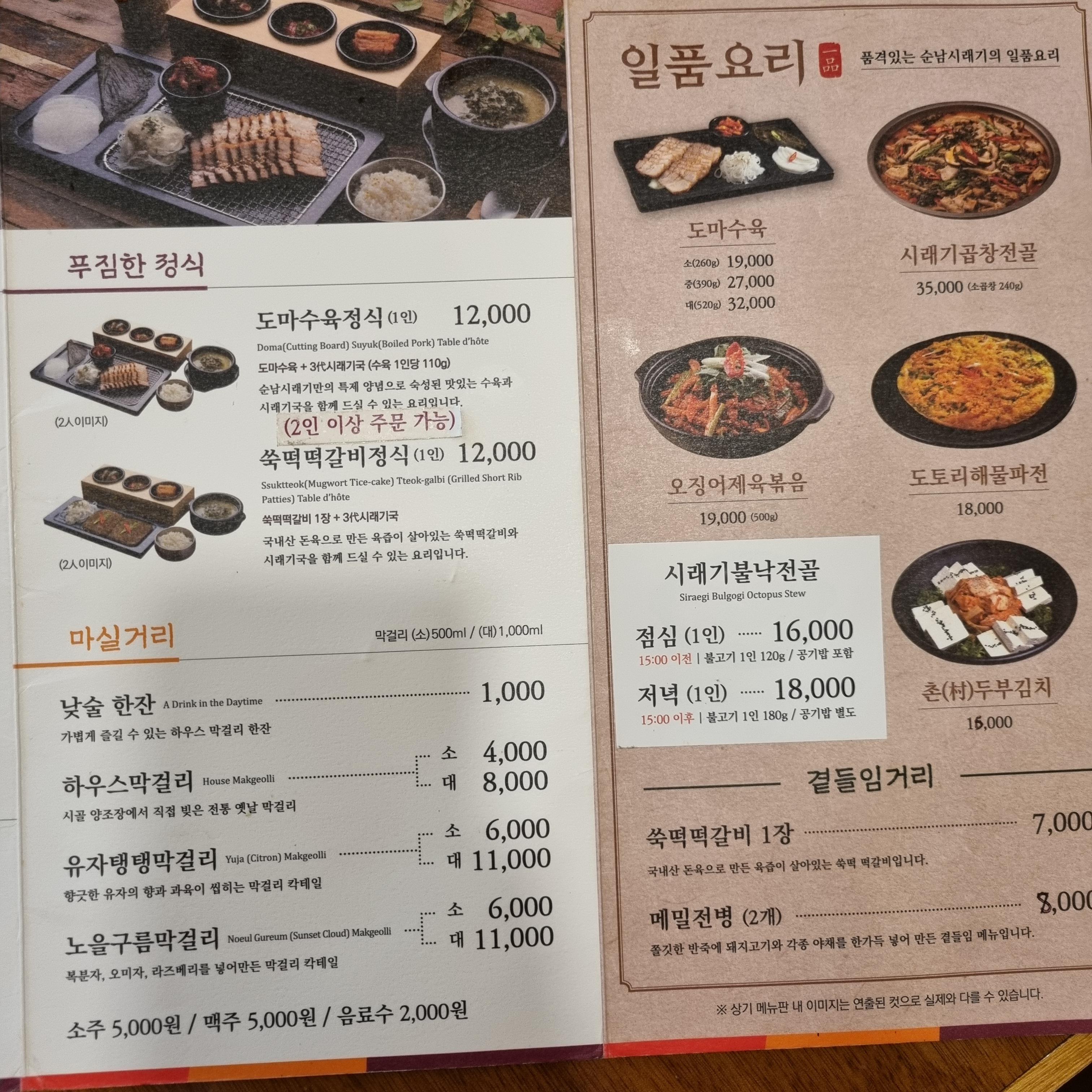 메뉴판을 보면 마실거리가 소개되어 있는데 순남시래기는 낮술도 한잔씩 팔아서 반주 곁들이는 분들도 있으시더라고요.