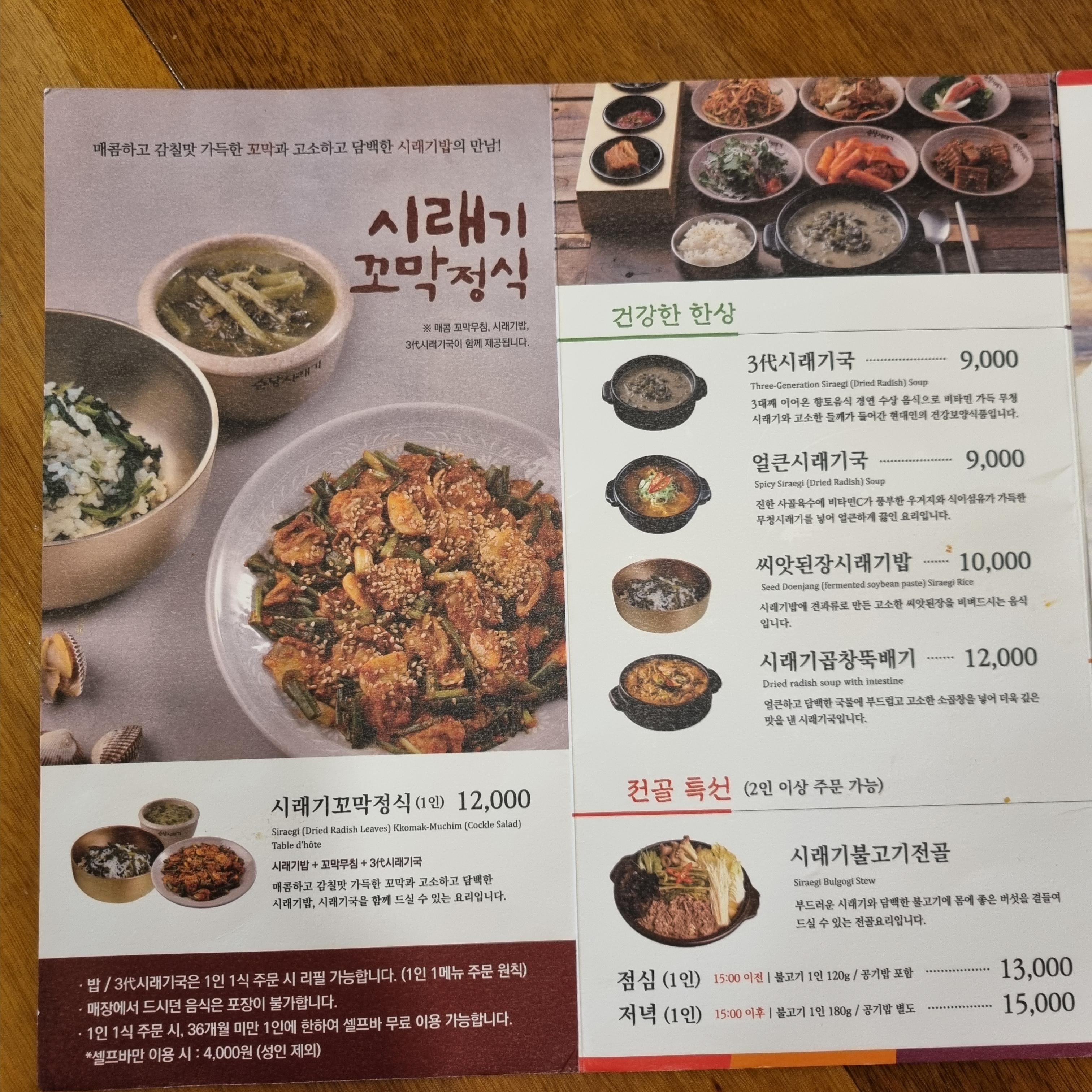 기본 메뉴인 3대 시래기국은 9,000원입니다. 밥과 기본 반찬과 함께 시래기국이 제공됩니다. 셀프바에서 반찬을 더 가져다 먹을 수 있습니다. 저는 도마수육정식도 먹어보고 싶었지만 2인 이상 주문 가능한 메뉴라서 다음으로 미뤄봅니다. 일행과 함께 온다면 도전해보고 싶습니다. 도마수육에도 수육 외에 기본인 시래기국이 함께 나오는데 가격이 12,000원이면 괜찮을 것 같습니다.
