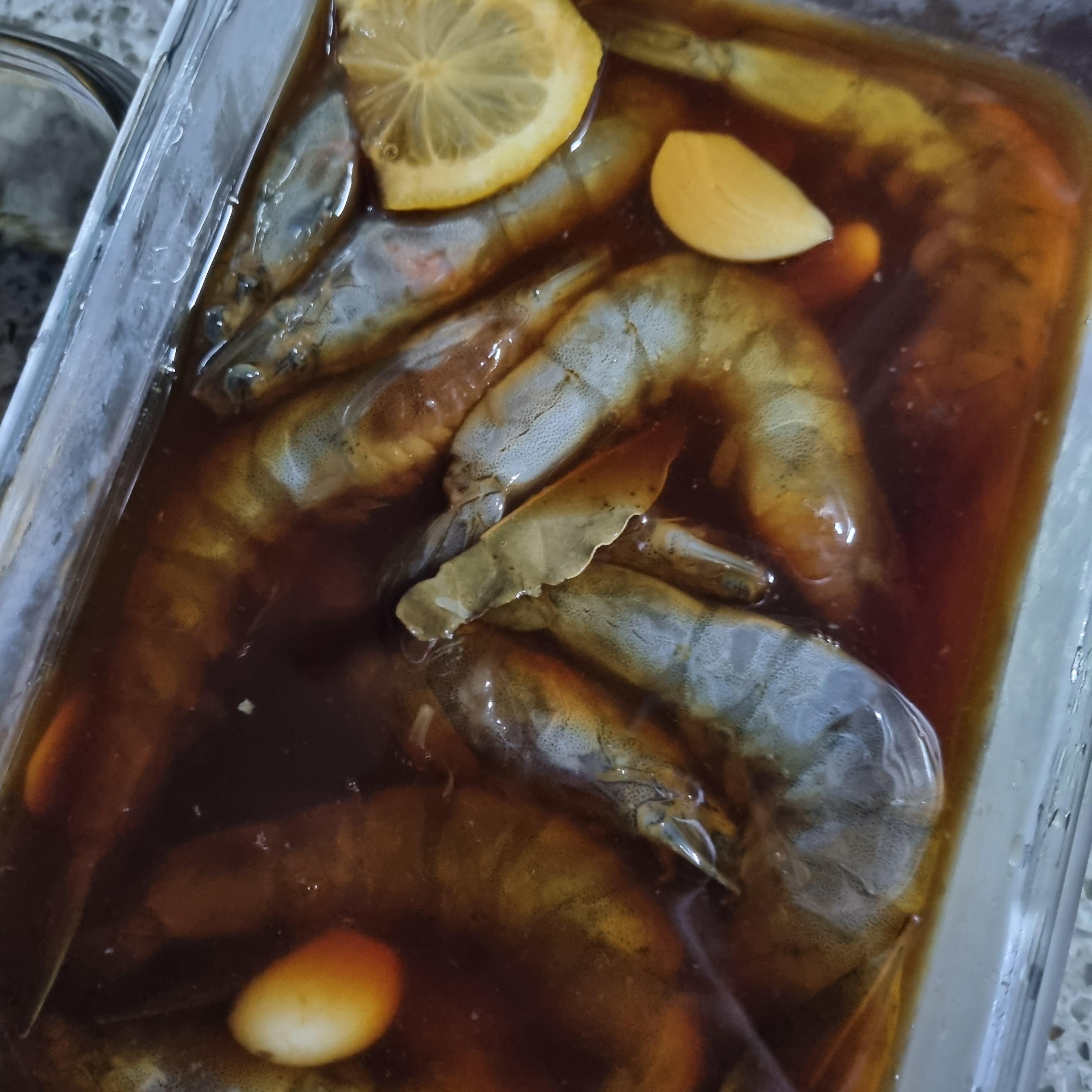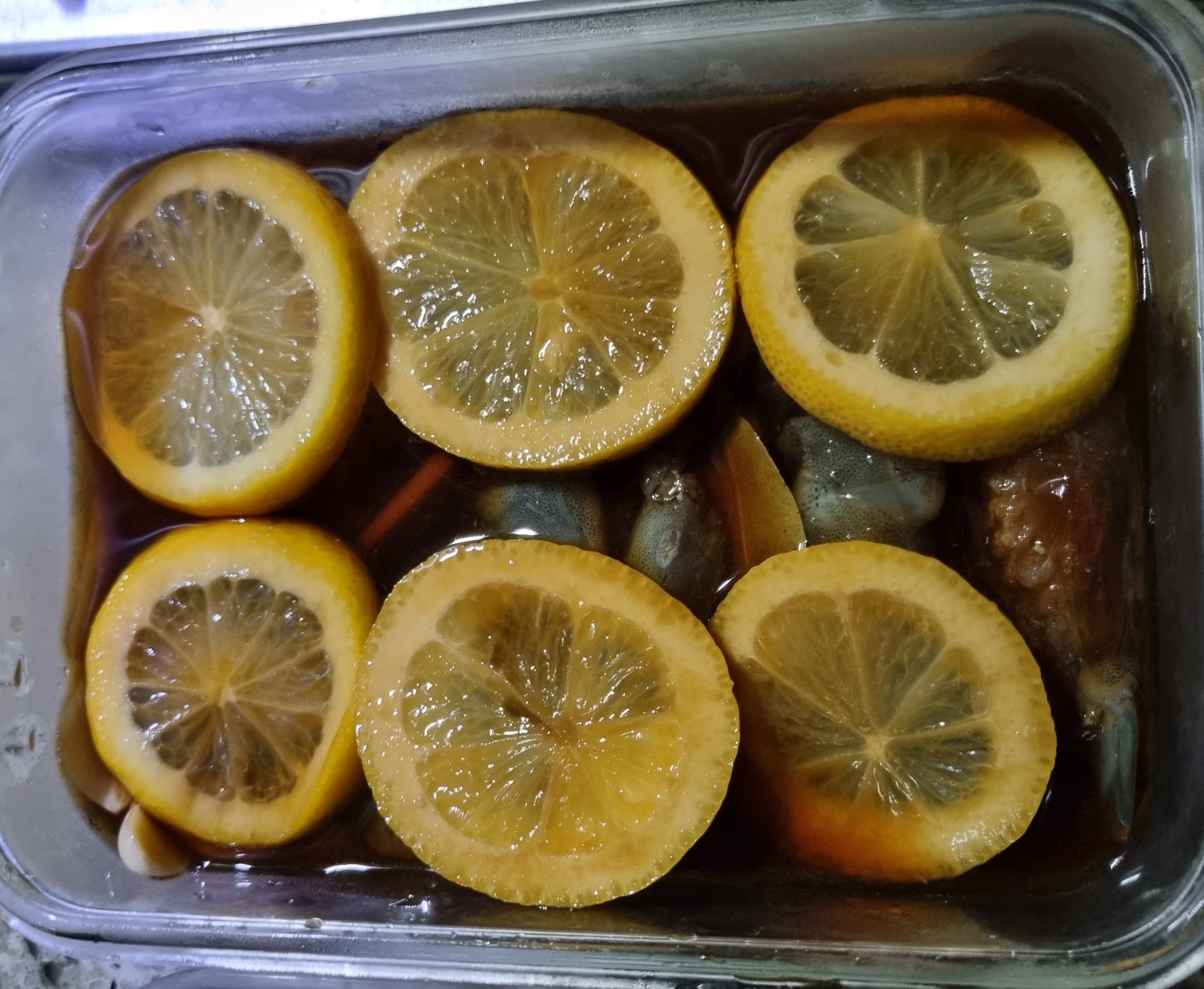 9. 새우가 간장물에 잠기도록 그릇에 부어주었어요. 그리고 레몬을 편 썰어서 쓴 맛 나는 씨는 빼고 새우 위에 이불을 덮었답니다.