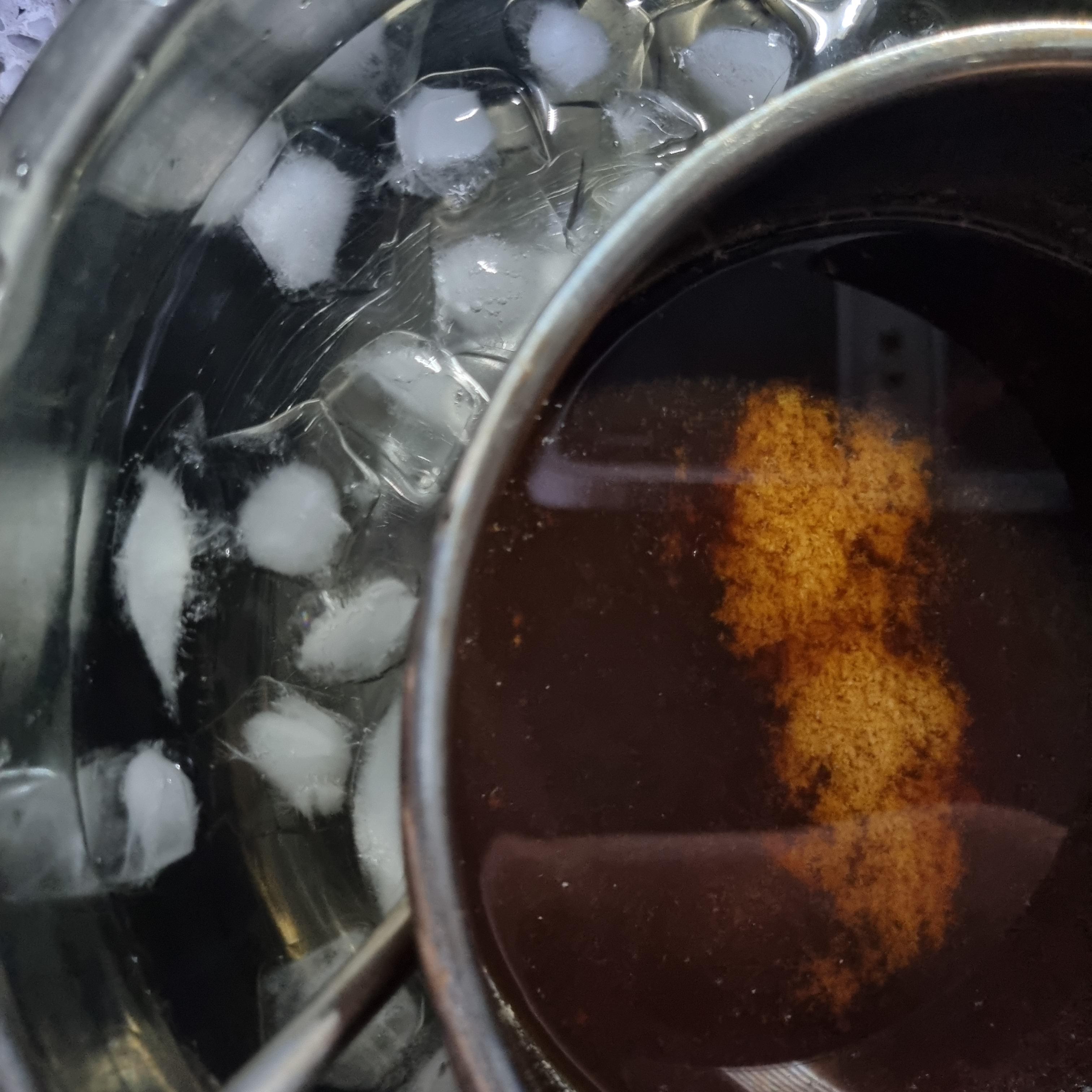 3. 끓여낸 간장육수는 차갑게 식혀줍니다. 열기가 있으면 새우가 익기 때문에 저는 얼음냉수에 냄비채 넣어줬어요. 저는 새우가 배달 올 때 얼음 속에 파묻혀 오니까 배송 올 때 온 얼음을 사용했어요.