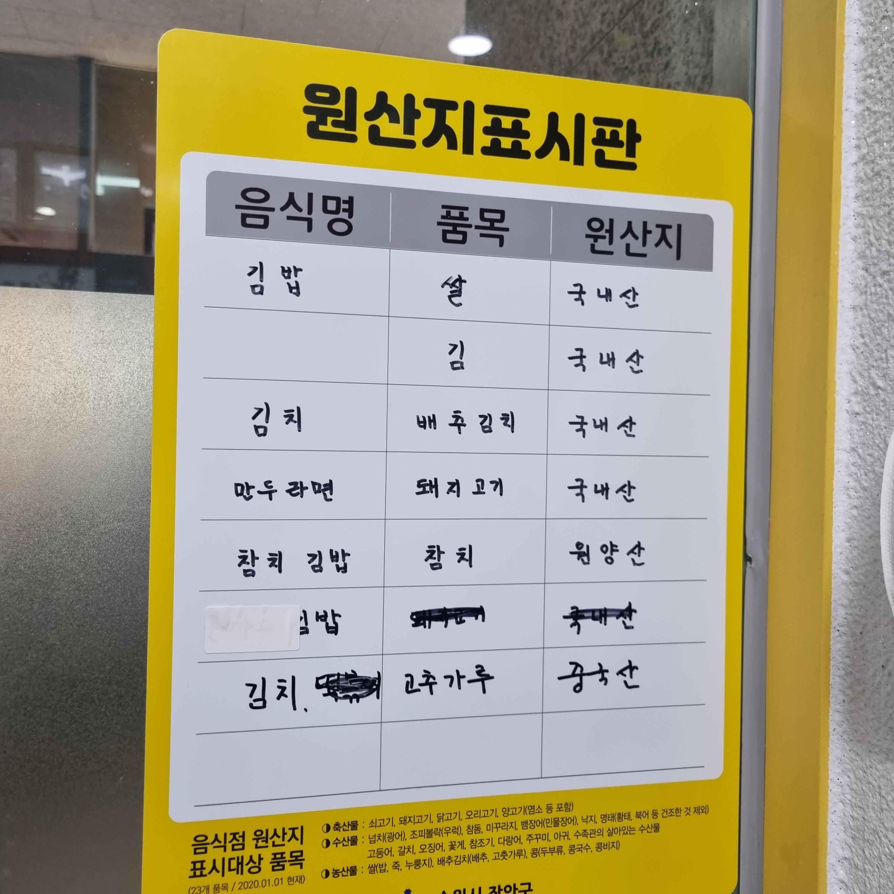 블로그를 쓸까 하여 사진을 좀 찍으려 보니 원산지 표지판이 있더라고요. 대부분 국내산이고 참치는 원양산, 김치와 고춧가루는 중국산이네요.