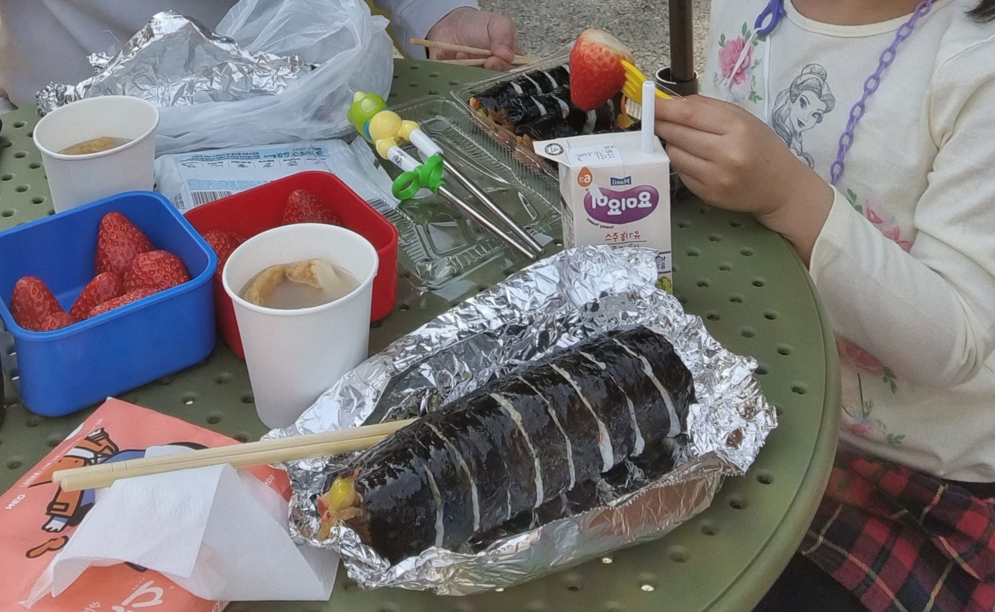저희 애는 주로 치즈꼬마김밥을 먹어요. 꼬마김밥은 다섯 줄이에요. 아이가 먹게 잘라달라고 말씀드리면 꼬마김밥을 작게 잘라주셔서 먹는데 어려움이 없어요.