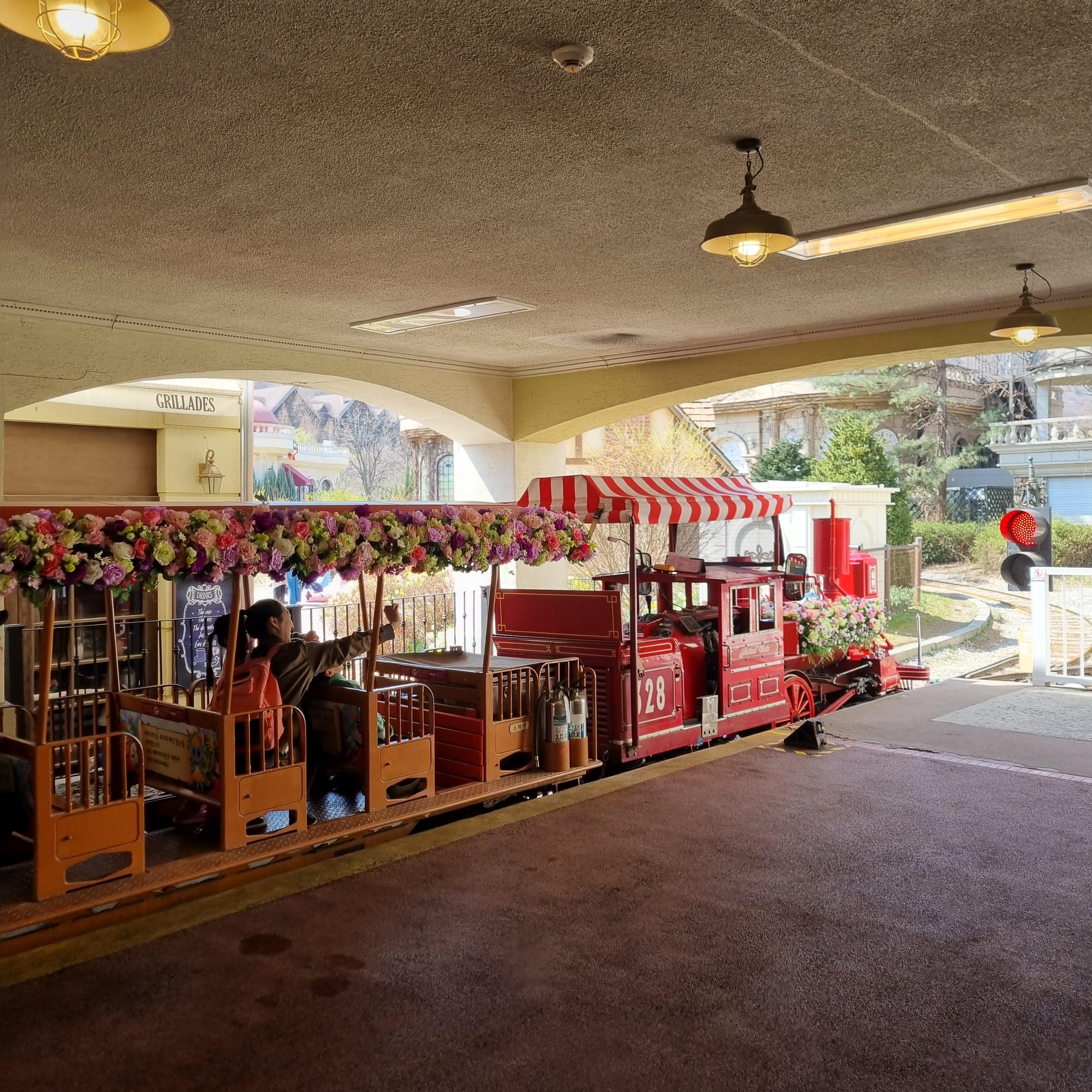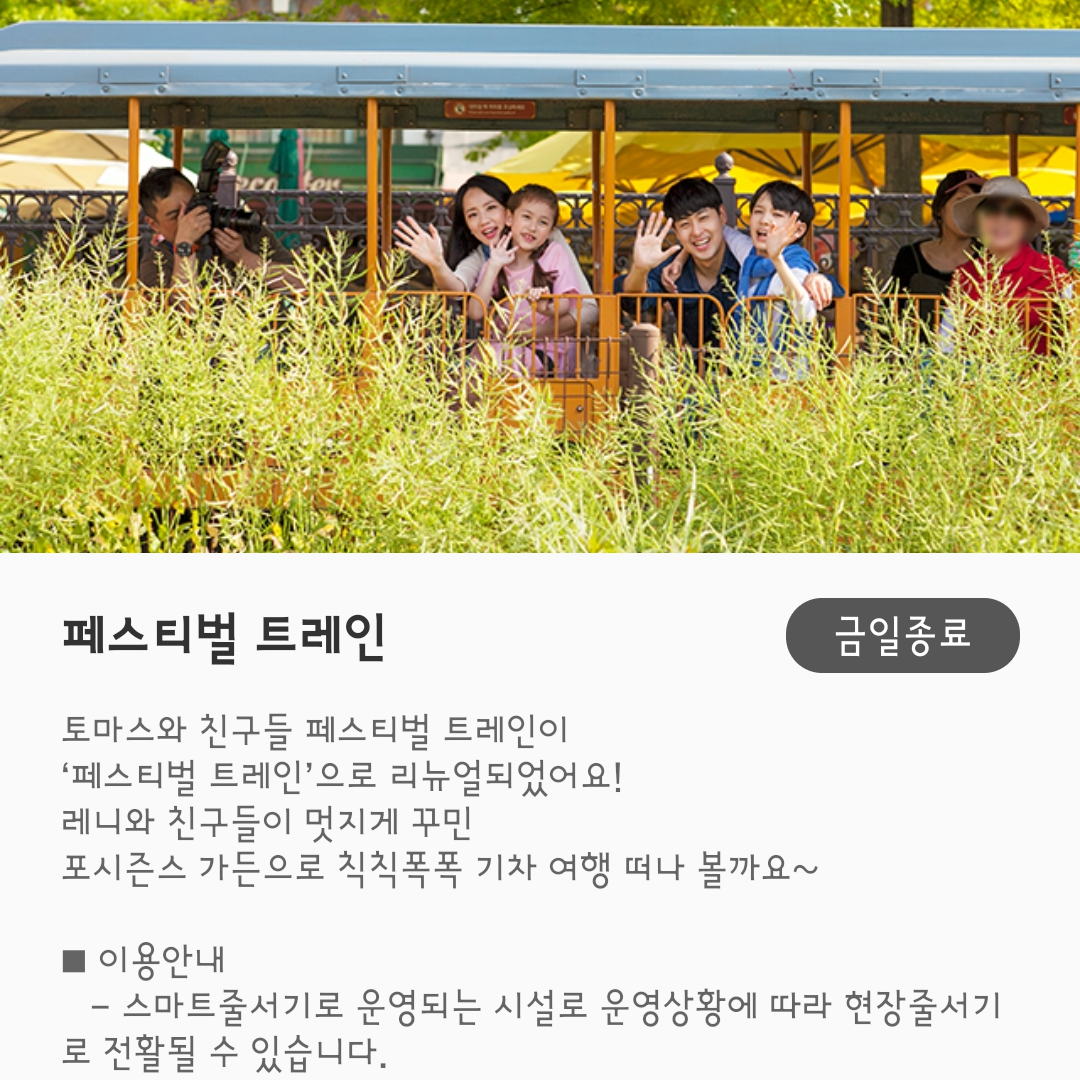 들어오자마자 스마트 줄 서기 잊지 마세요. 입장 직전에 레이싱 코스터가 남아 있었는데 입장하자마자 예약 마감으로 예약을 할 수 없었습니다. 결국 남아있던 페스티벌 트레인만 예약했어요. 기차 타고 돌며 정원이라도 돌아봐야겠습니다. 11시 20분 탑승으로 예정되네요. 줄 서서 한참 대기하다가 예약시간보다 15분 정도 늦게 타게 됩니다.