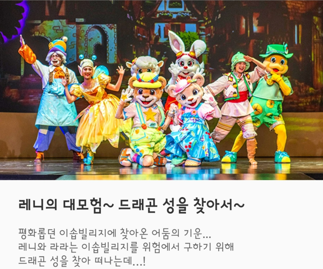 앞서서도 언급했지만 레니의 대모험이라는 공연도 추천합니다. 저희는 오늘 안 봤지만 볼거리가 화려해서 어린이들이 좋아할 거예요. 이것도 예약인원이 한정되어 있어요.