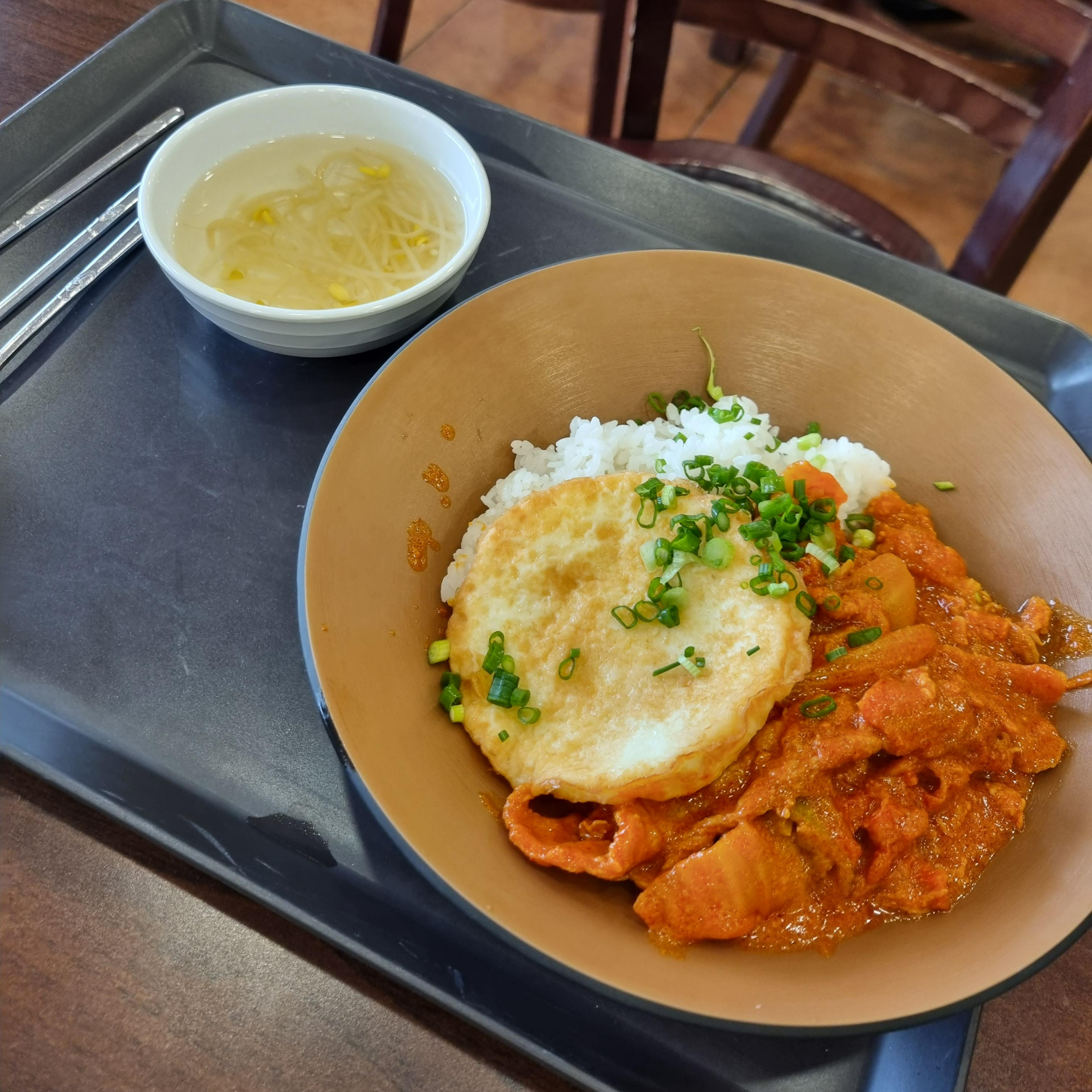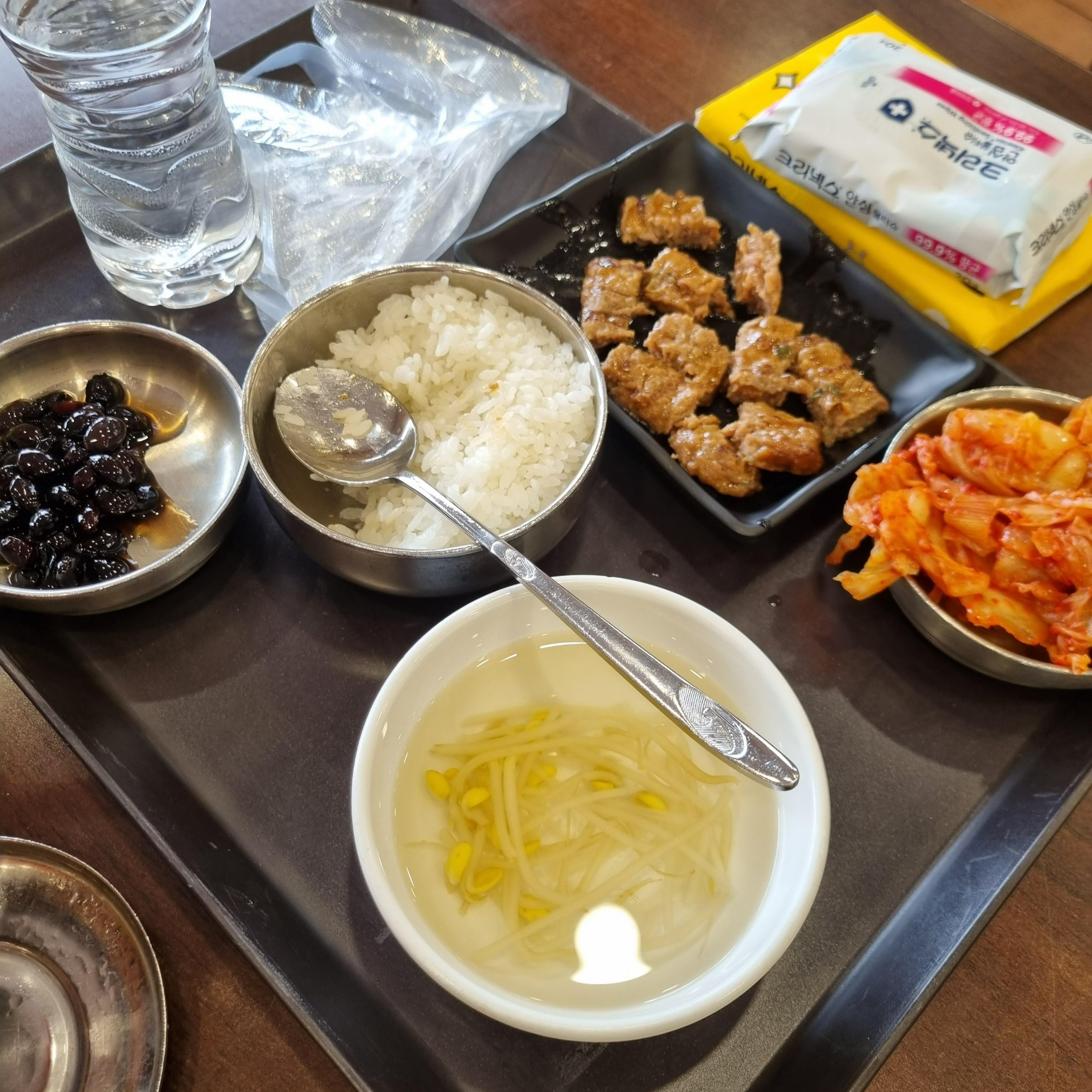 제 입맛에 제육덮밥은 짜고 매웠어요. 자유롭게 가져다 먹을 수 있는 반찬으로 김치랑 콩자반이 비치되어 있었습니다.