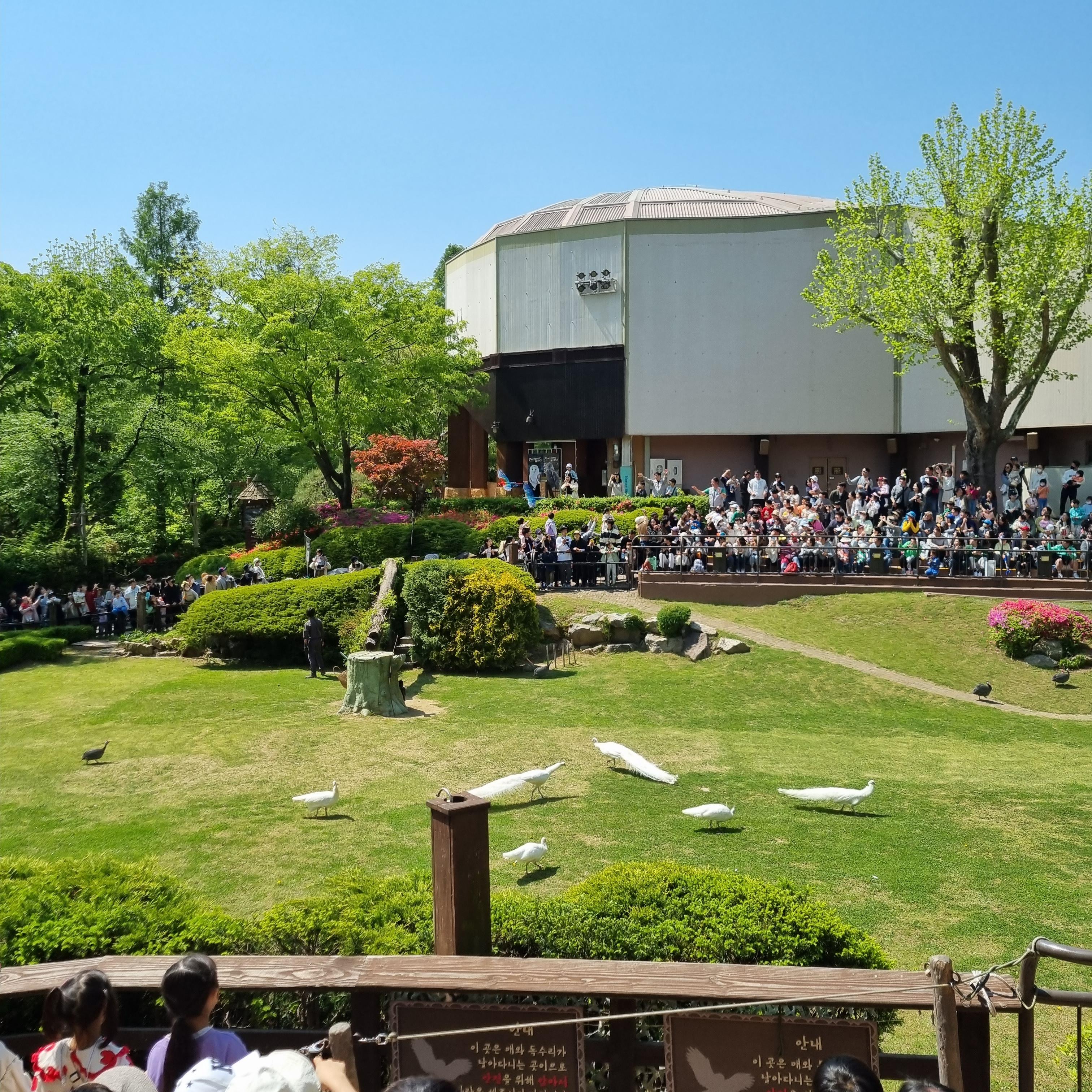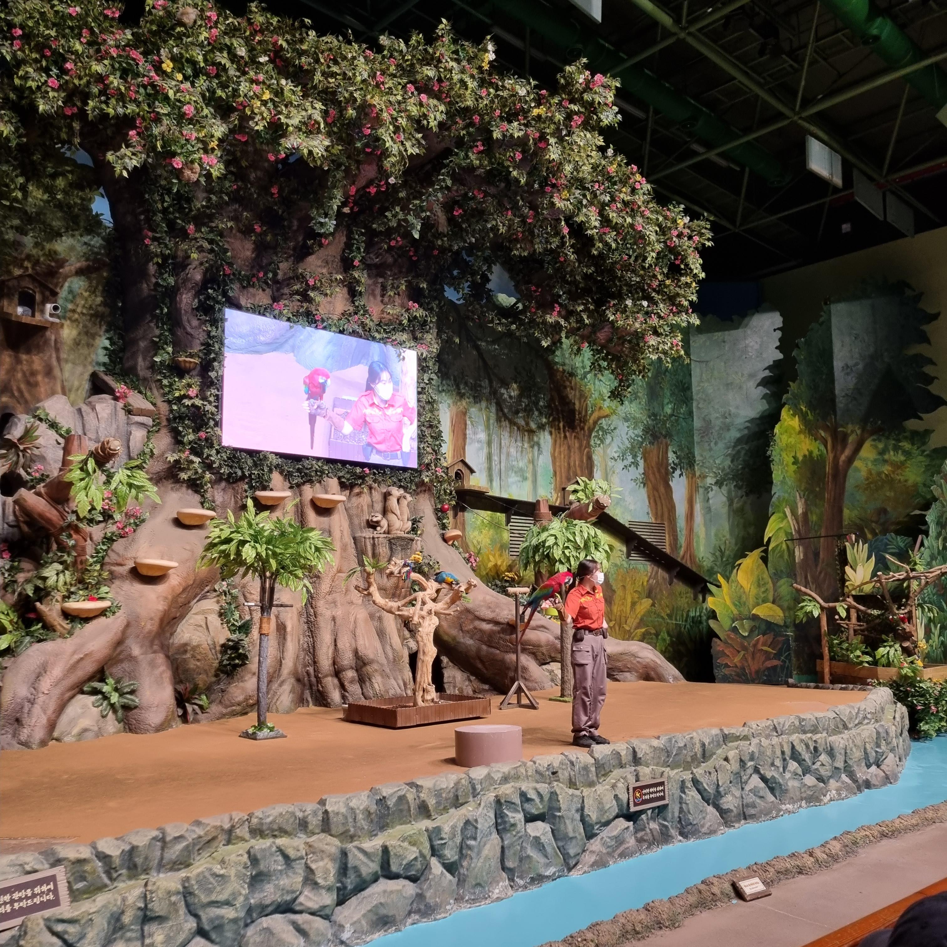 판타스틱 윙스 14시 공연 봤습니다.  슈퍼윙스 애니멀 톡과 다른 스케일이 느껴집니다. 저희가 있던 쪽에서도 새들이 나오고 사진 오른편 나무 사이로도 나오고 들어갑니다.