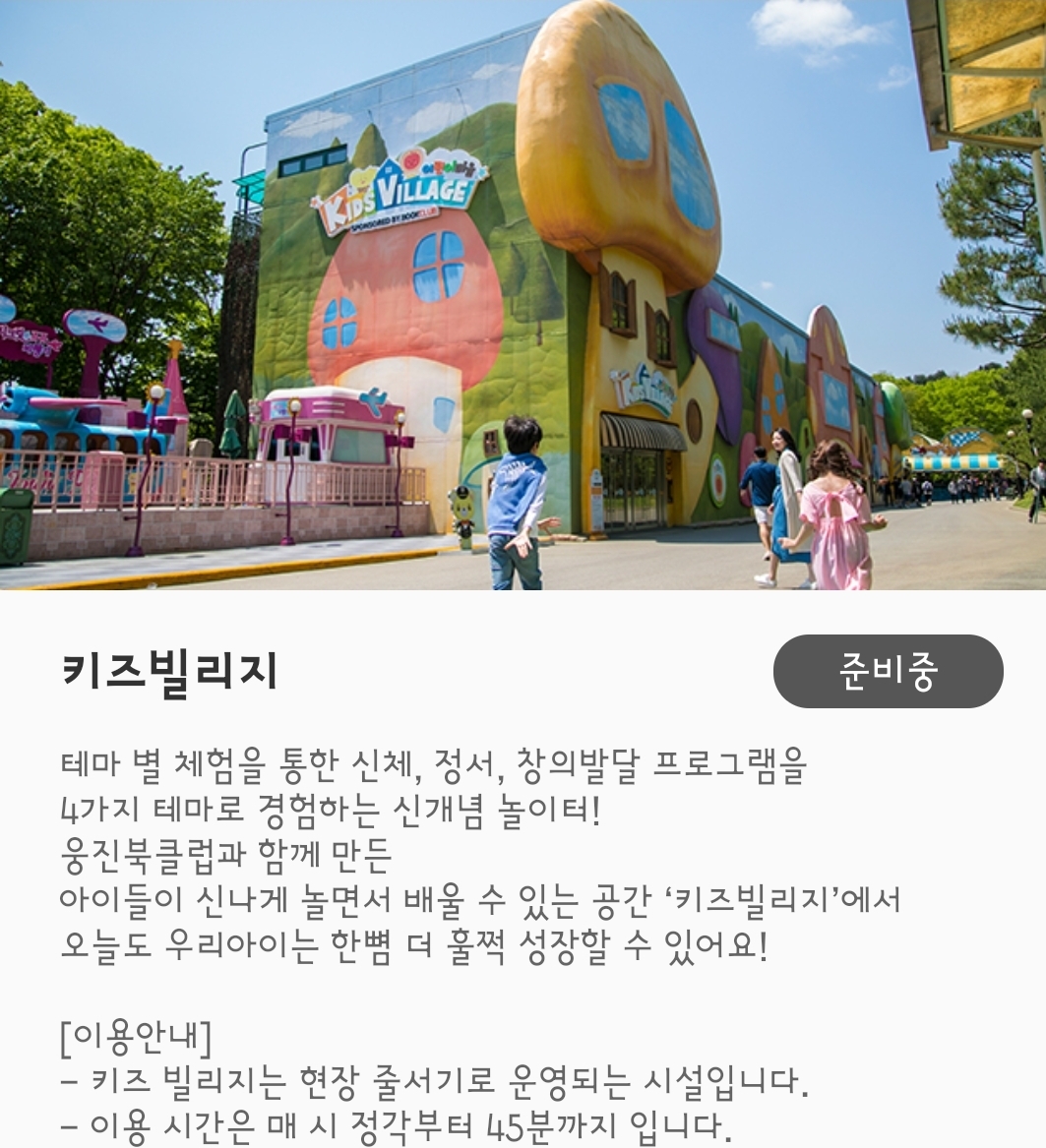 유아를 동반한 가족들은 키즈빌리지에 잠시 쉴 겸 둘러보시는 것도 추천합니다. 웅진북클럽과 함께 만든 실내공간이라 책, 조각퍼즐, 유아용 트럼폴린 등이 소소하게 있습니다.